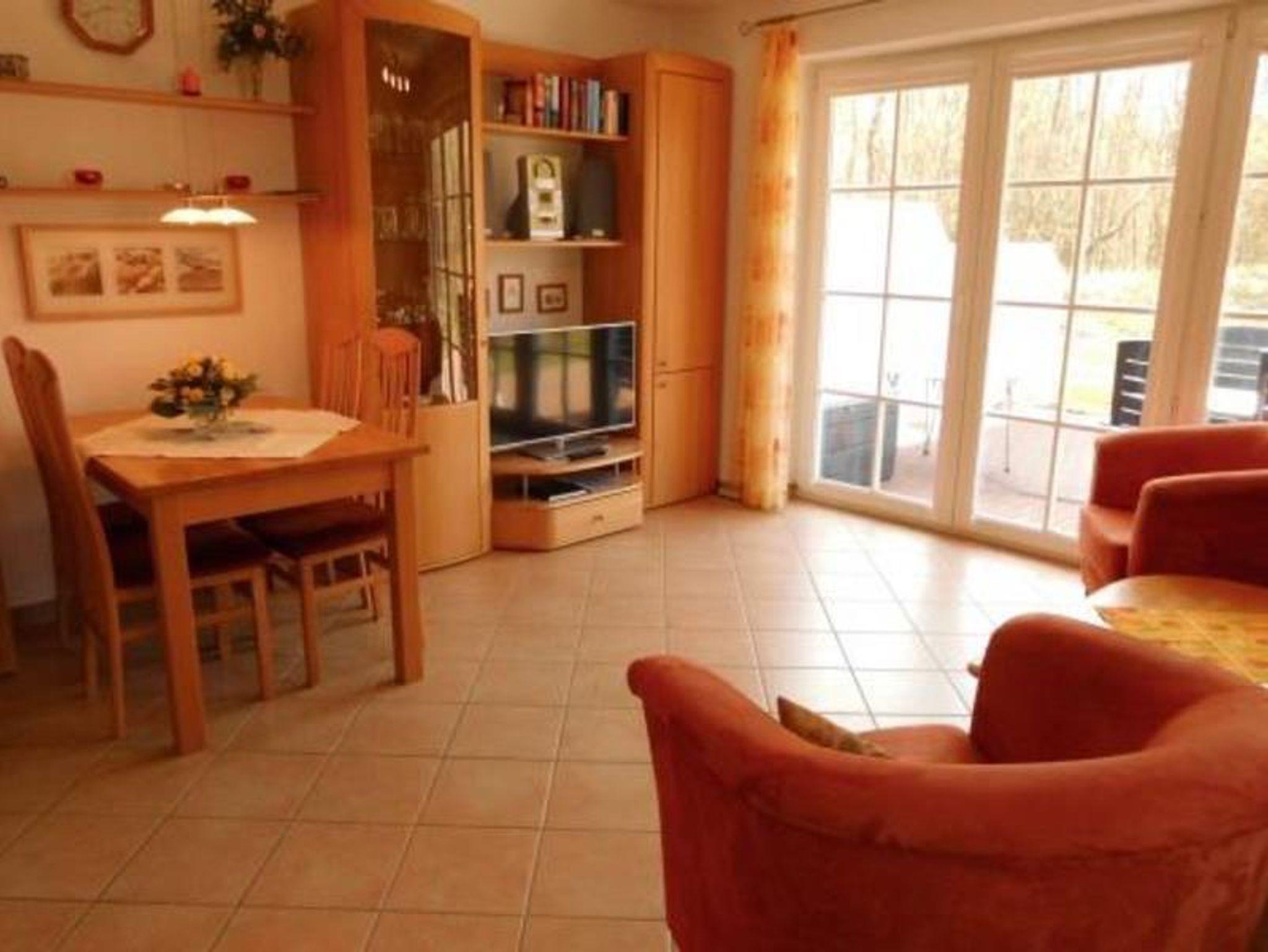 App. Nr. 6 im Erdgeschoß: Flur mit Garderobe. Wohnraum mit Sitzecke (Doppelbettcouch 160x200), Essecke, SAT-TV, Radio. Küchenzeile mit Cerankochfeld, Backofen, Mikrowelle, Geschirrspüler. Schlafraum mit Doppelbett (180x200). Duschbad/WC Möblierte Terrasse. Pkw-Platz Nr. 6 und ein Fahrradkeller