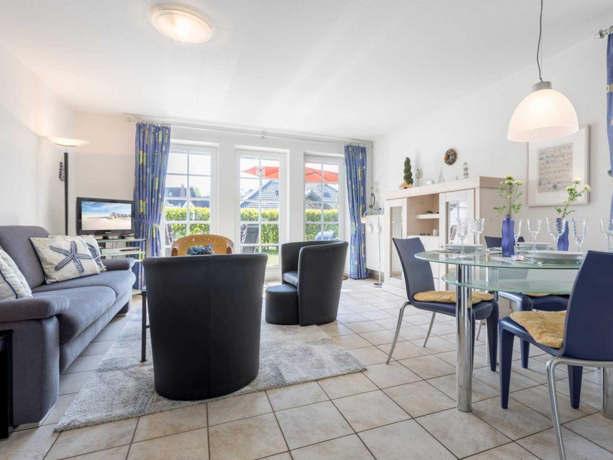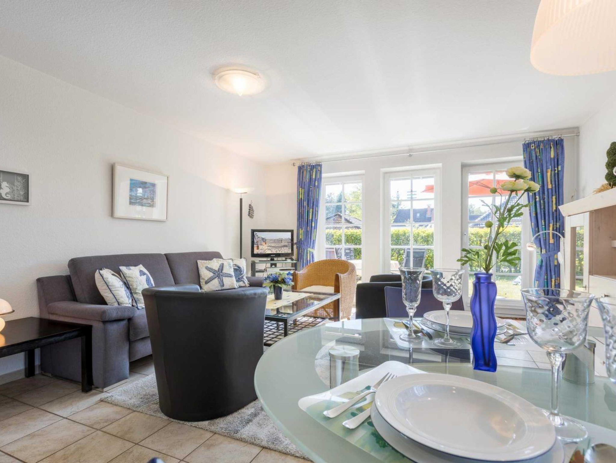 Wohnzimmer mit Sofa, 2 Sesseln, TV (Kabel), DVD-Player, Stereo-Kompaktanlage mit CD-Player und Esstisch mit 4 Stühlen. Direkter Zugang zur sonnigen, möblierten Gartenterrasse nach Süd-Westen. Kenner werden sich über das Fliegengitter in der Terrassentür freuen. Offene Küche mit Backofen, Mikrowelle, Geschirrspüler, Kühlschrank mit Gefrierfach DeLonghi Nespresso Kapsel-Kaffeemaschine.