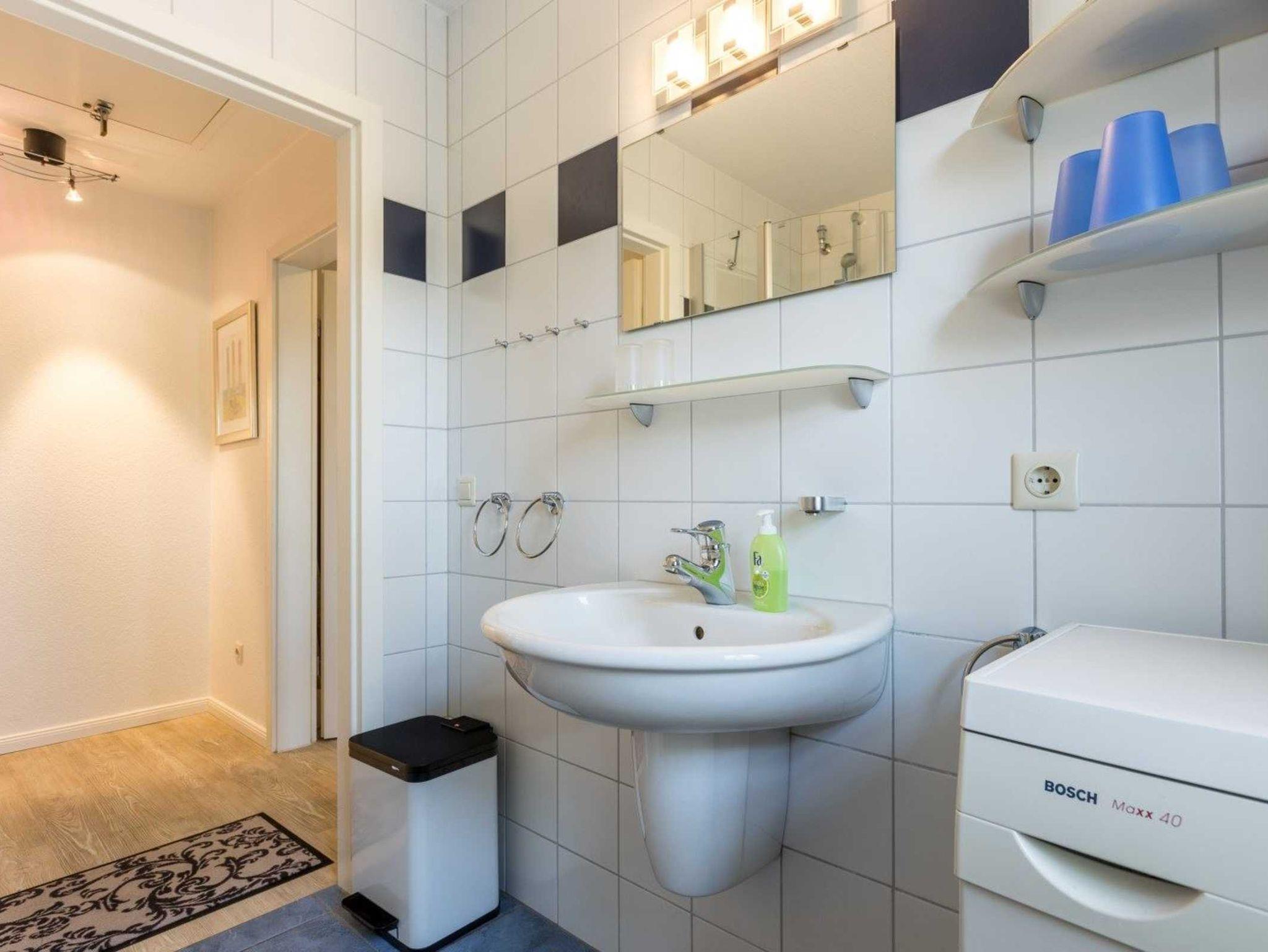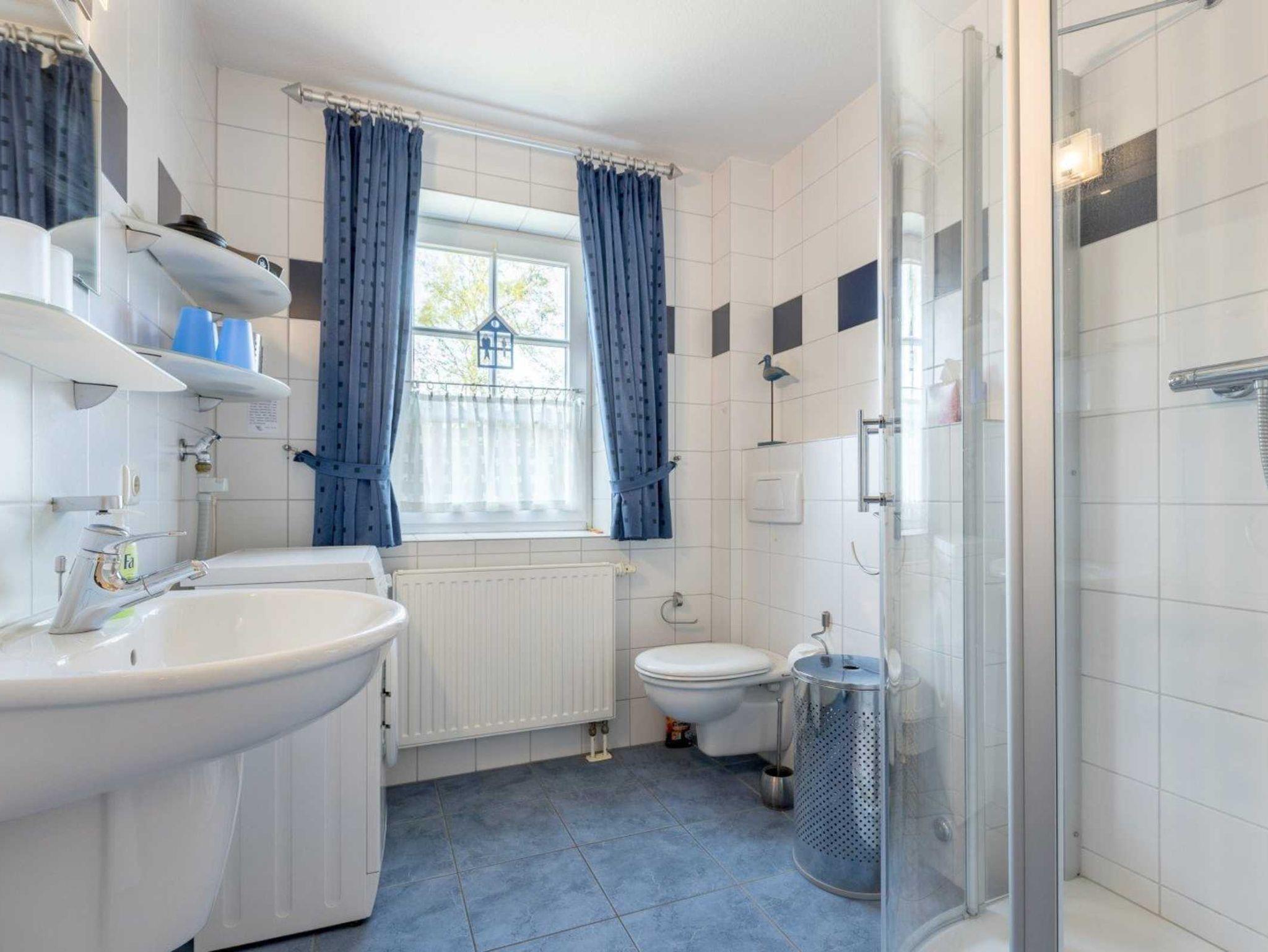 Badezimmer (Duschbad) mit Dusche, WC, Waschmaschine, Tageslicht und Föhn.