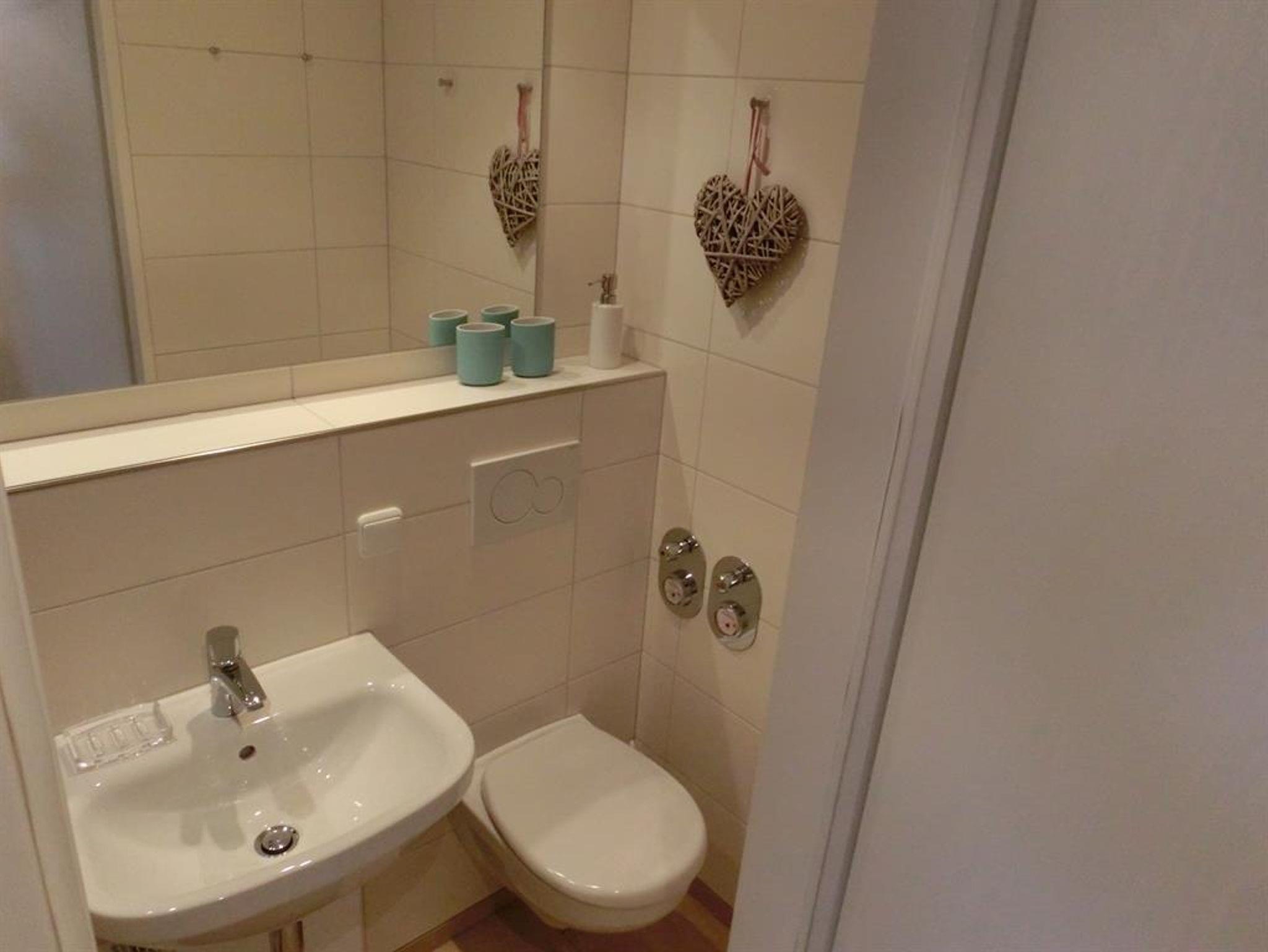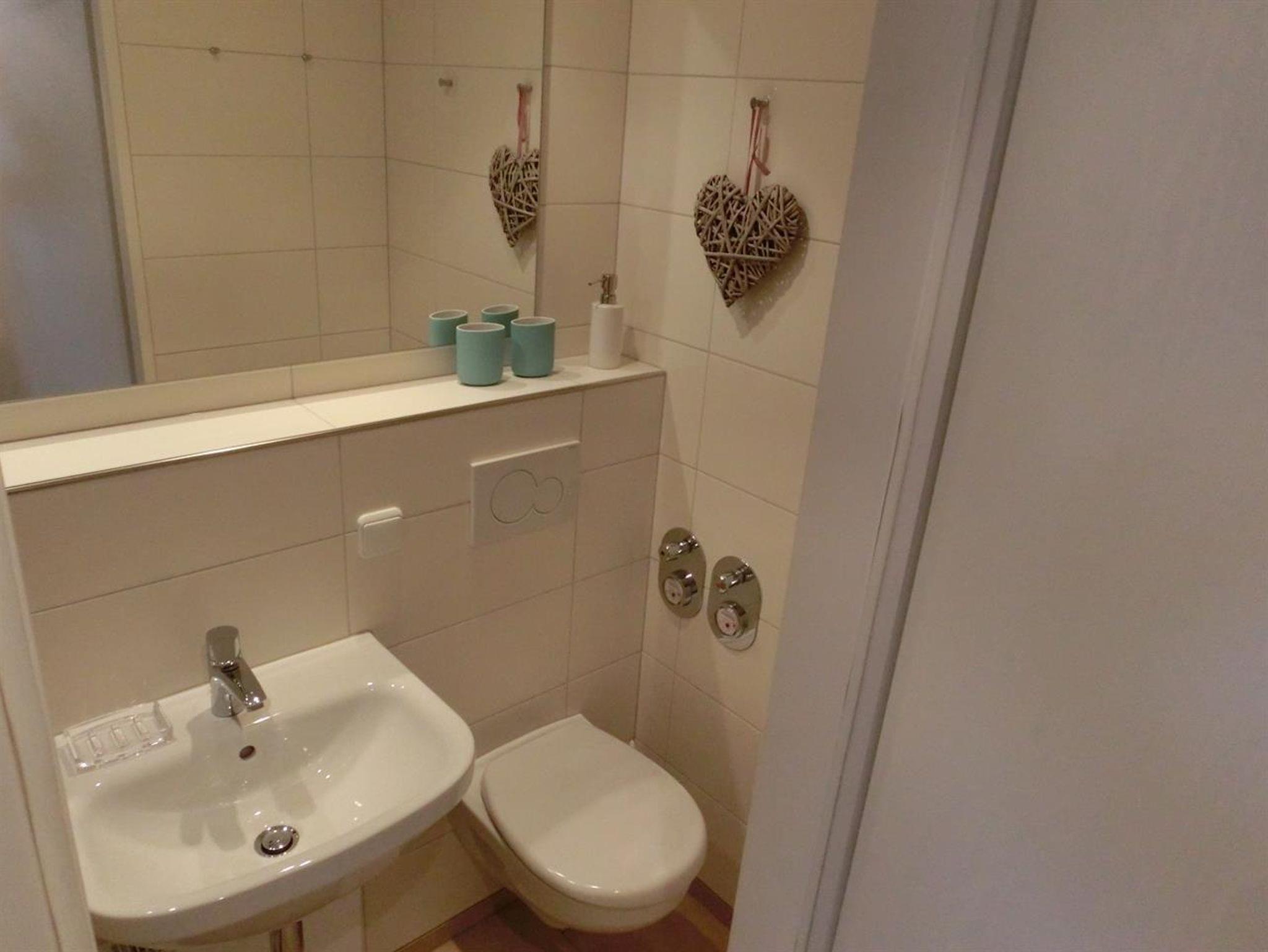 Im Vorraum der Wohnung gibt es eine kleine Küchenzeile mit Kühlschrank (4-Sterne-Gefrierfach) und Ceran-Kochfeld. Außerdem gehört zur Wohnung ein kleines aber hochwertiges Bad mit Dusche.