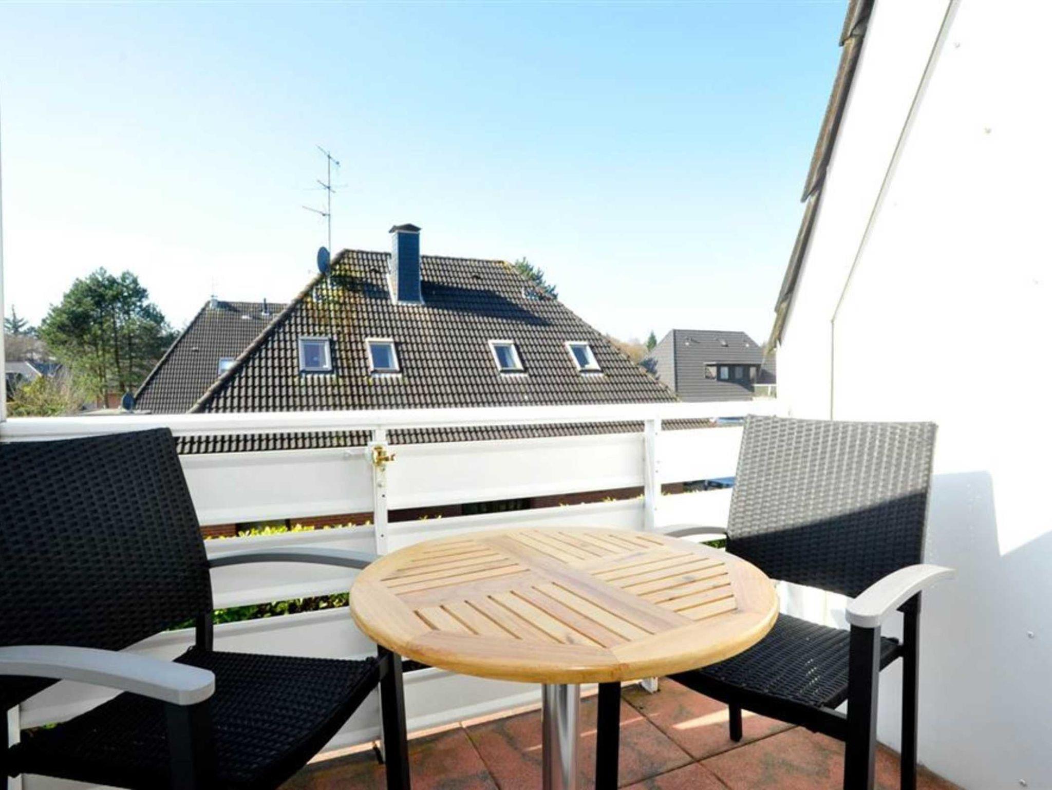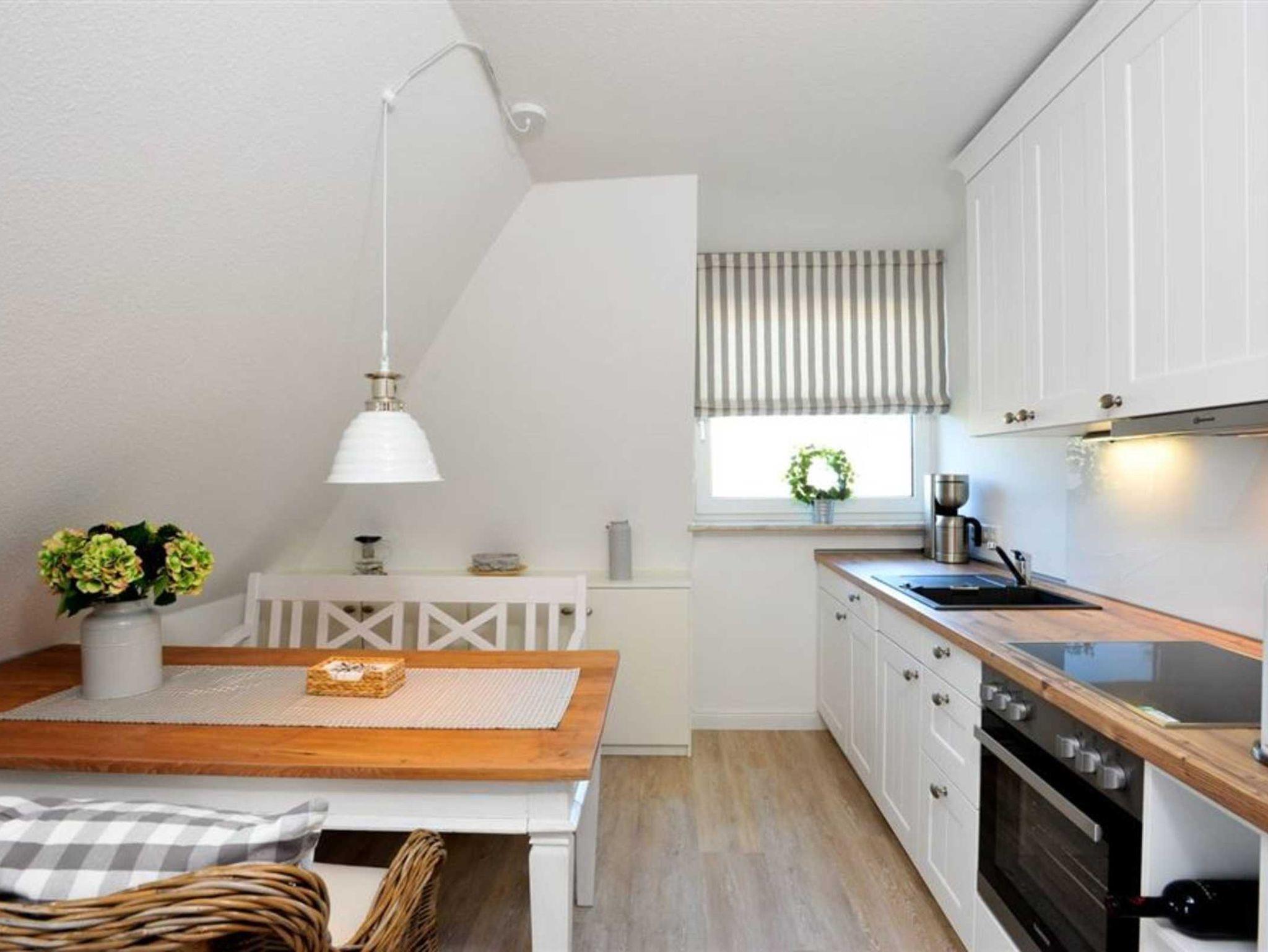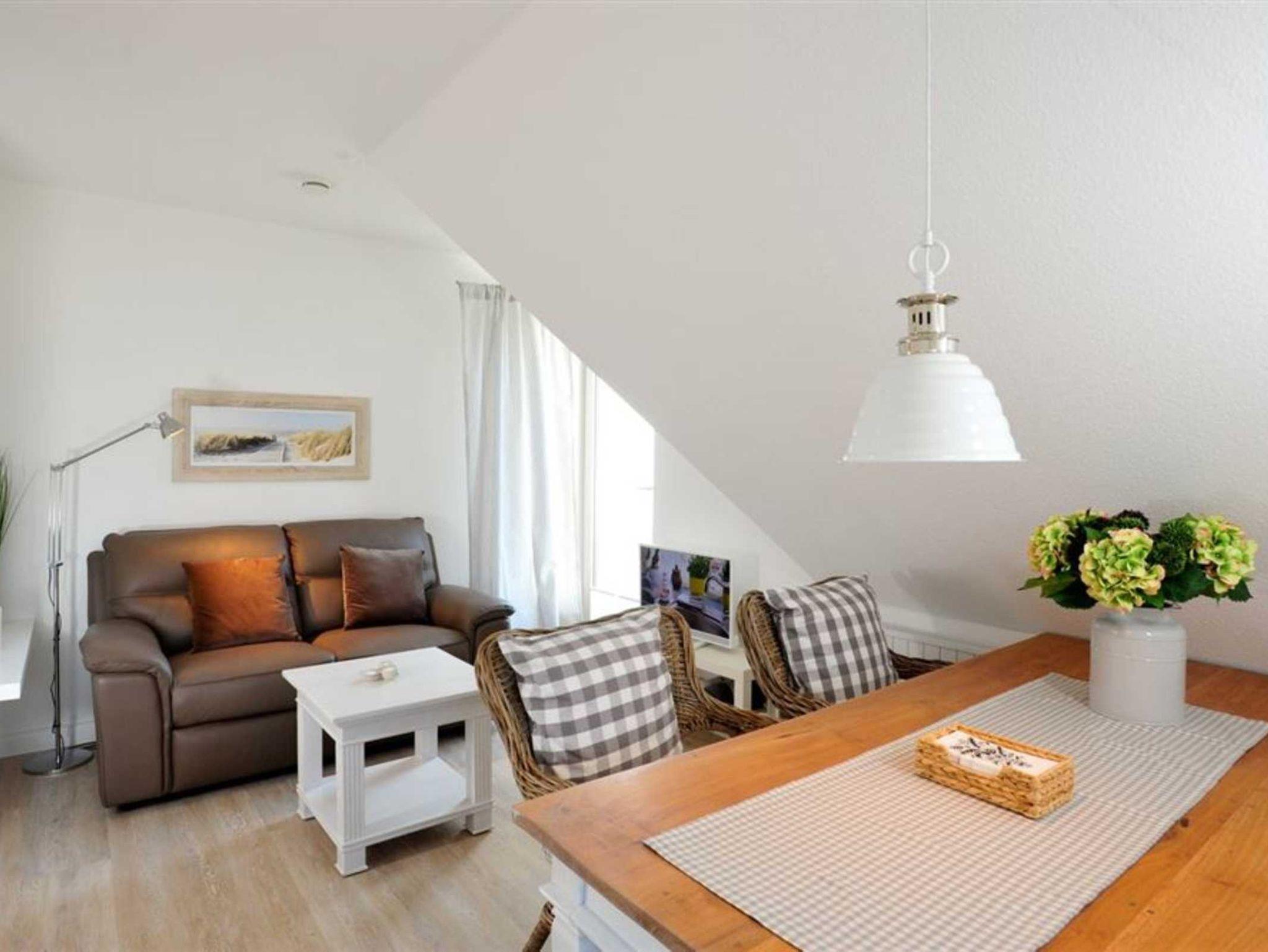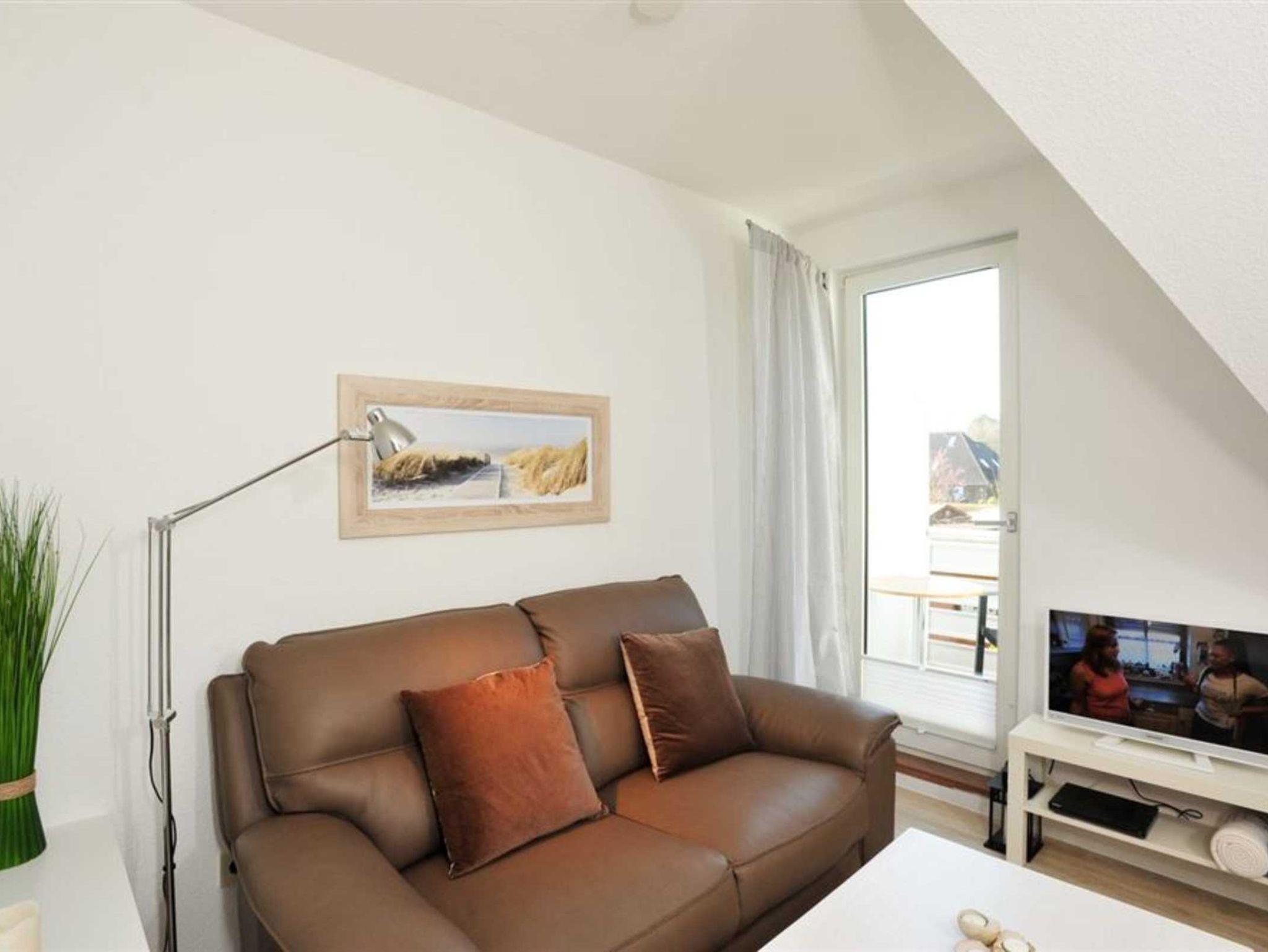 Wohnzimmer mit Sofa (2er), TV (Sat), DVD-Player und Esstisch mit 2 Sesseln und gemütlicher Sitzbank für 2-3 Personen. Direkter Zugang zum möblierten und windgeschützten Balkon nach Südwesten. Offene Küche mit Backofen, Mikrowelle, Geschirrspüler und Kühlschrank mit Gefrierfach.