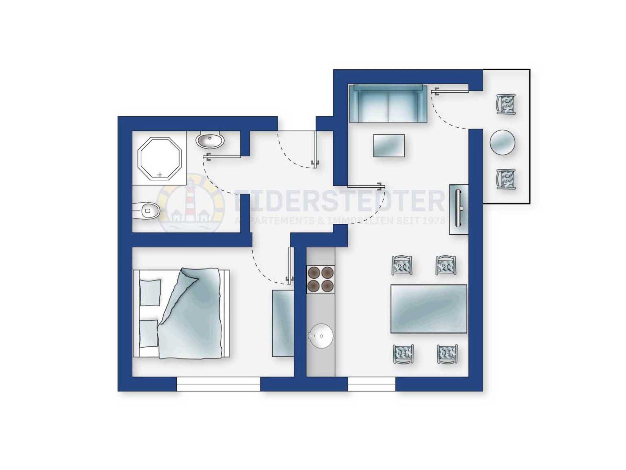 Exklusiv eingerichtete 2-Zimmer-Ferienwohnung im Haus Austernfischer mit ca. 32 m² auf 1 Ebene (OG) für bis zu 2 Personen. In guter Lage im Ortsteil Bad in St. Peter-Ording.