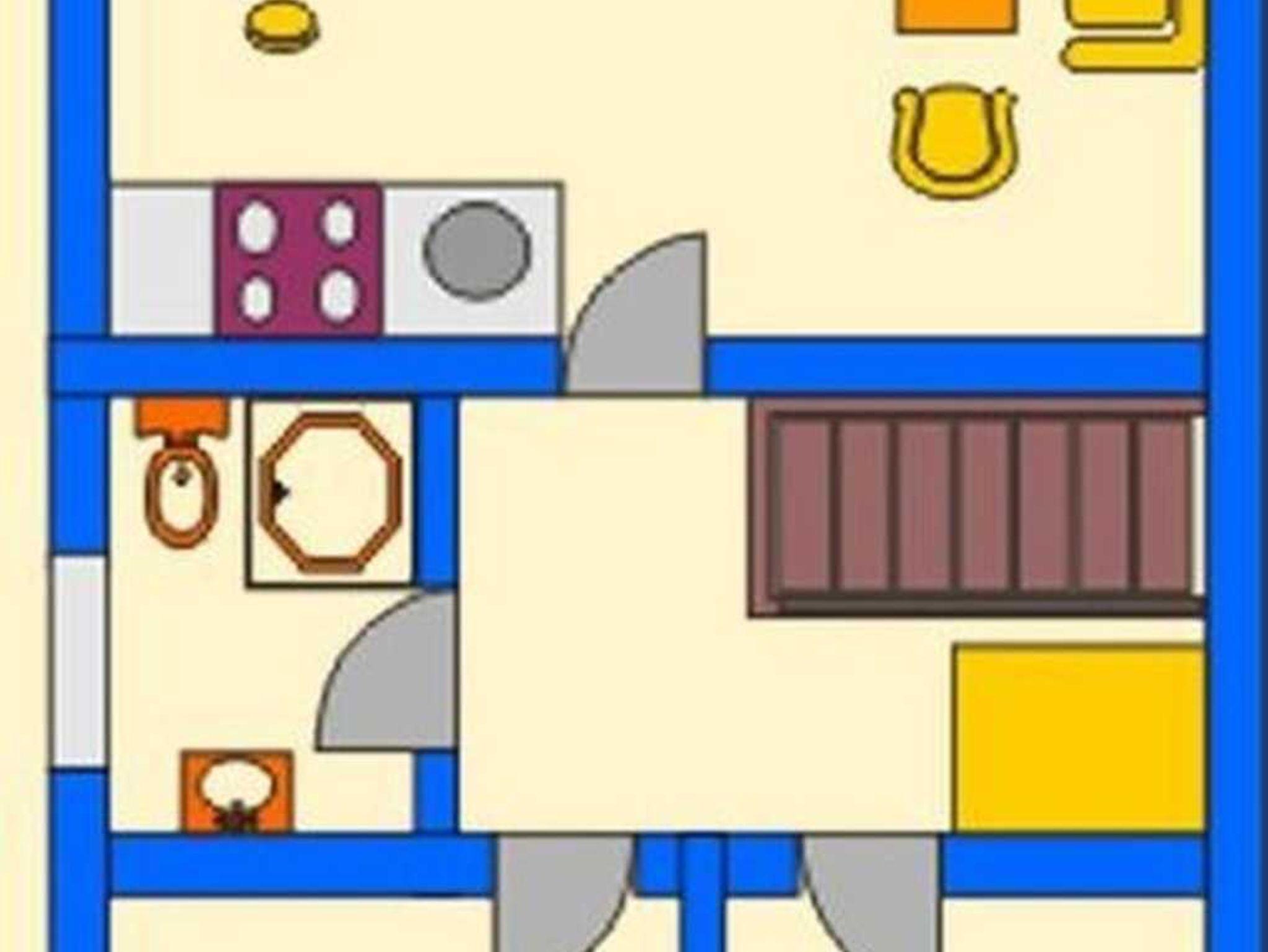 Im EG ist ein kleiner Eingangsbereich mit Schuhablage. Zum OG führt eine steile Treppe. Im OG ist ein Flur mit Kleiderschrank und Garderobe.
