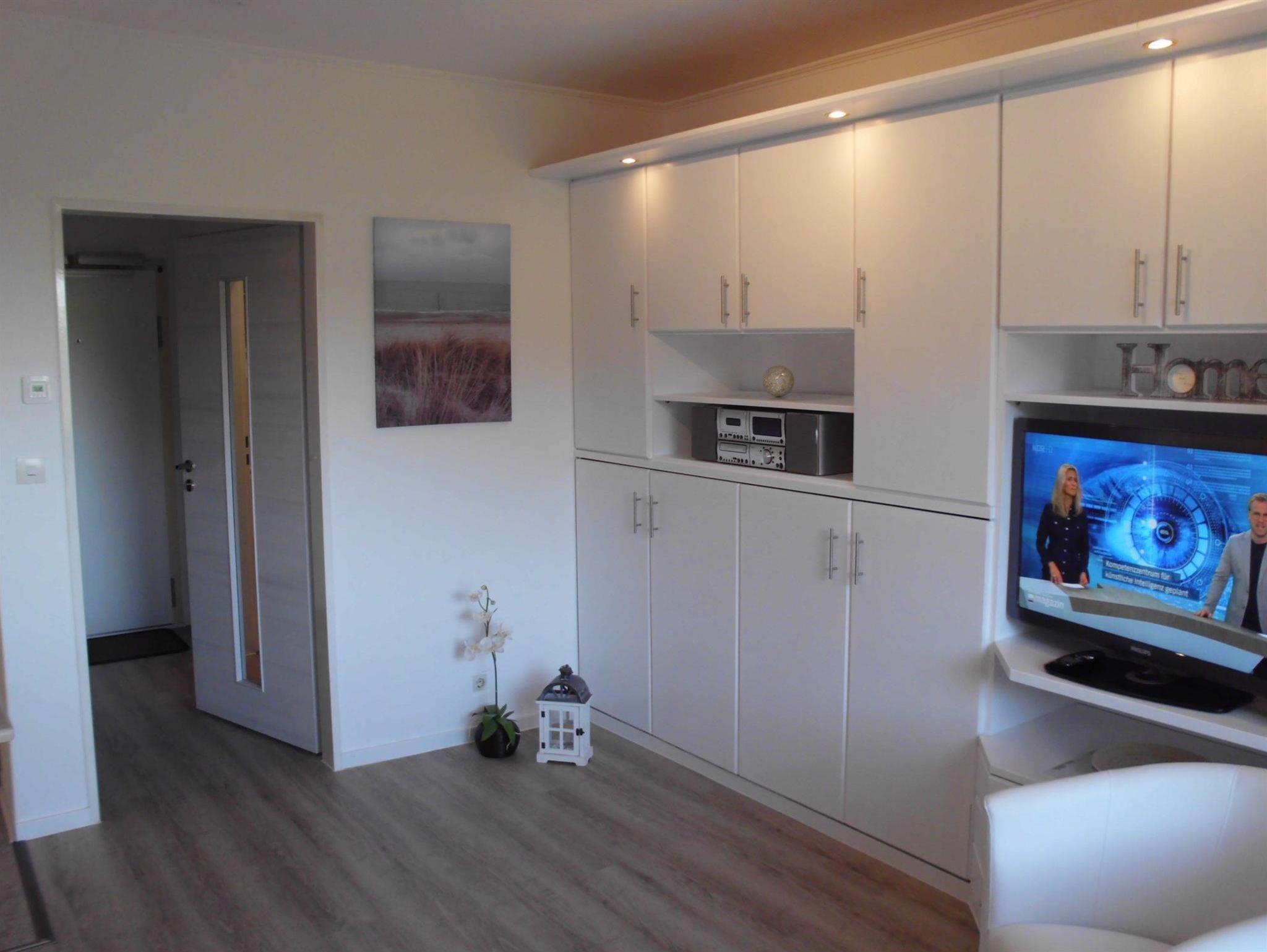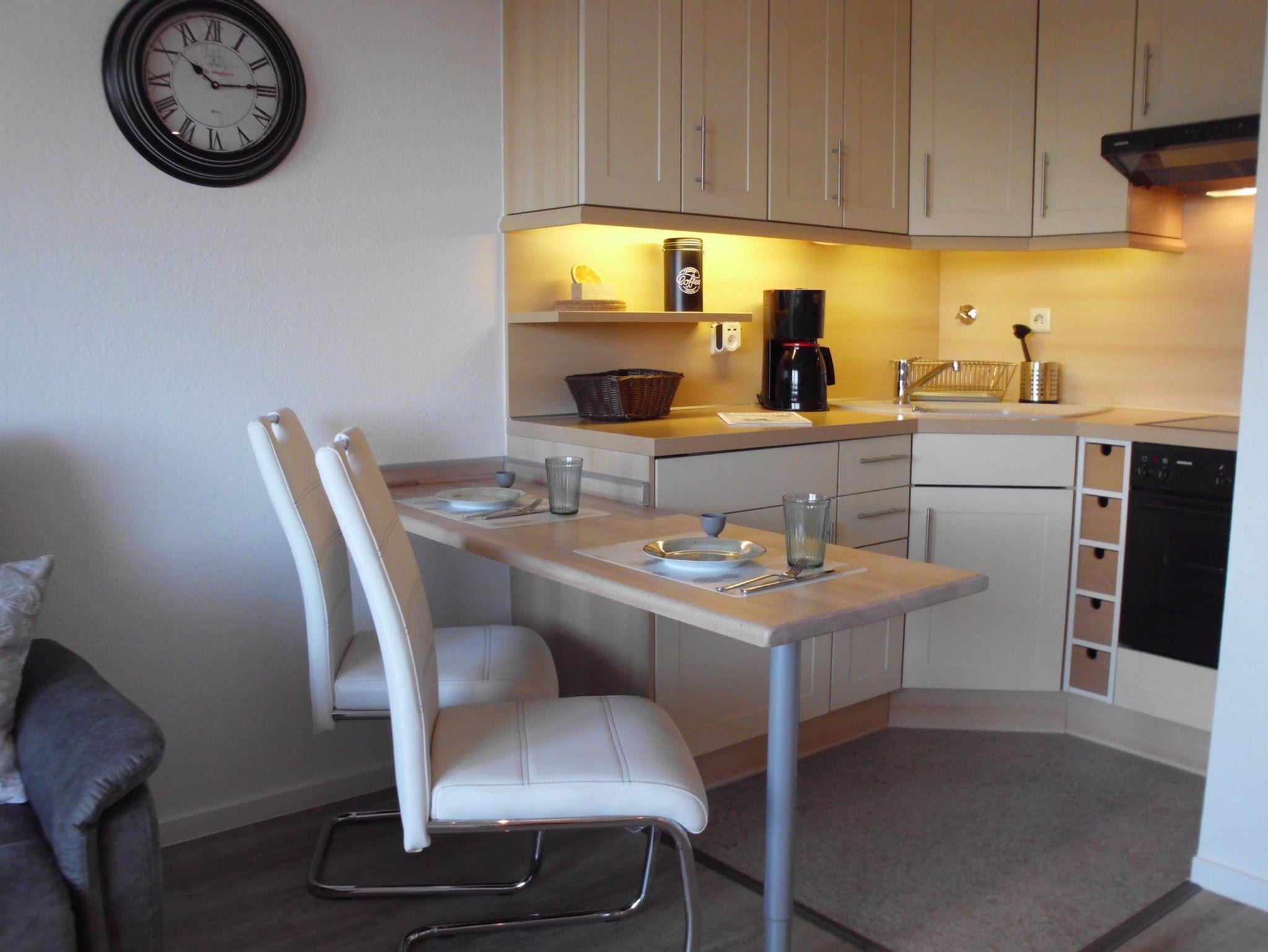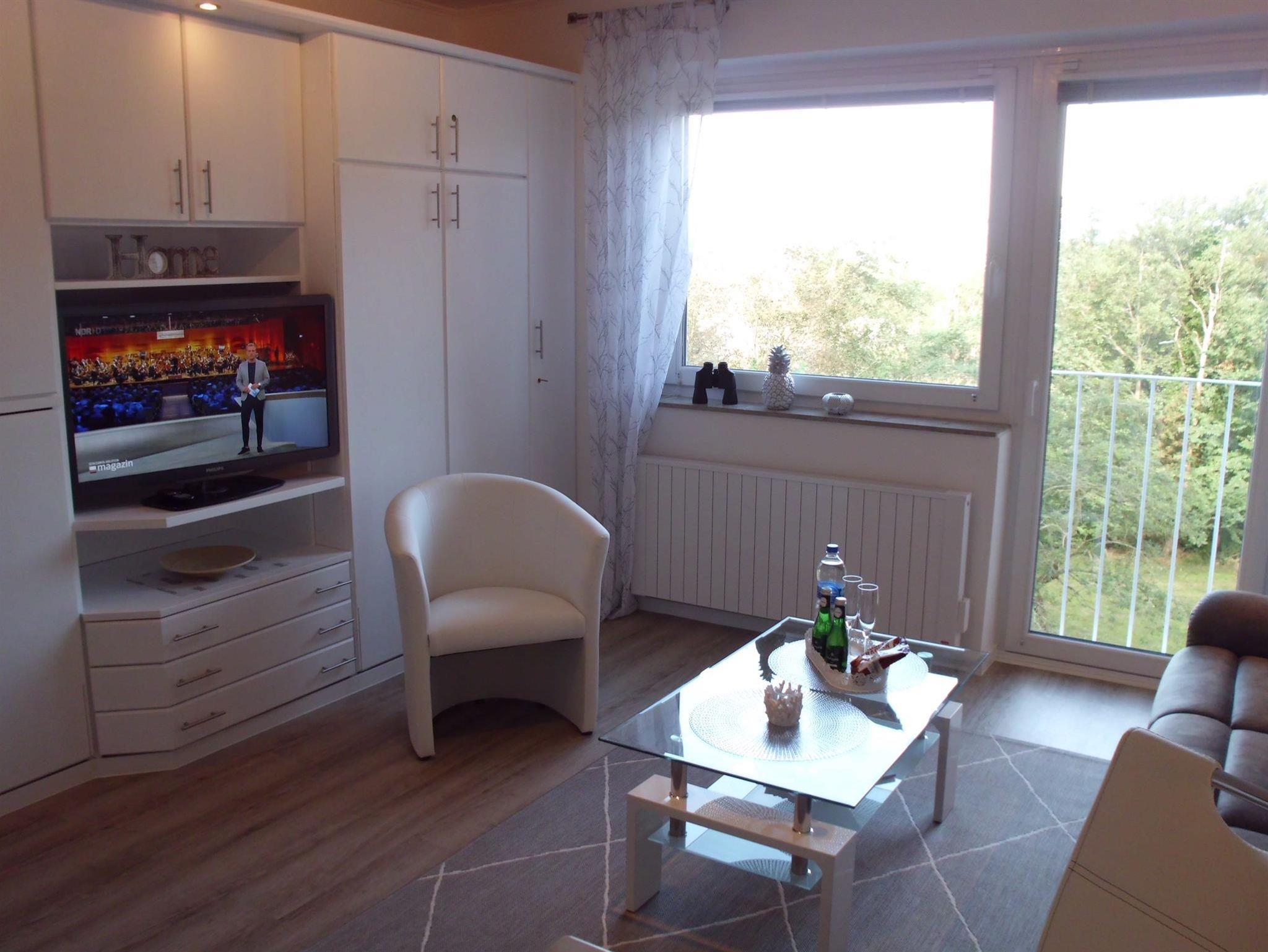 Das exklusive Studioappartement verfügt über ein Wohn-/Schlafraum mit zwei Einzelschrankbetten. Die hell gestaltete Küchenzeile fügt sich perfekt in den lichtdurchfluteten Wohn- und Schlafbereich ein. Aus dem Fenster und vom französischem Balkon reicht der Blick weit über die Pfahlbauten hinweg bis zum Meer.