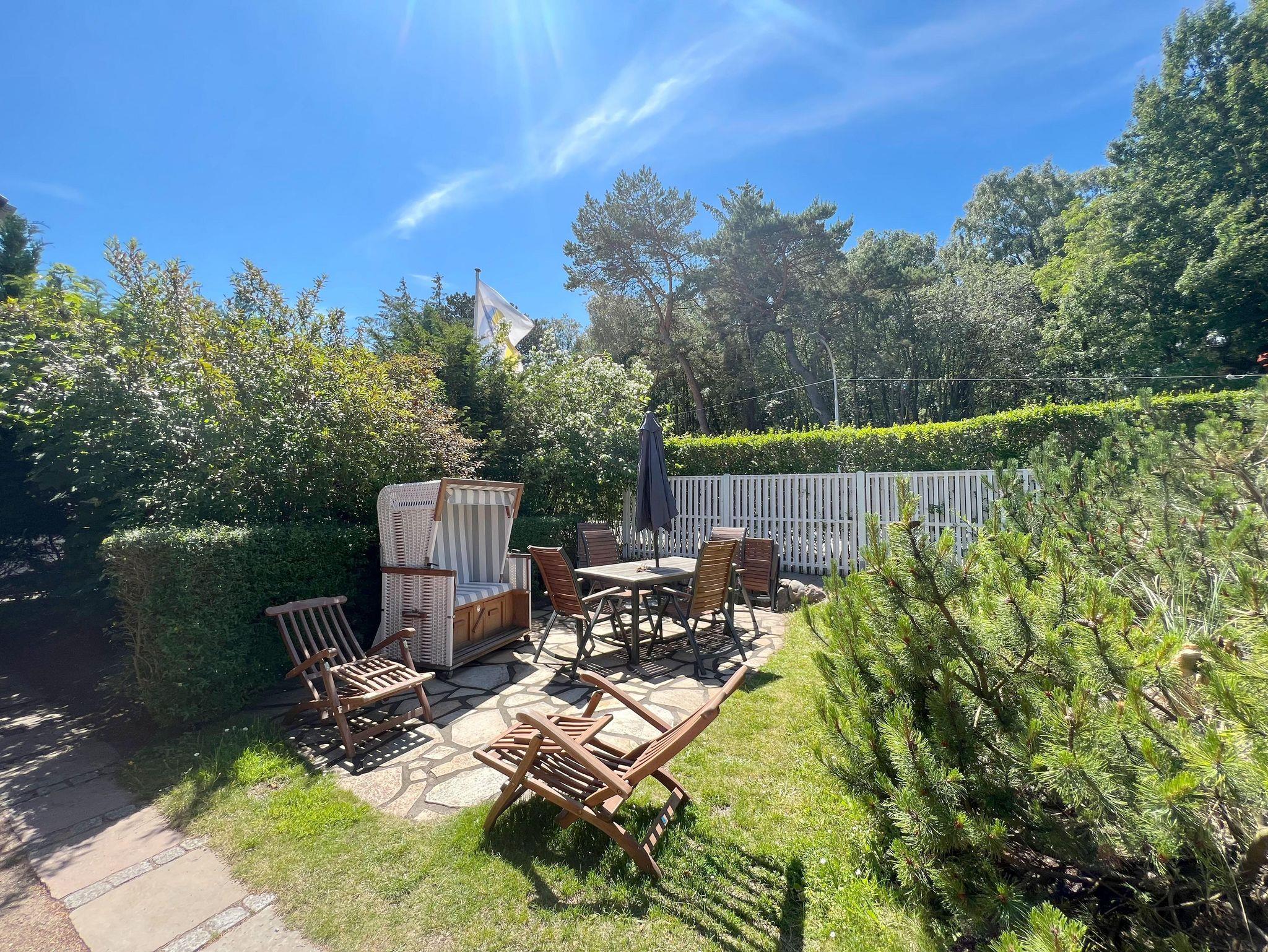 • Terrasse mit Gartenmöbeln und Strandkorb