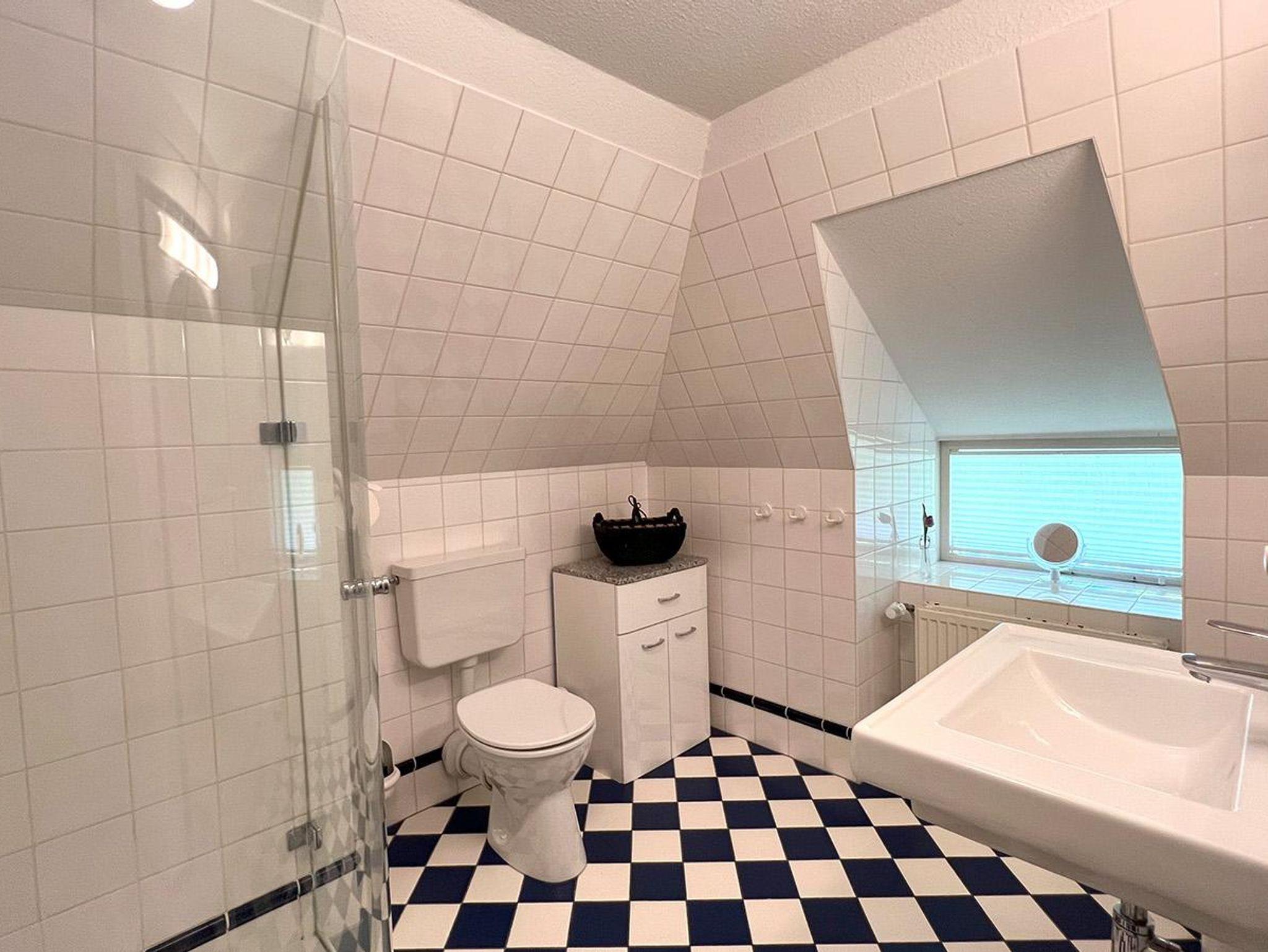 Obergeschoss: 1 Schlafzimmer mit Doppelbett, 1 Schlafzimmer mit 2 Einzelbetten, Wohndiele, Duschbad.
