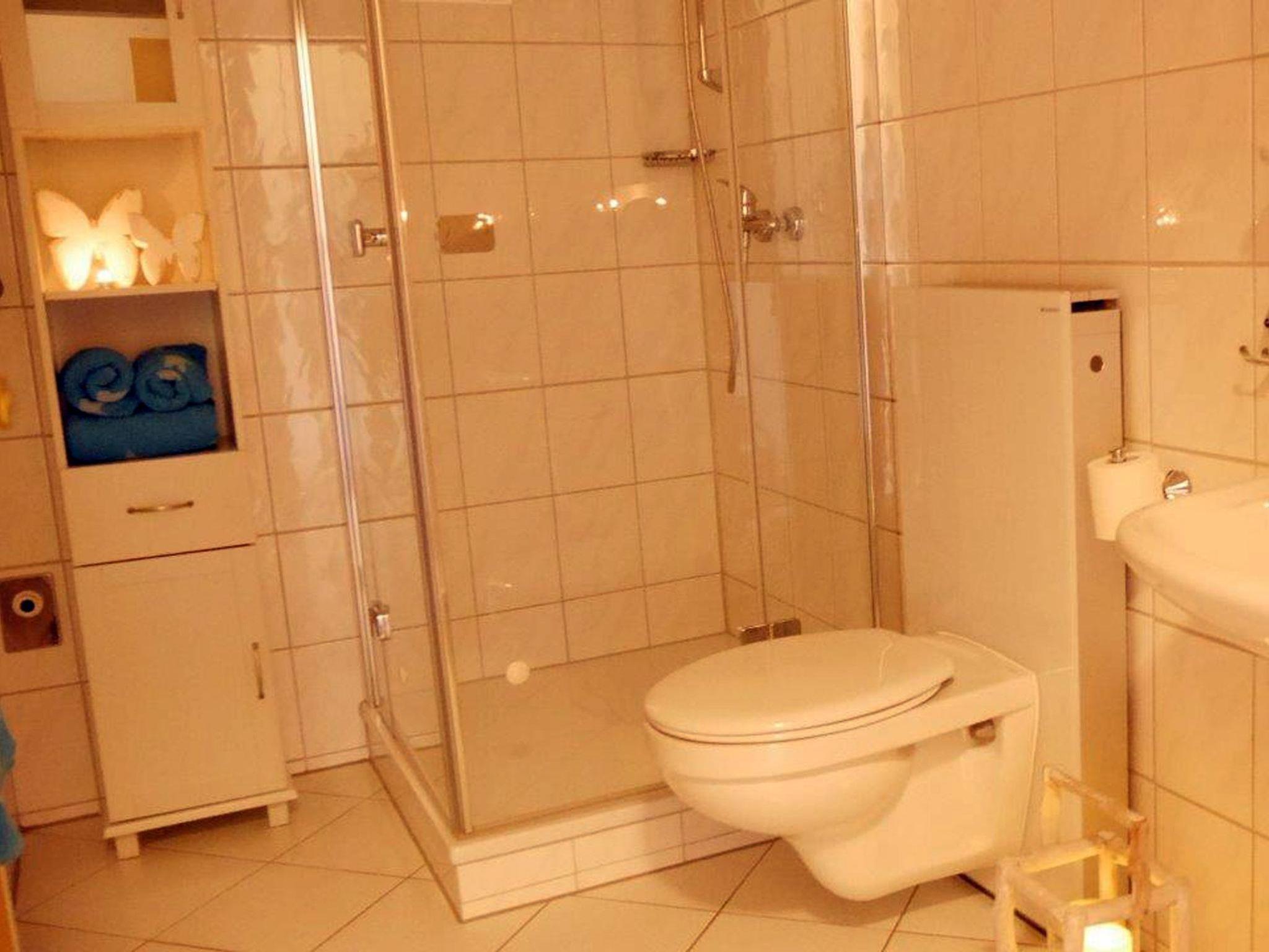 Bad: Dusche, Waschbecken, WC, Schrank, Duschkabine