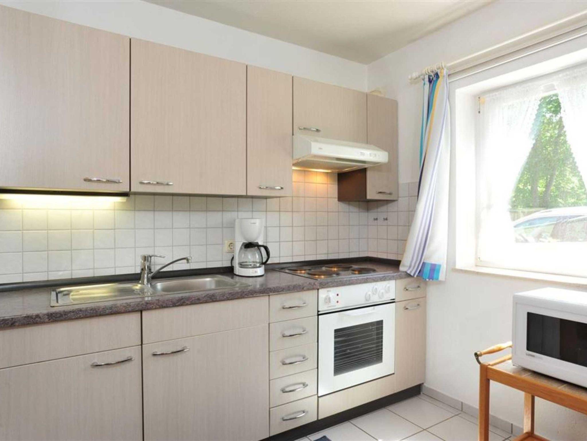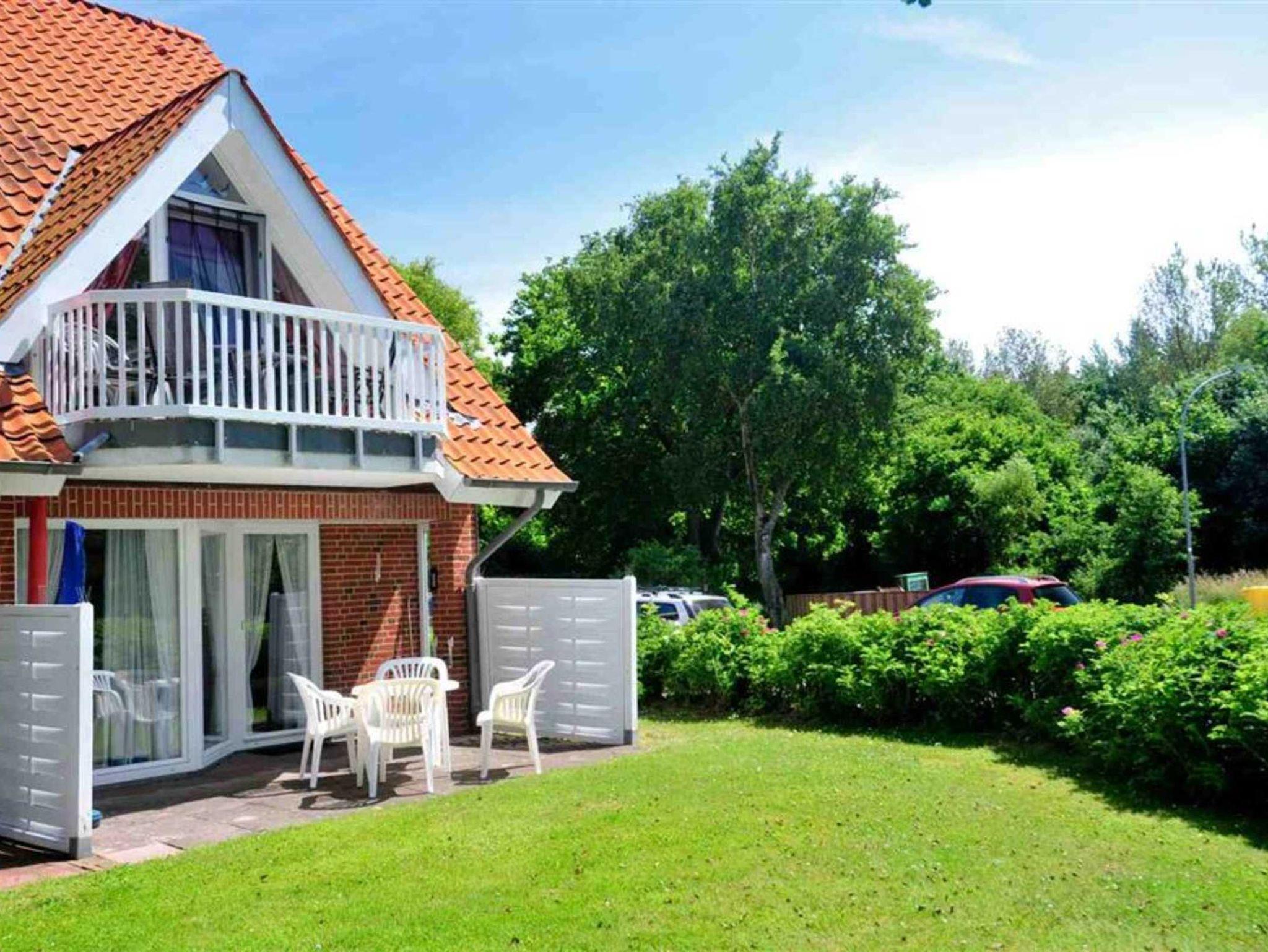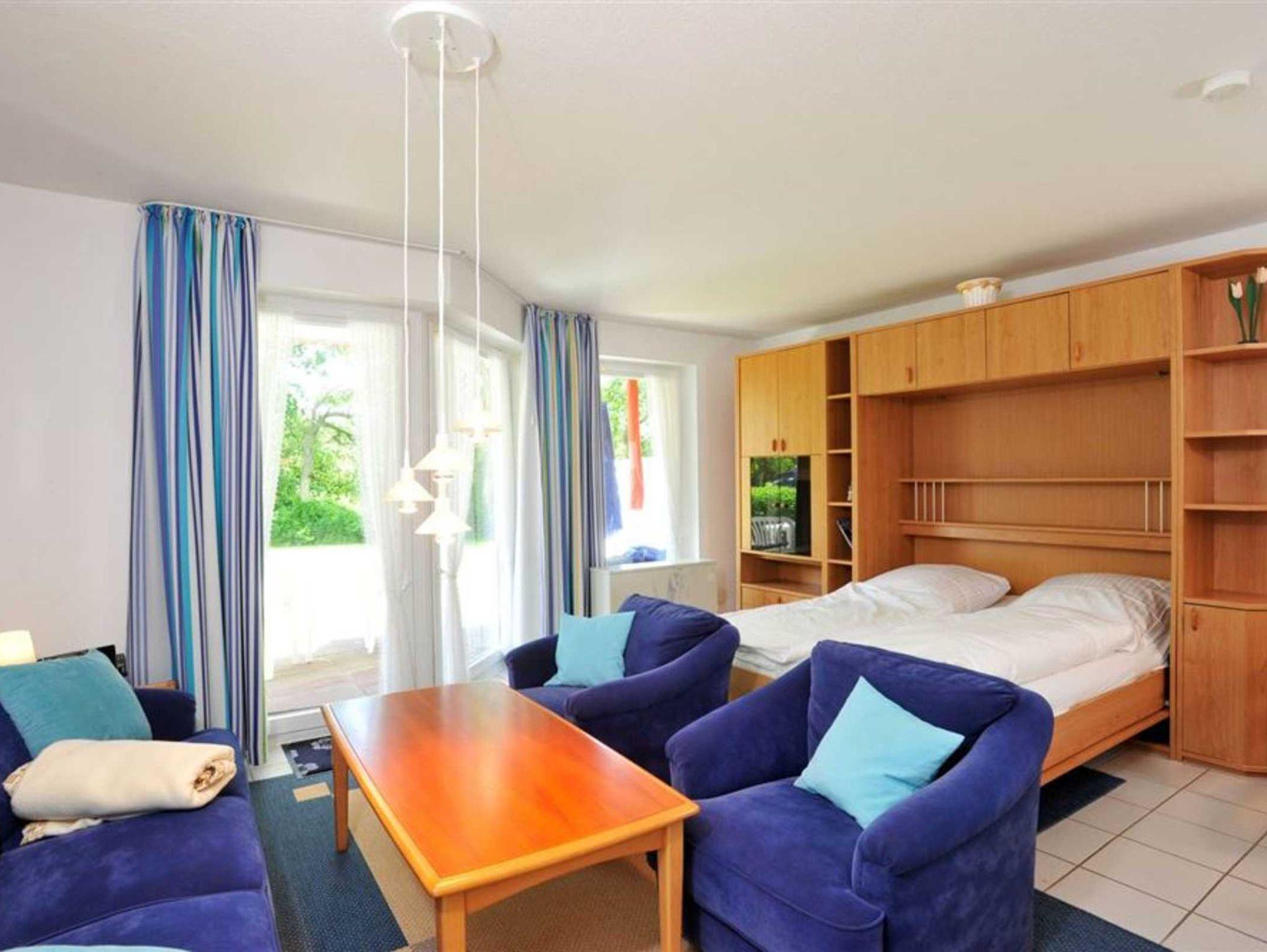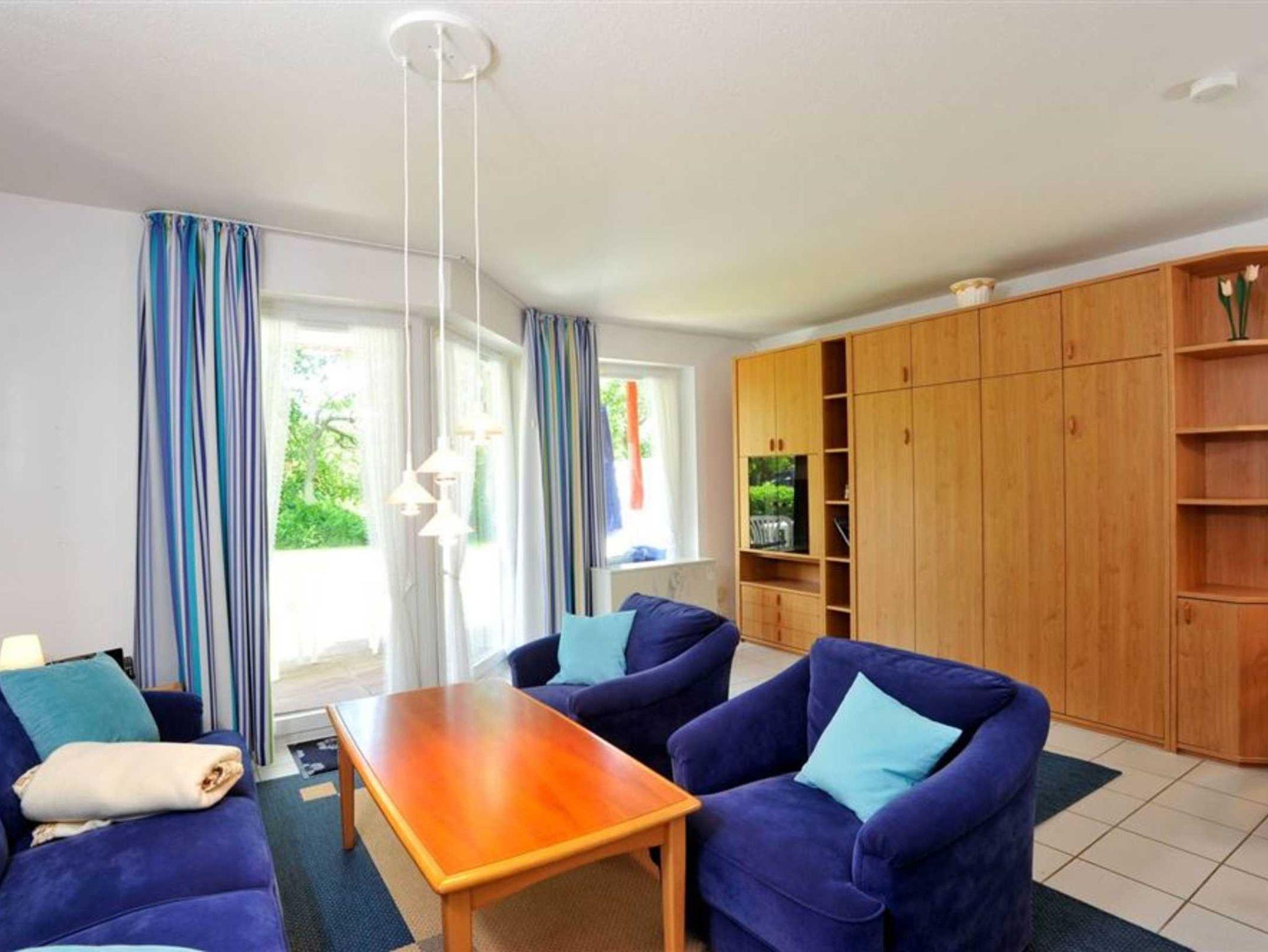 Wohnzimmer mit Sofa für 3 Personen, 2 Sesseln, Schrank-Doppelbett (2x 80x200cm), TV (Sat), Stereo-Kompaktanlage mit CD-Player und Esstisch mit 4 Stühlen. Direkter Zugang zur windgeschützten, möblierten Gartenterrasse nach Westen. Offene Küche mit Backofen, Mikrowelle und Kühlschrank mit Gefrierfach.