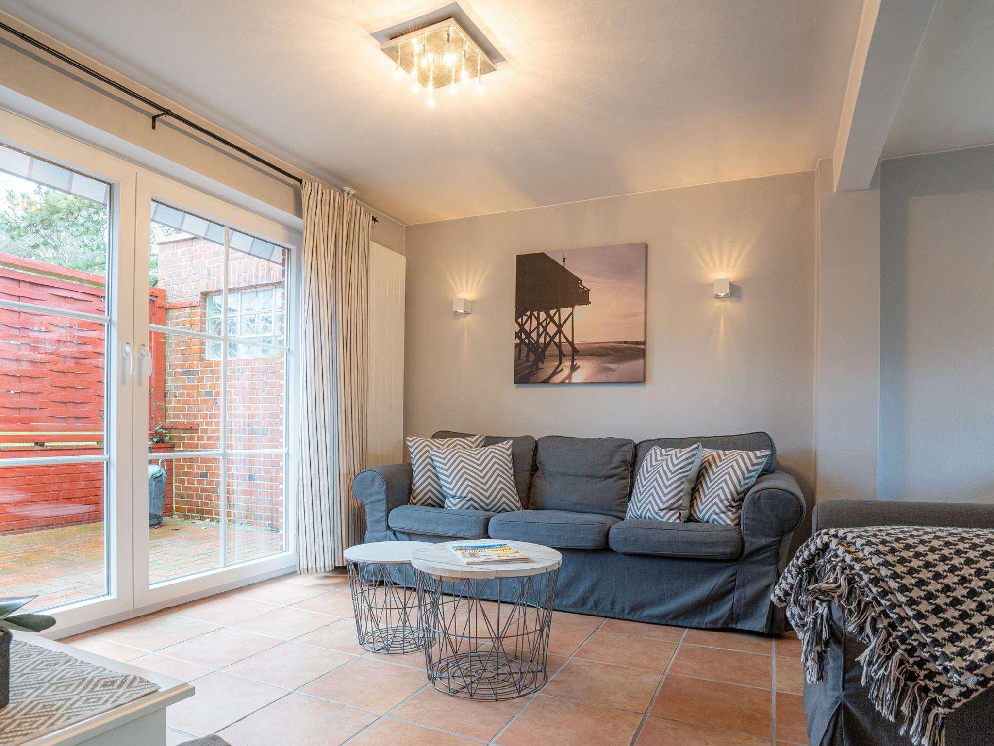 Der offene Wohn,- Essbereich ist hell und gemütlich eingerichtet. Von hier aus gelangen Sie auf die windgeschützte Ostterrasse. Gartenmöbel und Strandkorb laden Sie zum Relaxen ein.
