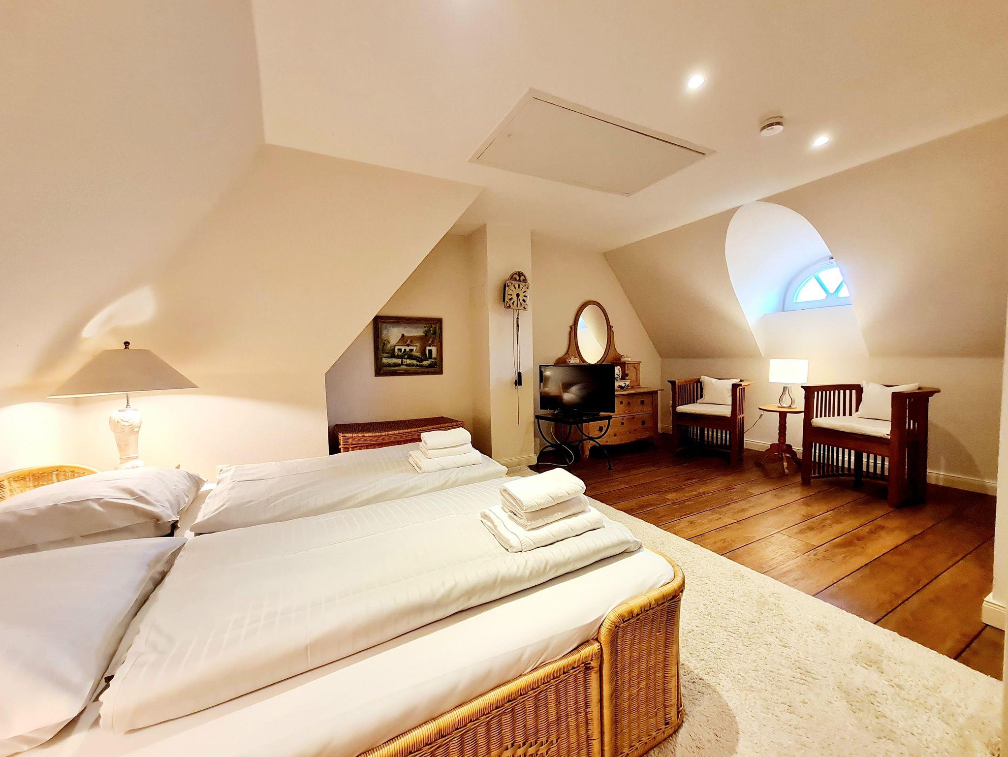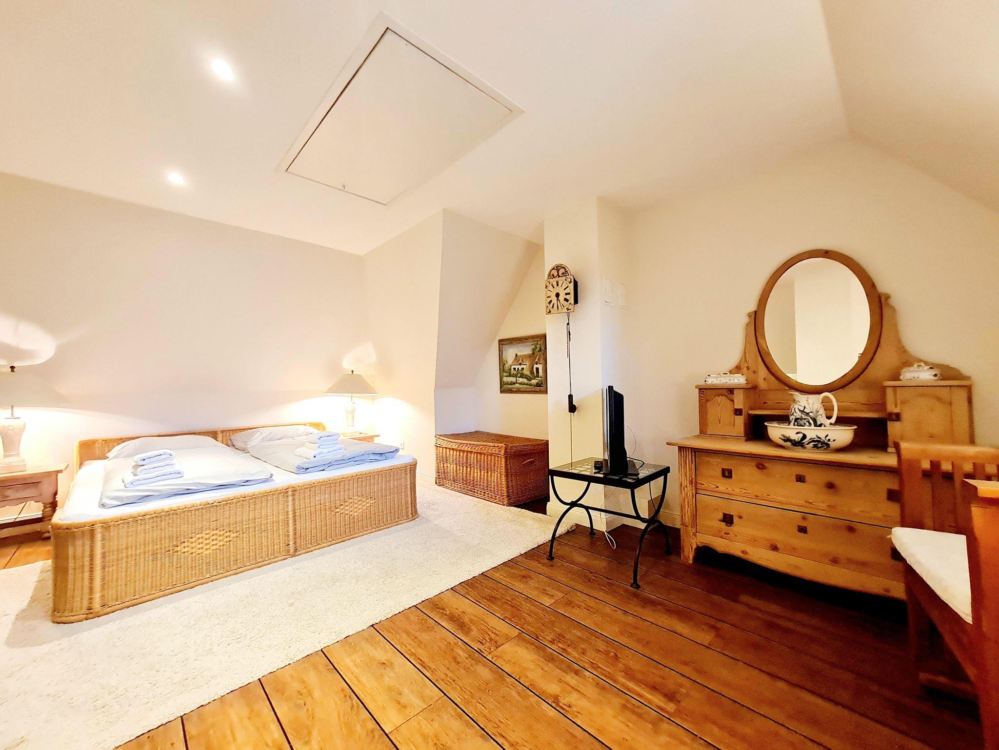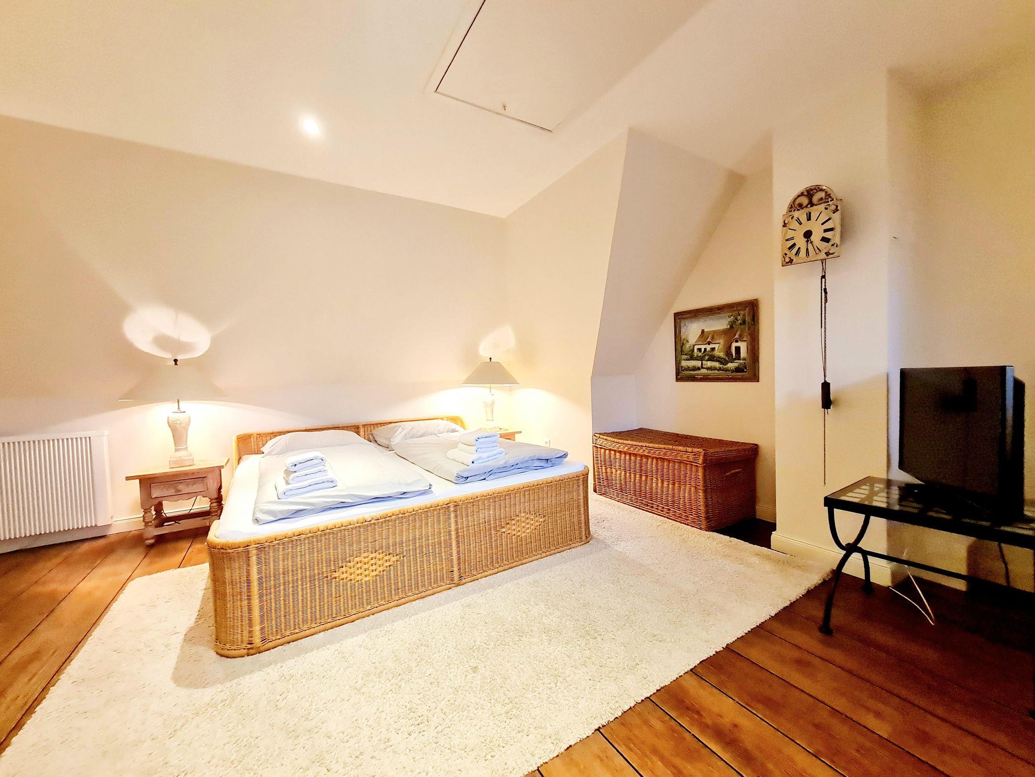 Das charmant ausgestattete Schlafzimmer mit Doppelbett, TV und begehbarem Kleiderschrank befindet sich im Obergeschoss und bietet sämtliche Annehmlichkeiten.