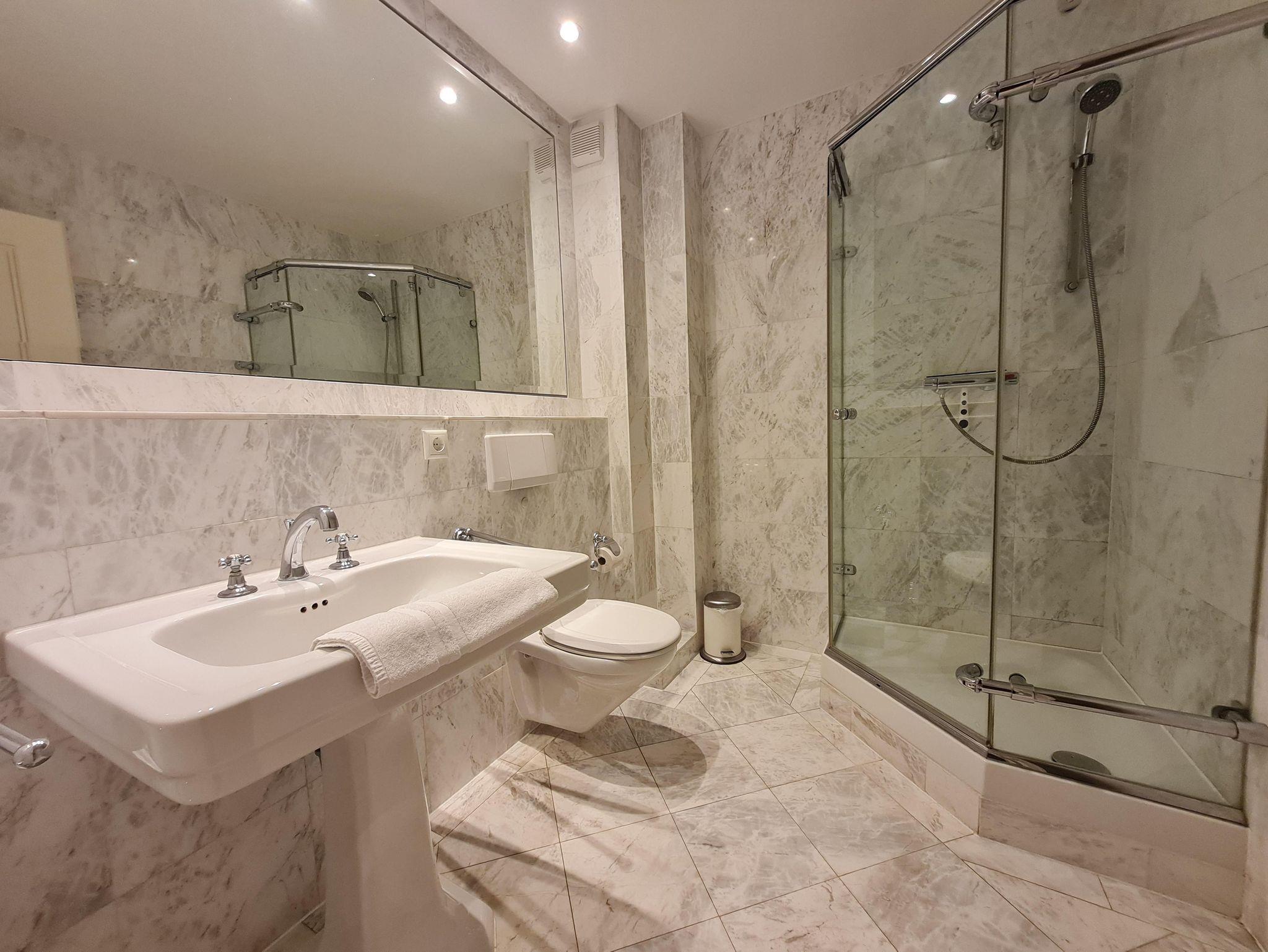 Es erwartet Sie ein großzügiges und hochwertiges Marmor Duschbad.