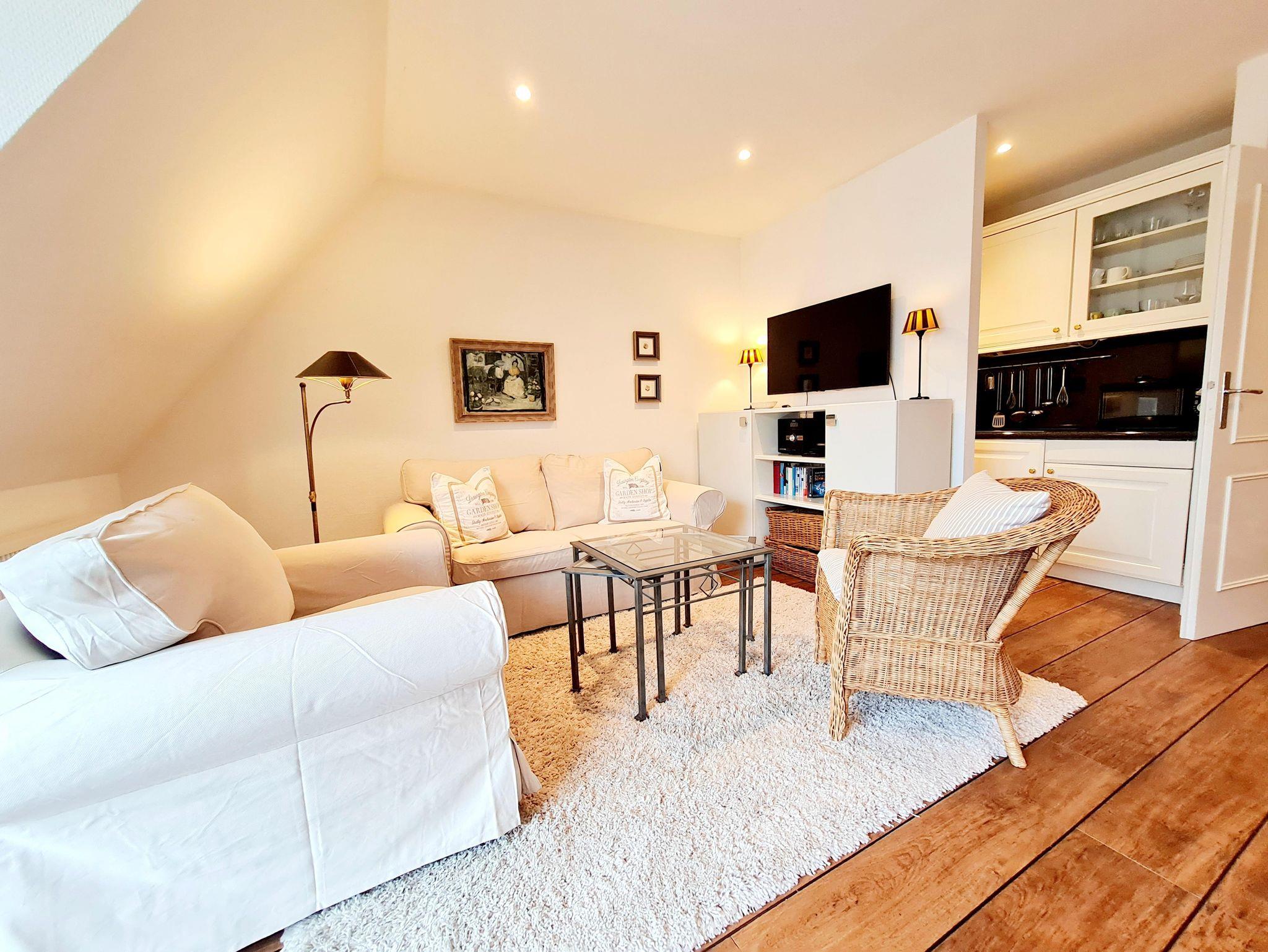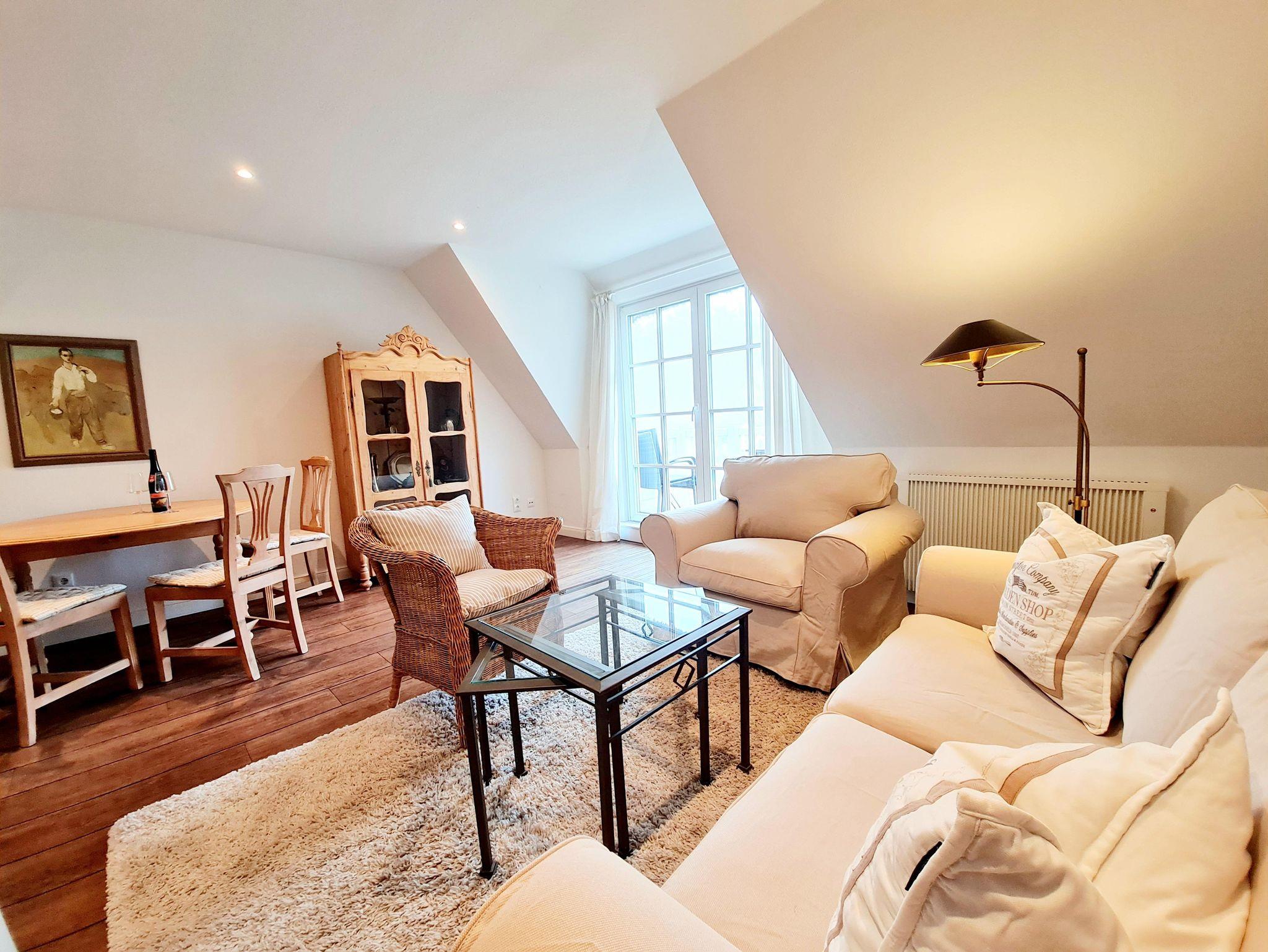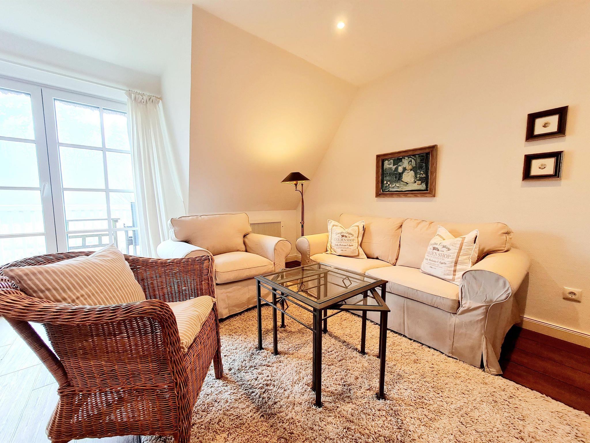 Der helle und freundliche Wohnbereich mit Sitz- und Essgruppe und direktem Zugang zum Balkon, befindet sich in Südlage mit Blick auf den Kurwald.