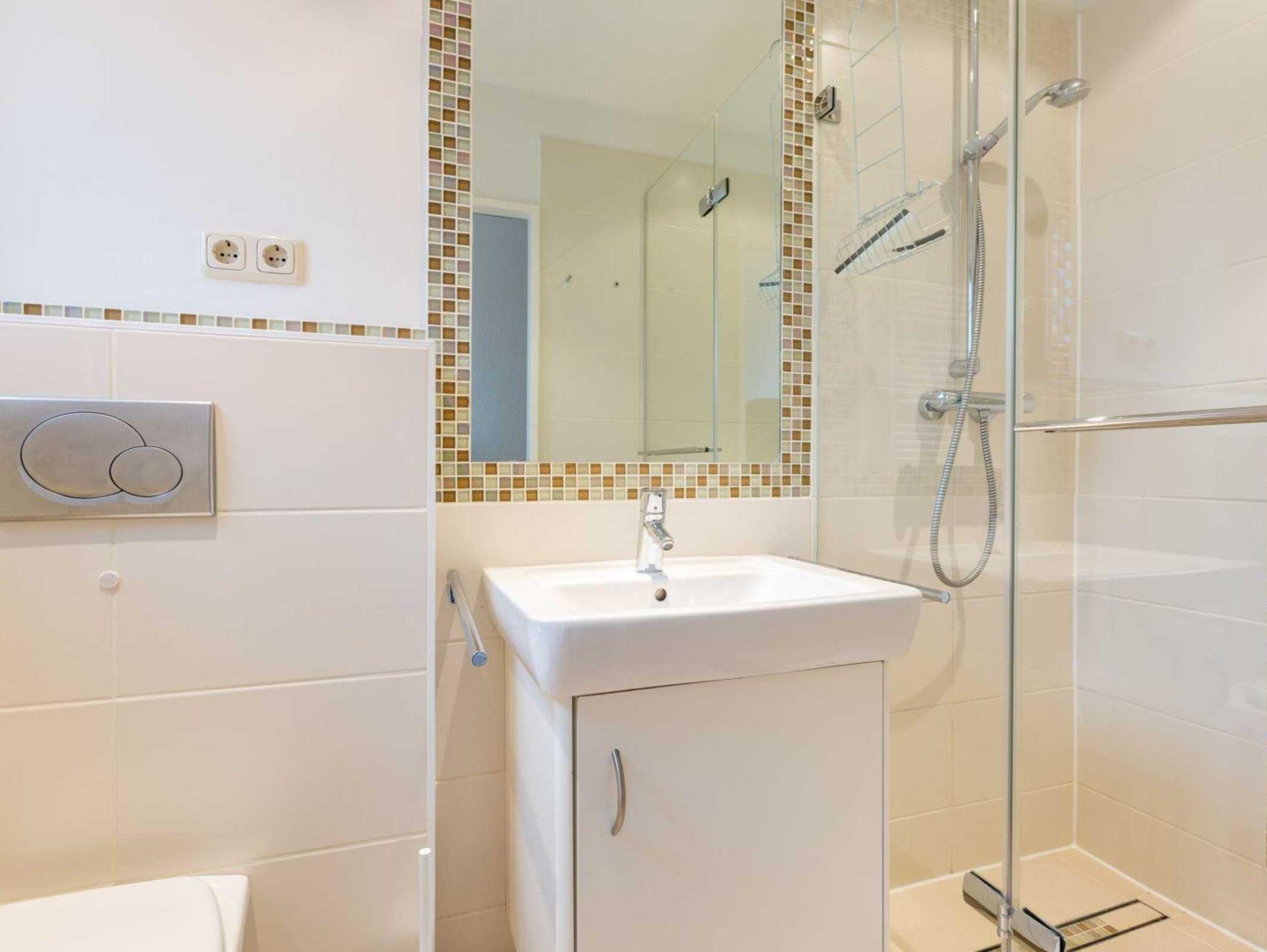 Badezimmer (Duschbad) mit Dusche (Einstieg: ca. 10cm), WC, Handtuchwärmer, Tageslicht und Föhn.