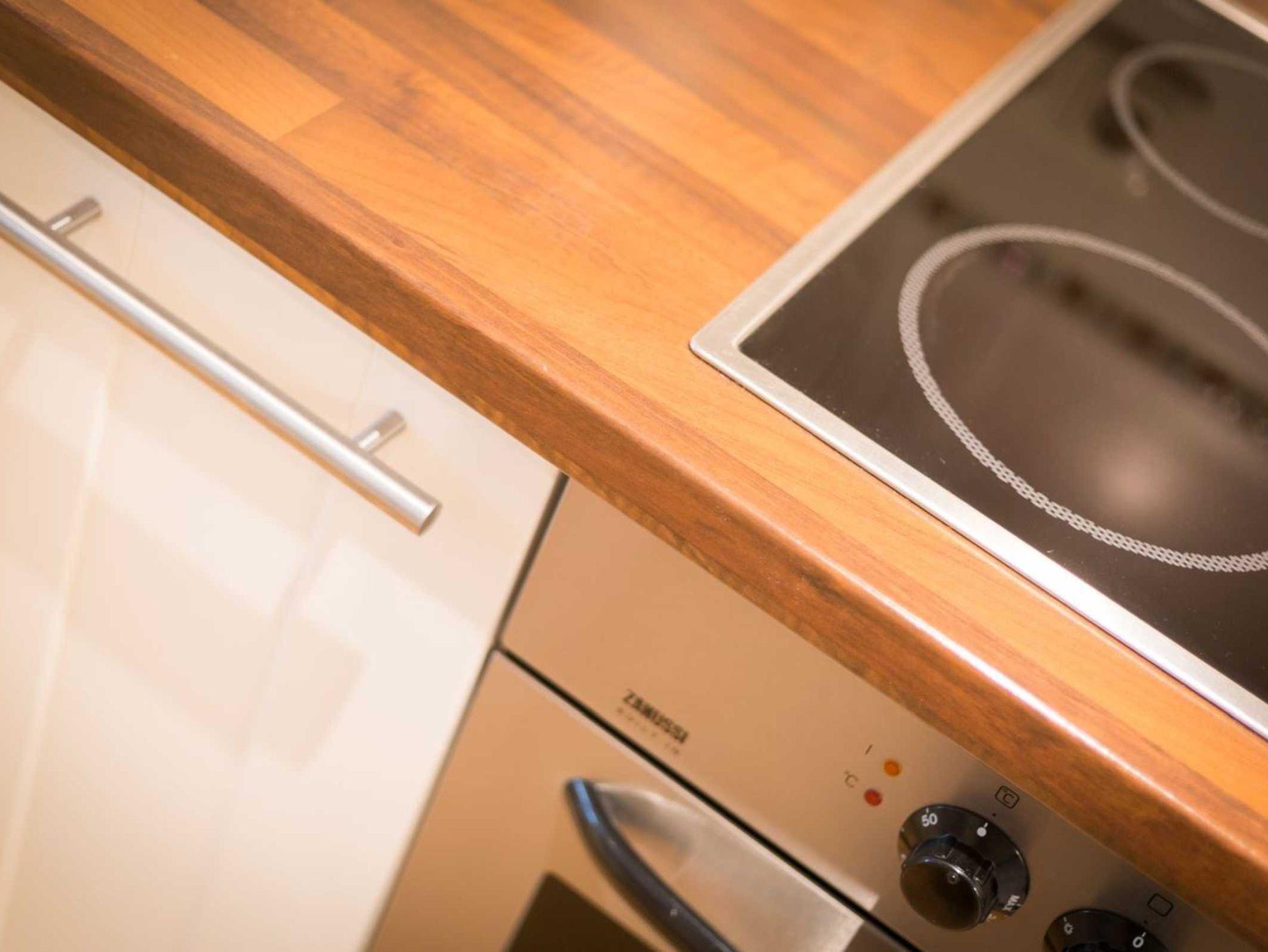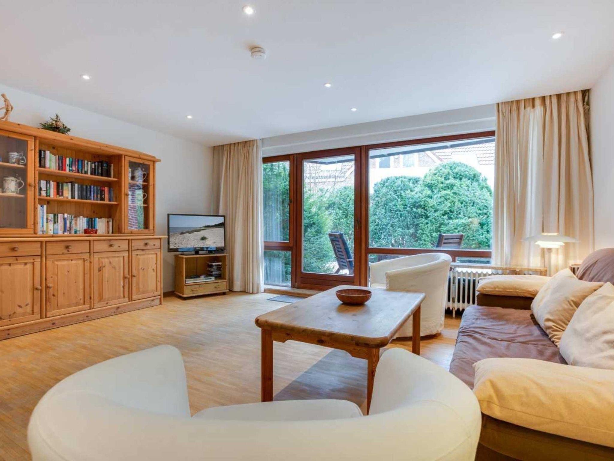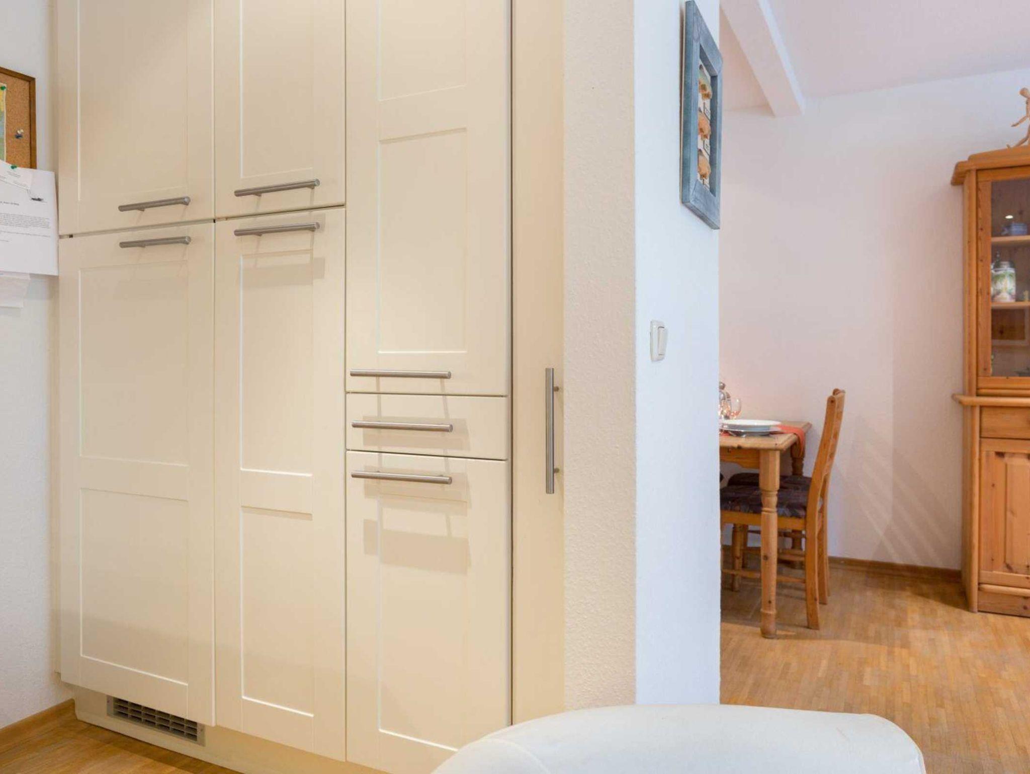 Wohnzimmer mit ausziehbarem Schlafsofa (160x190cm), 2 Sesseln, großem TV (Kabel), DVD-Player, Stereo-Kompaktanlage und Esstisch für 4 Personen. Direkter Zugang zur windgeschützten, möblierten Gartenterrasse nach Süden. Offene Küche mit Backofen, Mikrowelle, Geschirrspüler, Kühlschrank mit Gefrierfach und Schrank mit Staubsauger.