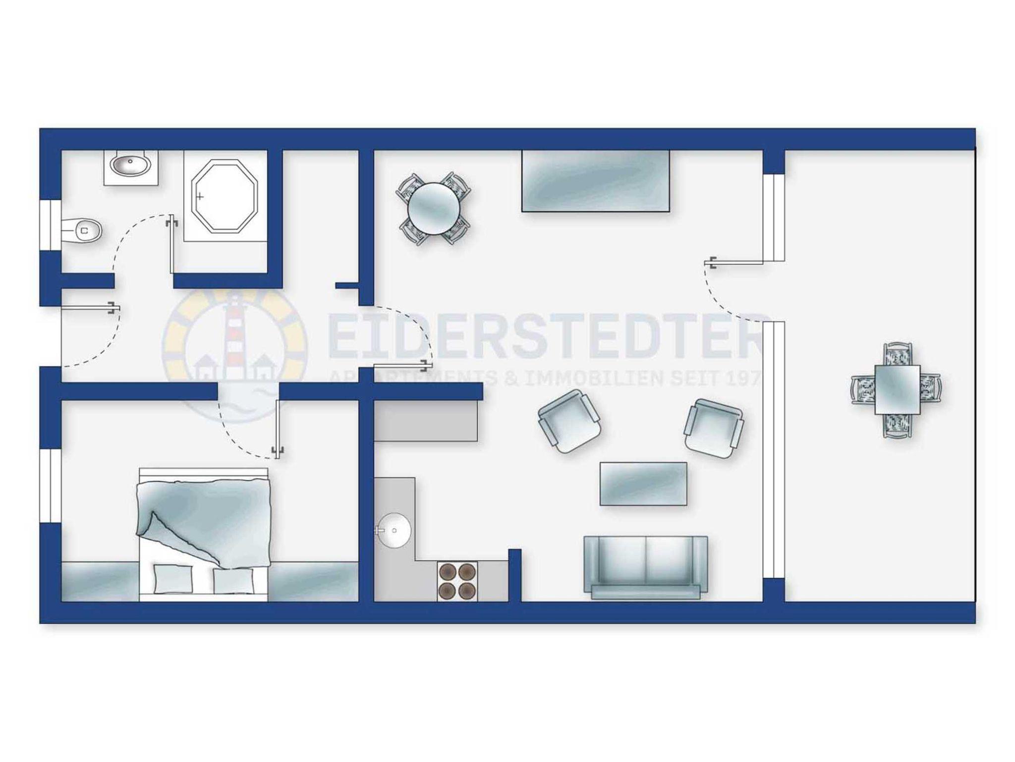 Komfortable 2-Zimmer-Ferienwohnung im Haus Sandpeter mit ca. 53 qm auf 1 Ebene (EG) für bis zu 2 Personen. Ruhige, aber zentrumsnahe Lage im Ortsteil Bad in St. Peter-Ording. Alle Geschäfte und Restaurants des Kurzentrums sowie die Dünentherme, die Promenade und der Strand sind in wenigen Gehminuten zu erreichen.