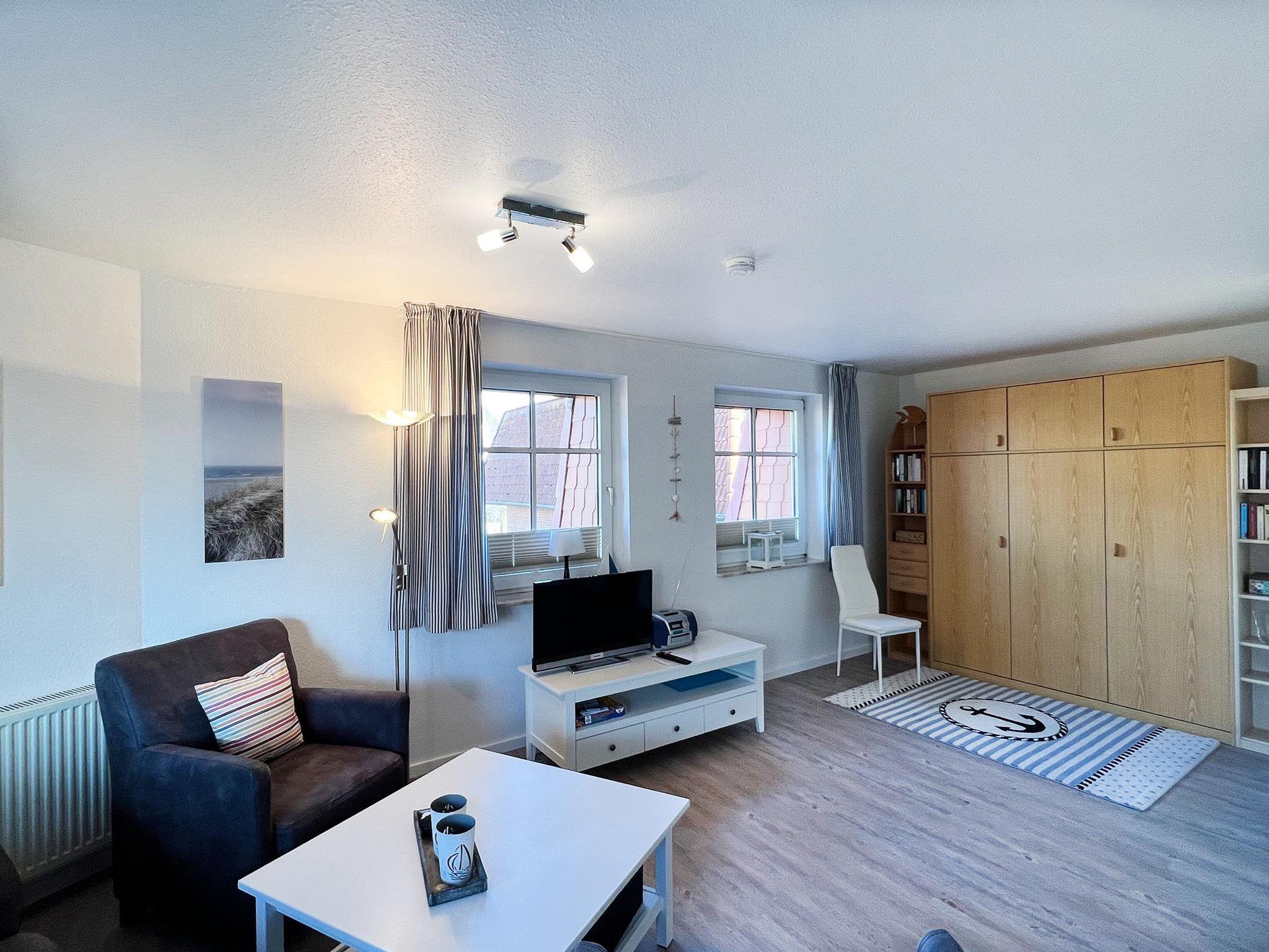 In der 2. Etage haben in der freundlichen 2-Raum-Ferienwohnung Pole Poppenspäler Nr. 06 bis zu 4 Gäste Platz. Der behaglich ausgestattete Wohnbereich ist mit hübschem Laminat ausgelegt und besitzt neben dem Schrankdoppelbett im Wohnzimmer ein weiteres Doppelbett im Schlafzimmer. Entspannen Sie auf dem Nord-West-Balkon bei bester Nordseeluft.