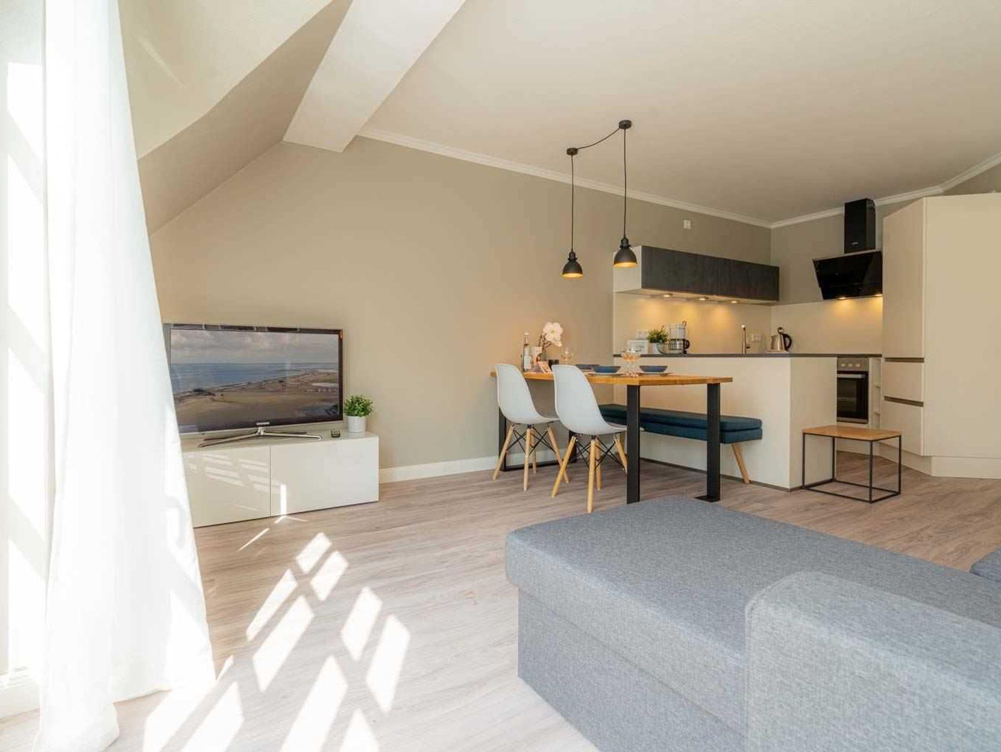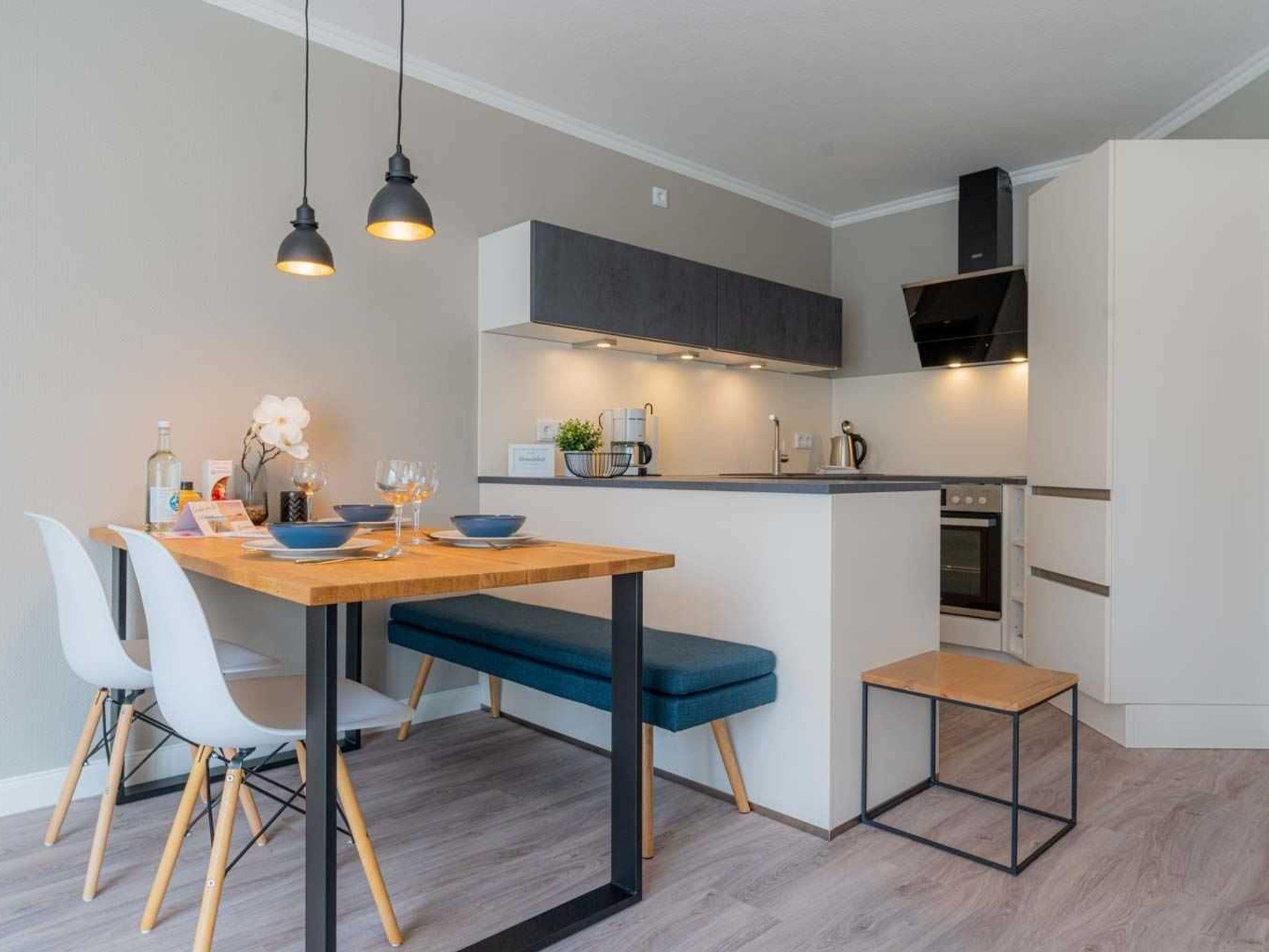 Helles Wohnzimmer mit Sofa mit Ottomane, SMART-TV (Kabel) und Esstisch mit 2 Stühlen und Sitzbank für 2 Personen. Direkter Zugang zum möblierten Balkon nach Südwesten mit Waldblick und Meeresrauschen. Offene Küche mit Backofen, Geschirrspüler, Kühlschrank mit Gefrierfach und Tchibo Cafissimo Kapsel-Kaffeemaschine.