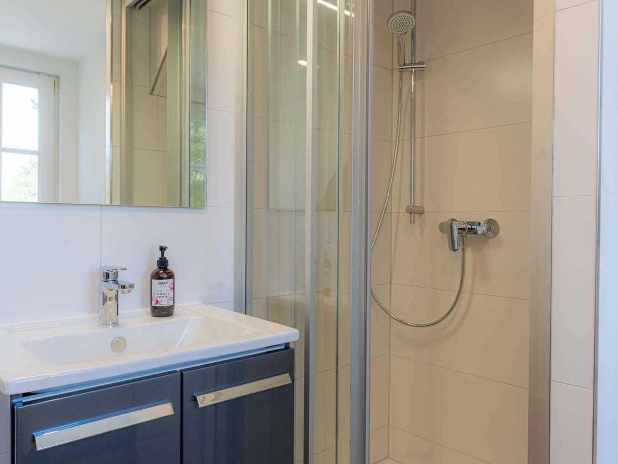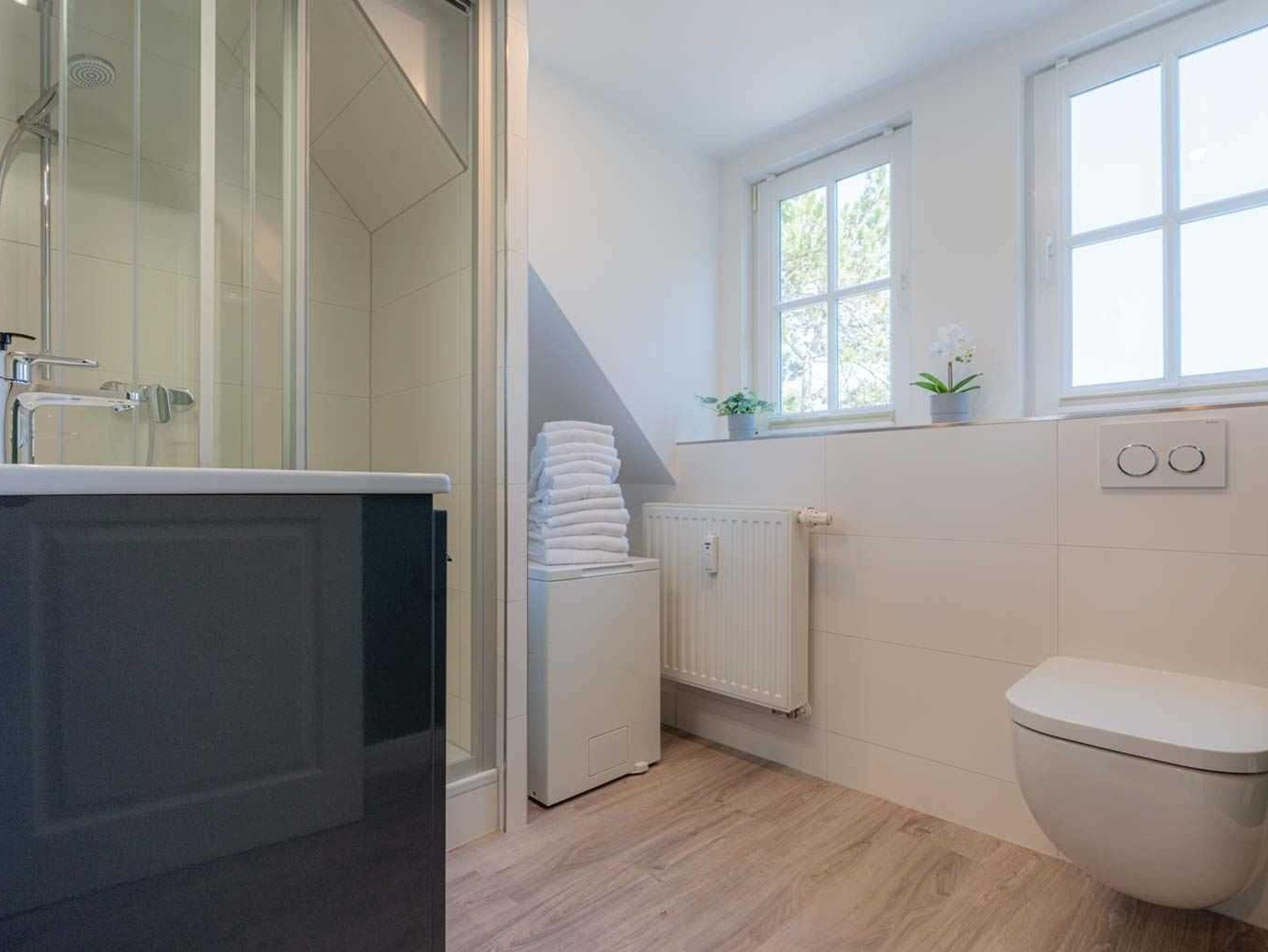 Badezimmer (Duschbad) mit Dusche, WC, Waschmaschine, Tageslicht und Föhn.