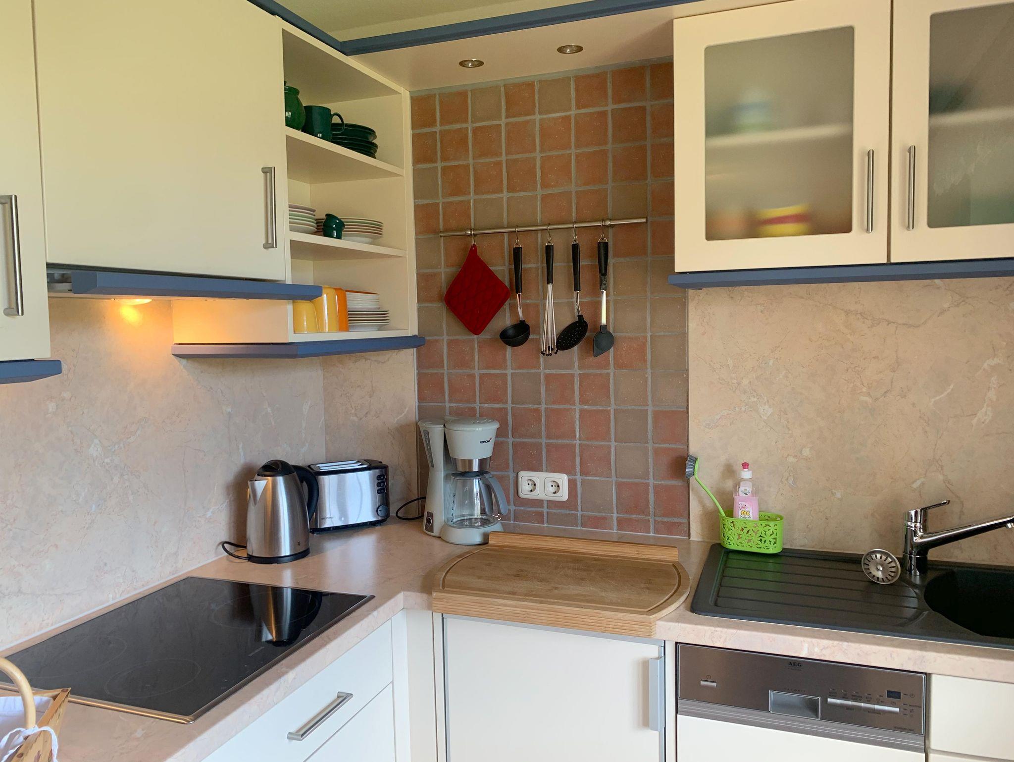 Wohnzimmer: Couch, Sessel, Hocker, 2 Stehlampen, Beistelltisch, Eckregal, Schränkchen, Rollwagen, TV-Tisch, Kabel-TV, Stereoanlage mit CD-Player, Regal, Eckvitrine, Esstisch, 2 Stühle, E-Heizung, Einbauküche, 4 Plattenherd mit Ceranfeld, Dunstabzugshaube, Kühlschrank, Spülmaschine, Kaffeemaschine, Wasserkocher, Toaster und Gourmet Grill, Eierkocher, Geschirr, Kochtöpfe