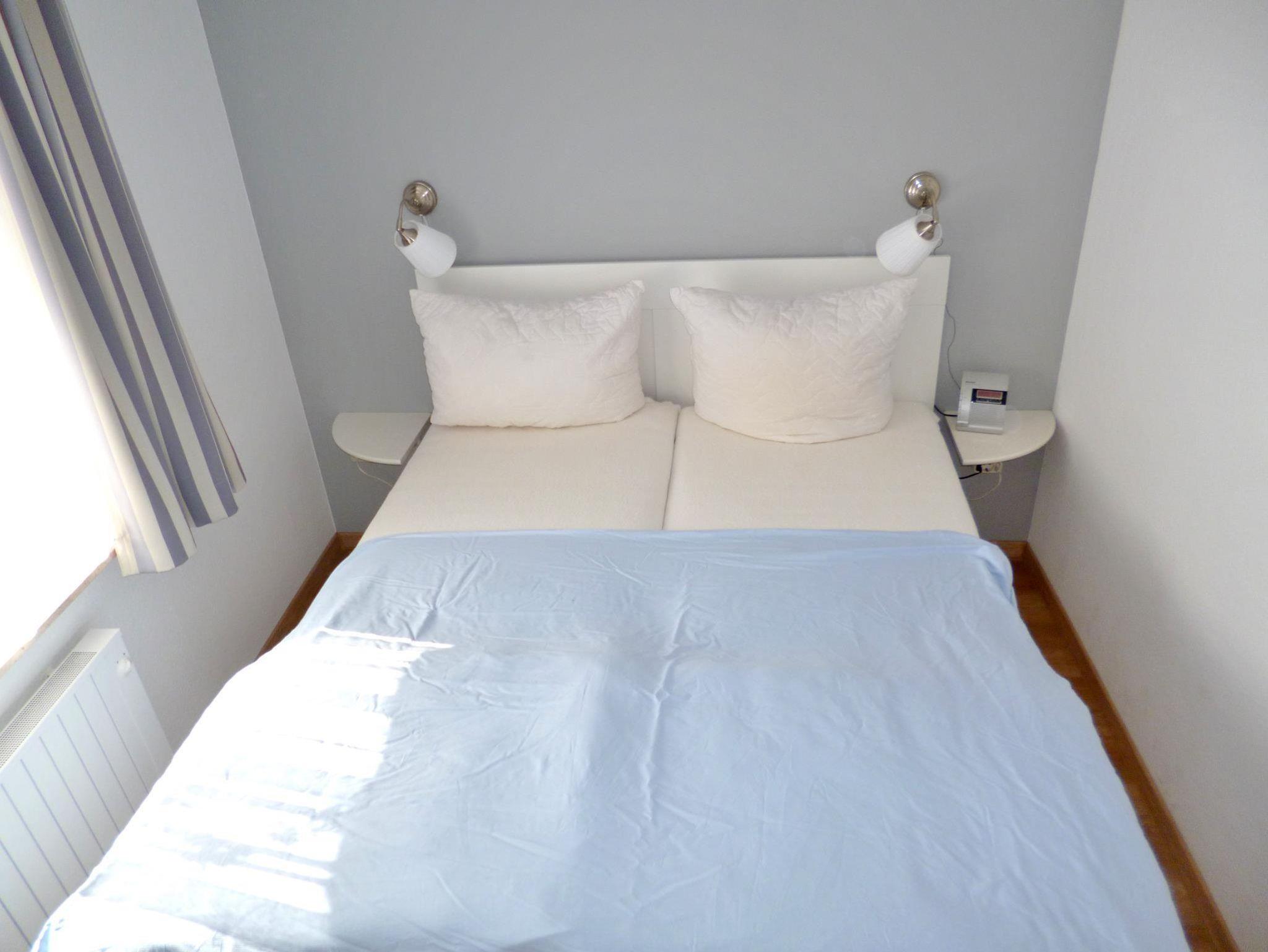 Schlafzimmer: Doppelbett 2,00 x 1,60 m, 2 Ablagen, Kleiderschrank, Stuhl, neue Direktheizung, Radiowecker
