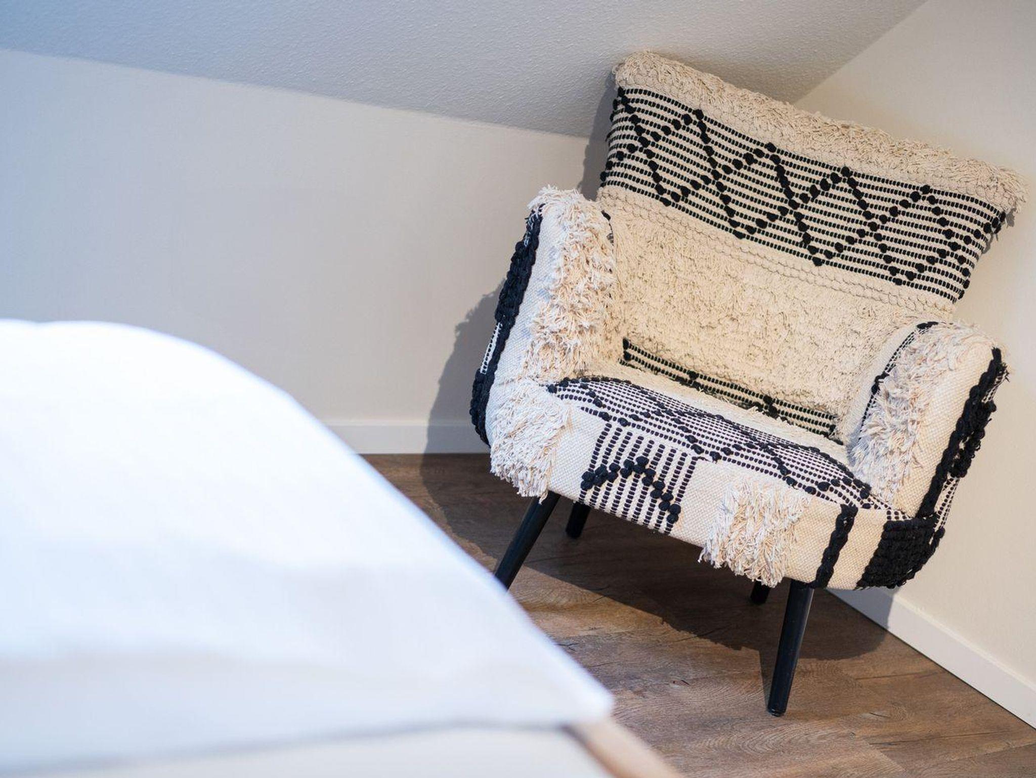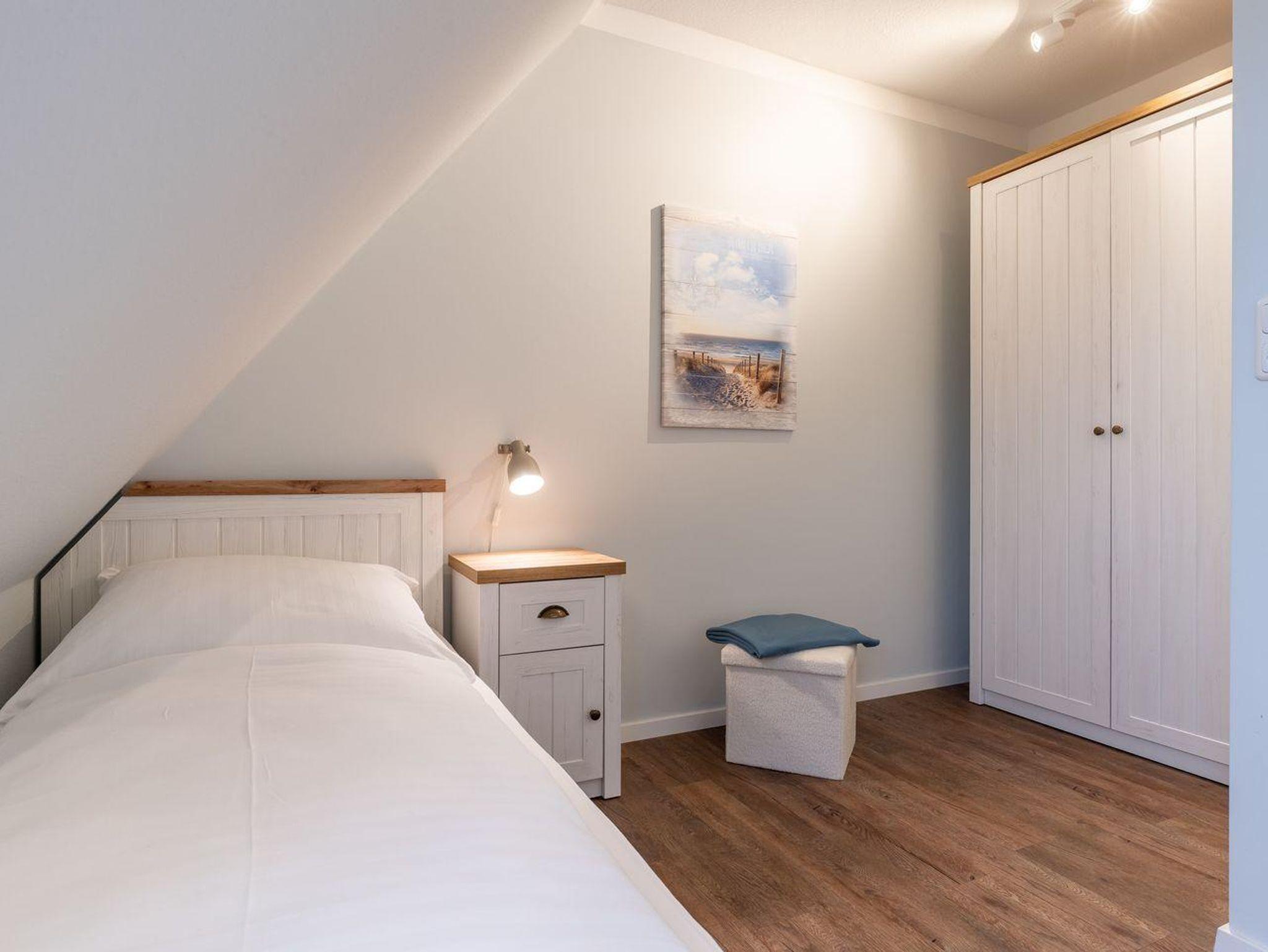 Obergeschoss: 2 Schlafräume (1 Doppelbett + TV, 2 Einzelbetten).