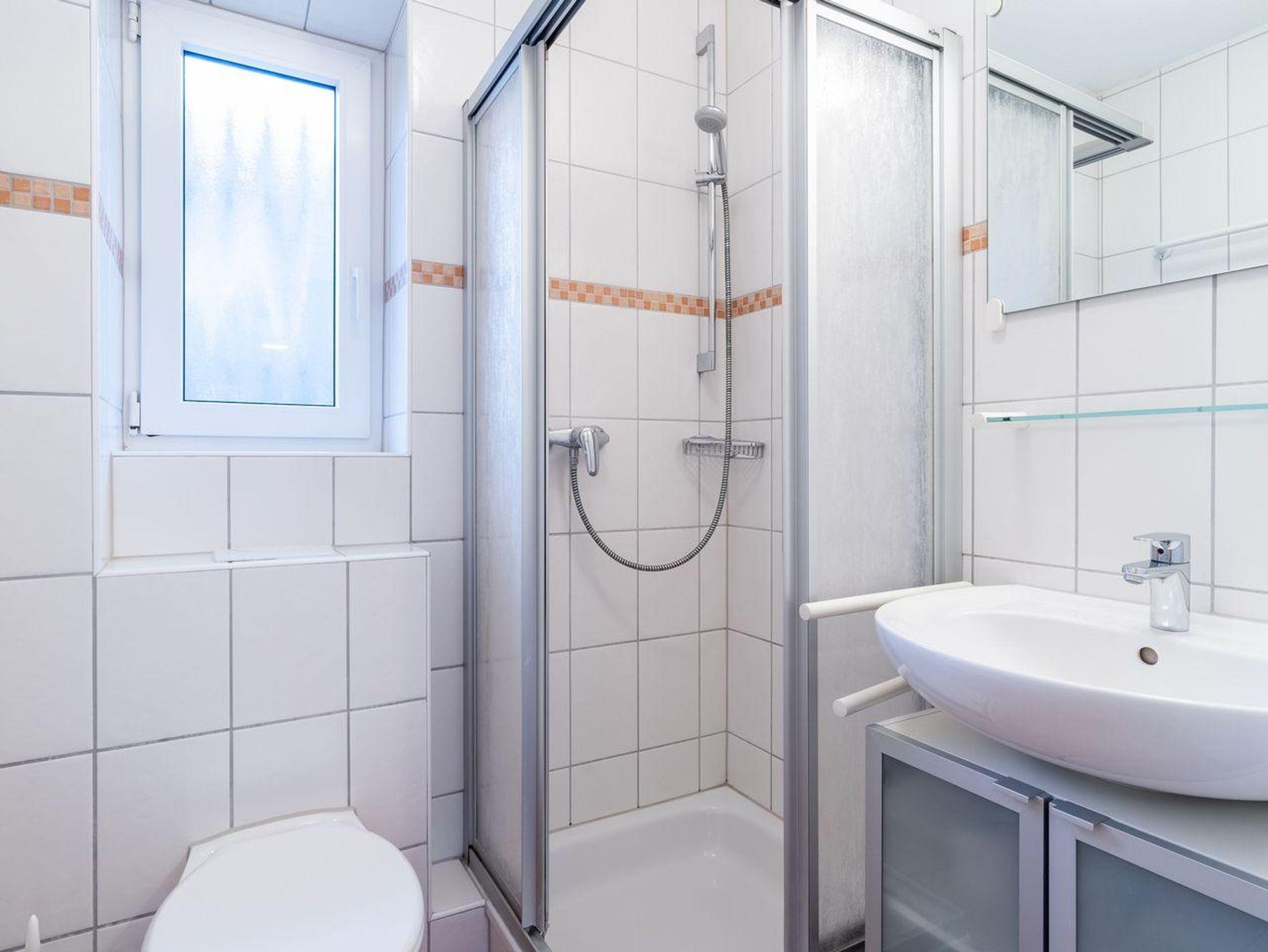 Erdgeschoss: Wohnzimmer mit Küche, Duschbad, Abstellraum.