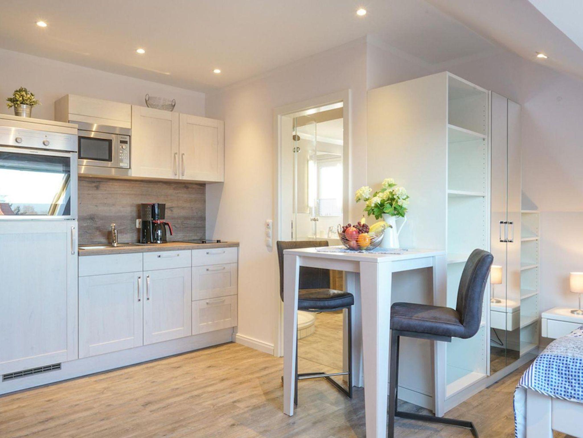 Klein und gemütlich ist diese Wohnung im 2. Obergeschoss. Idealer Ausgangspunkt, um zu Zweit alle Vorteile des Strandlebens von St. Peter-Ording zu genießen. Die Ferienwohnung im 2 Obergeschoss mit ca. 30qm bietet Ihnen ein gemütliches Wohnzimmer. Hier erwartet Sie eine Couch sowie Couchtisch. Des weiteren ist ein Esstisch mit 2 Stühlen vorhanden. Die Küche der Wohnung ist voll ausgestattet mit einem Cerankochfeld mit Backofen, Dunstabzugshaube, Geschirr, Kaffeemaschine, Kochtöpfe, Kühlschrank, Toaster und einem Wasserkocher.