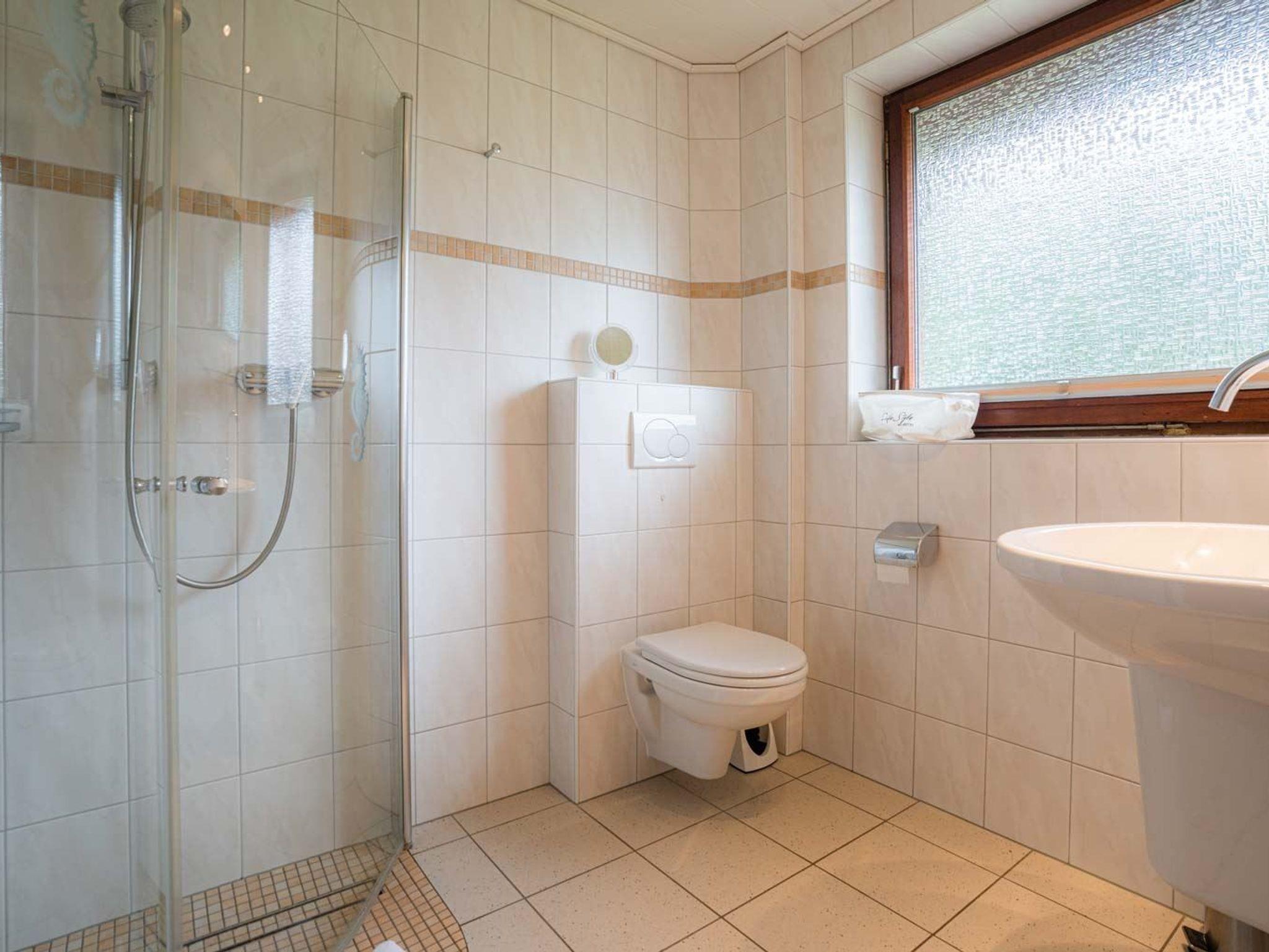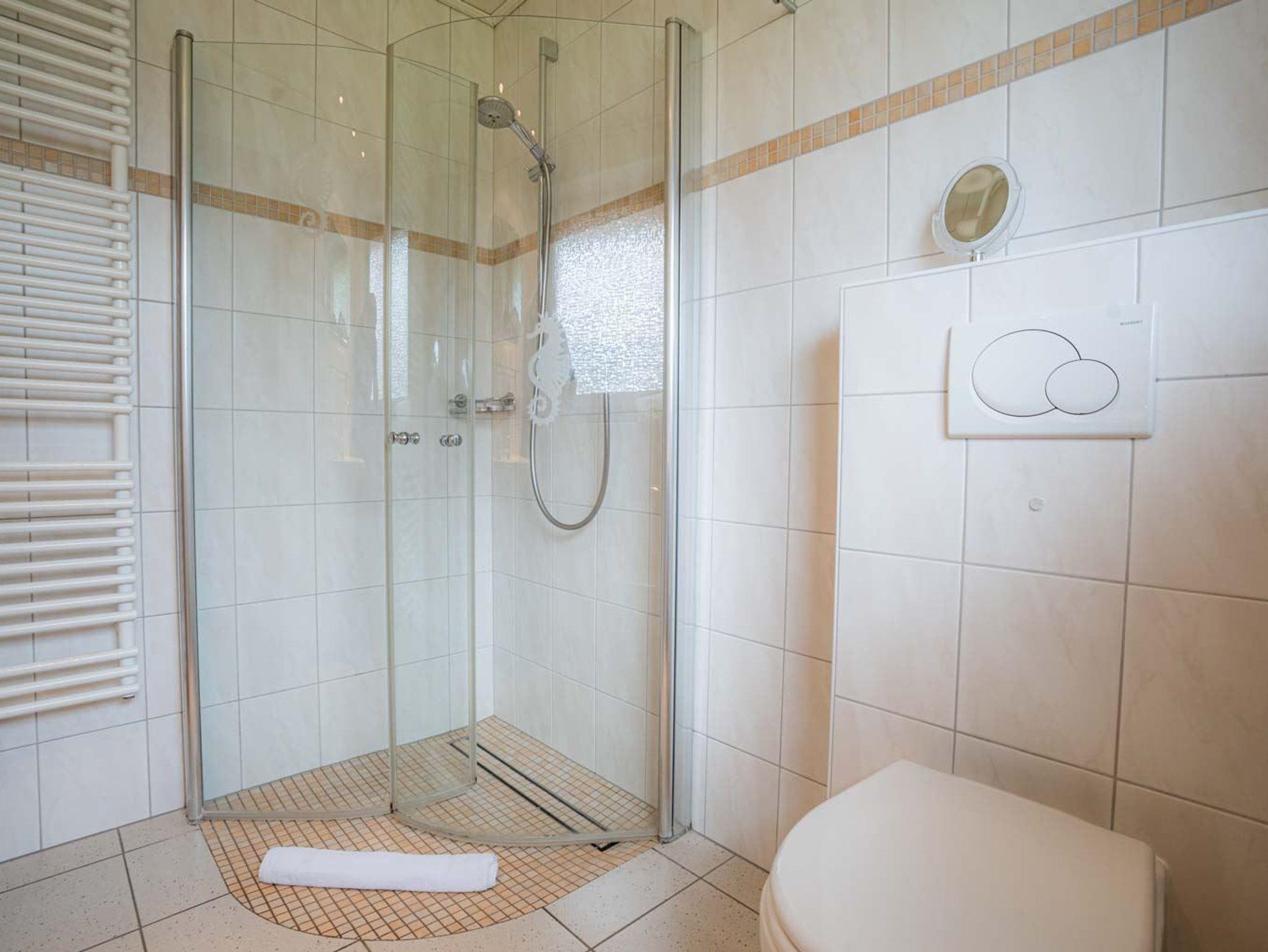 Badezimmer (Duschbad) mit bodengleicher Dusche, WC, Tageslicht und Handtuchwärmer.
