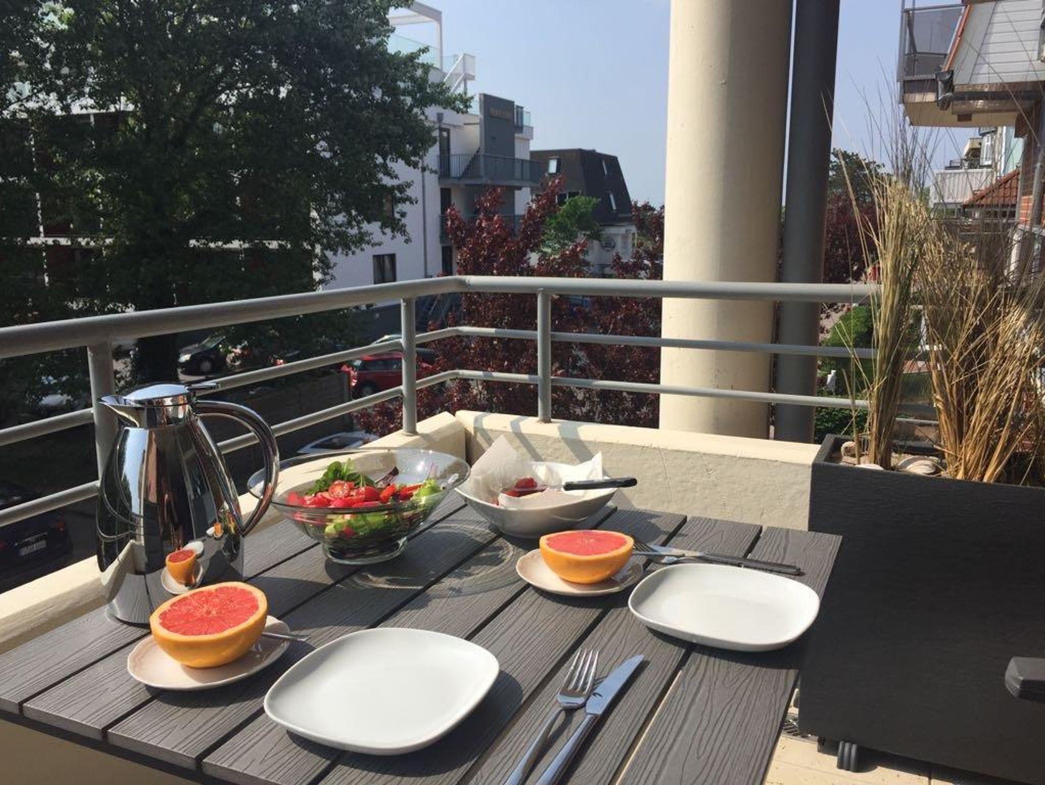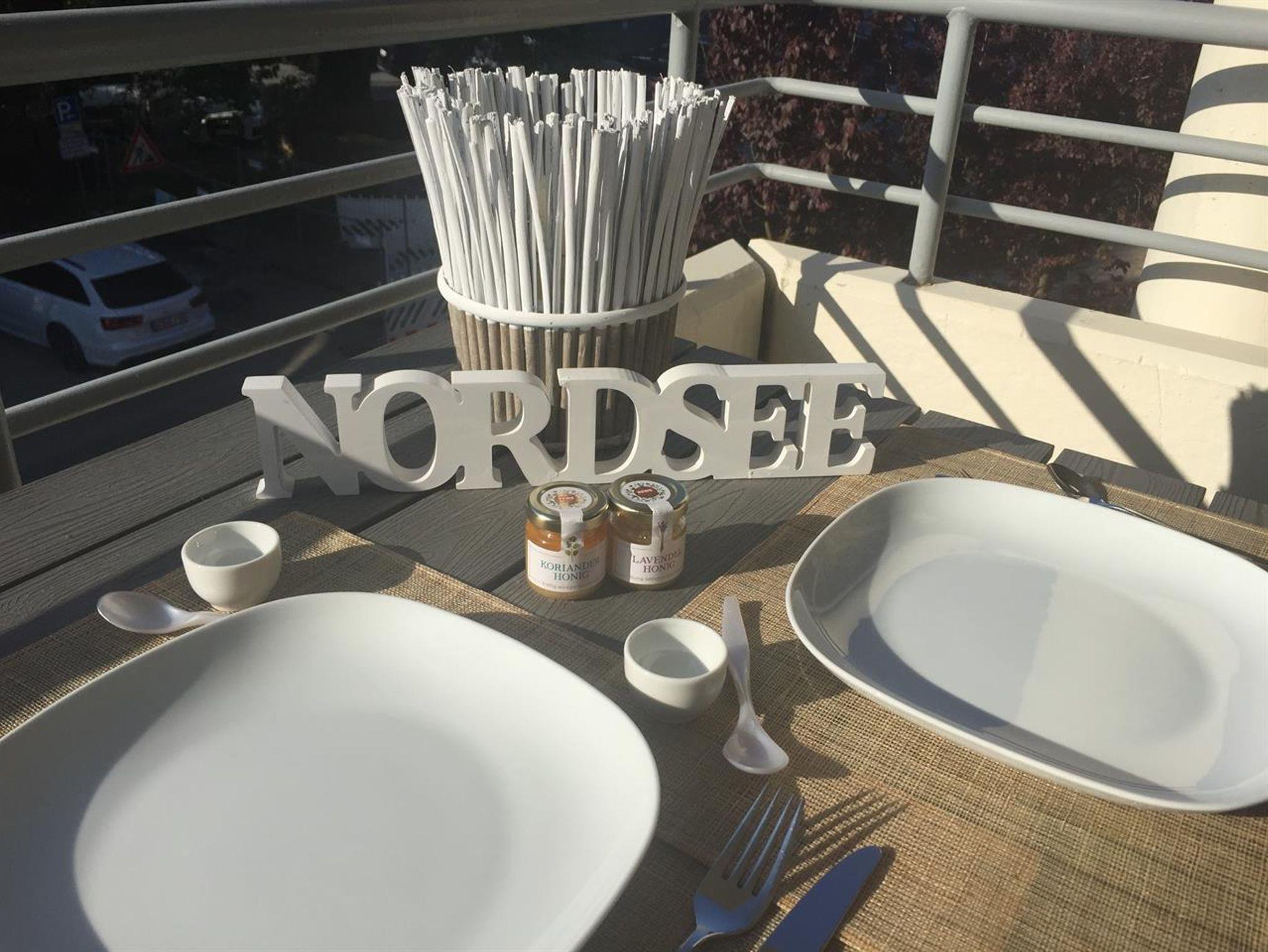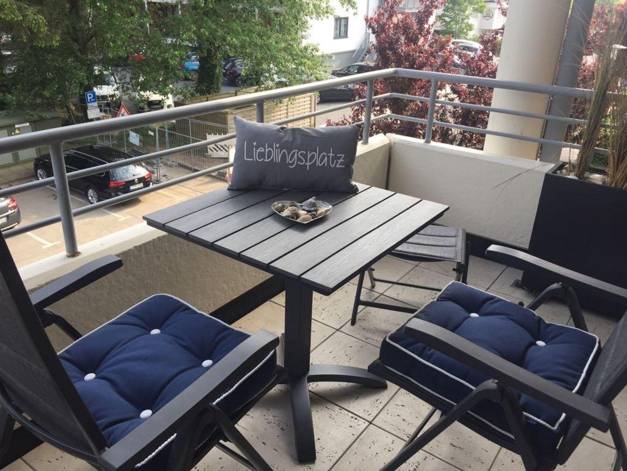 Auf dem Balkon finden Sie einen Tisch, zwei verstellbare Stühle mit Hockern ,die zusammen mit den Hockern als Liege nutzbar sind.