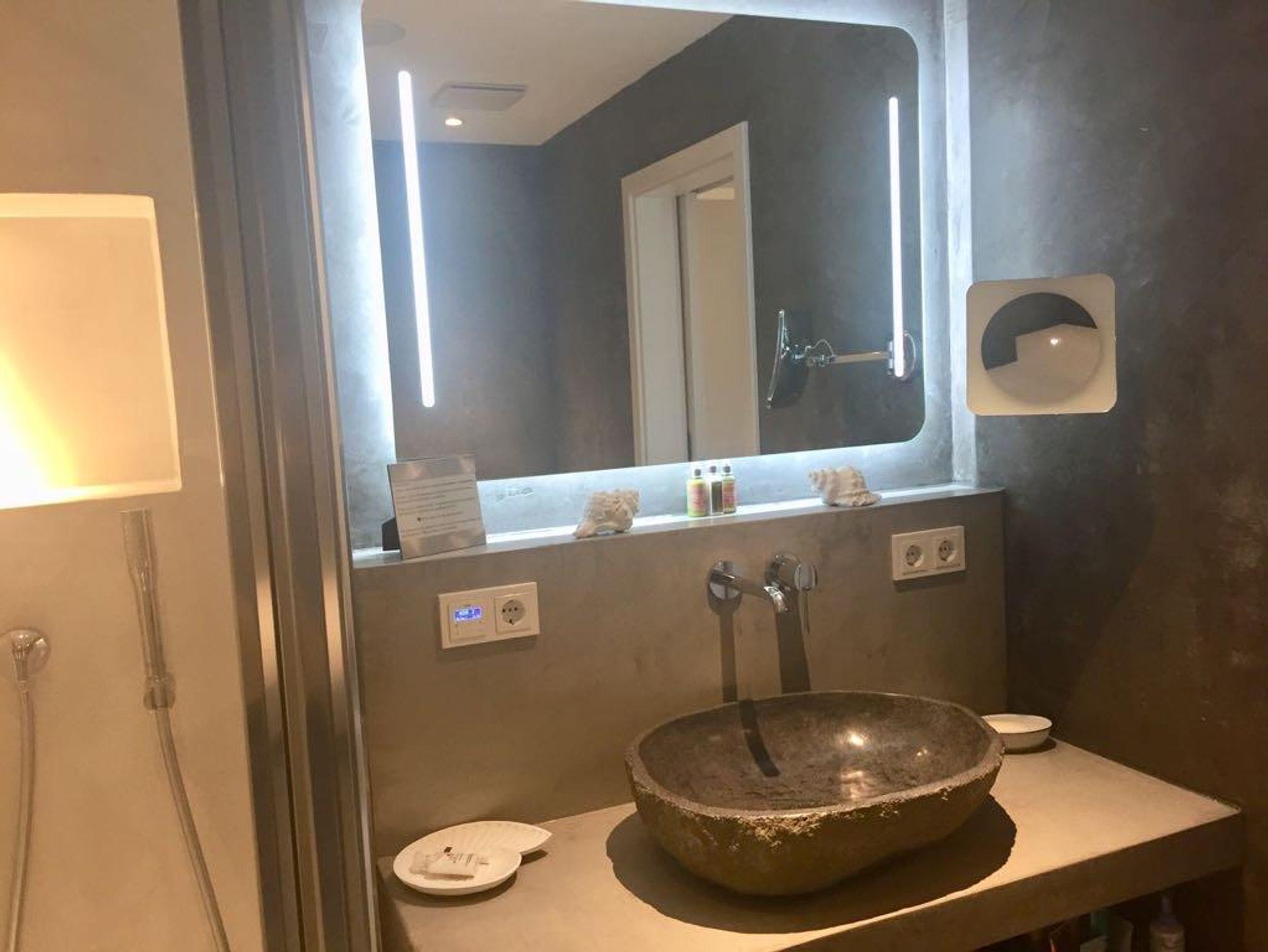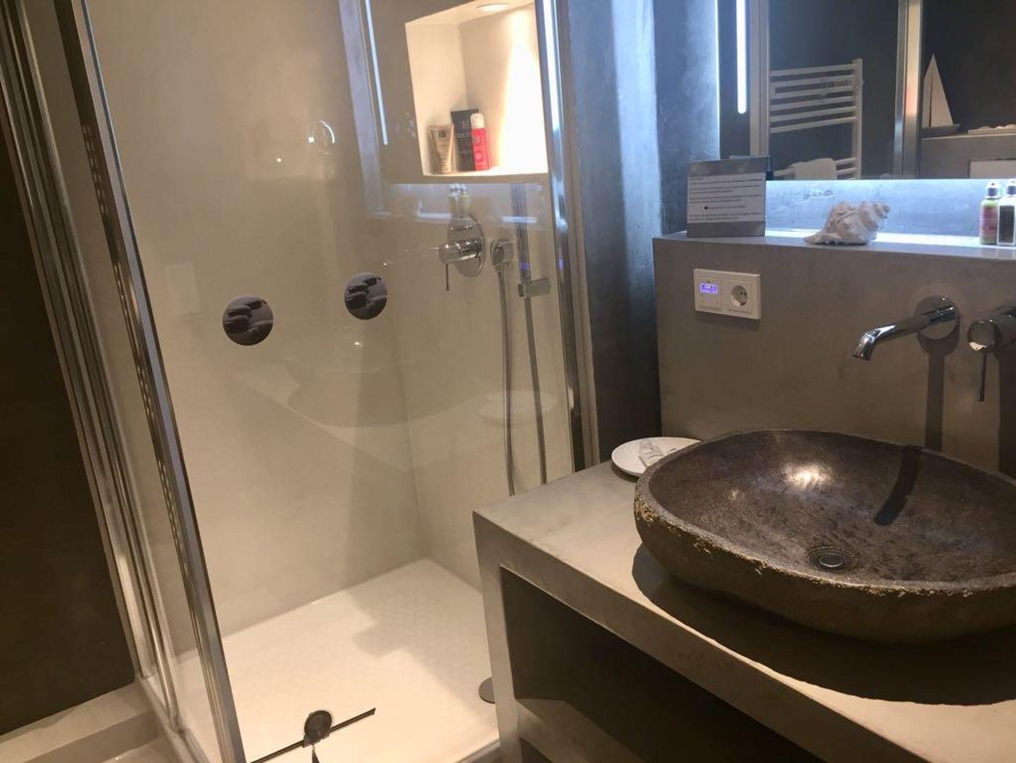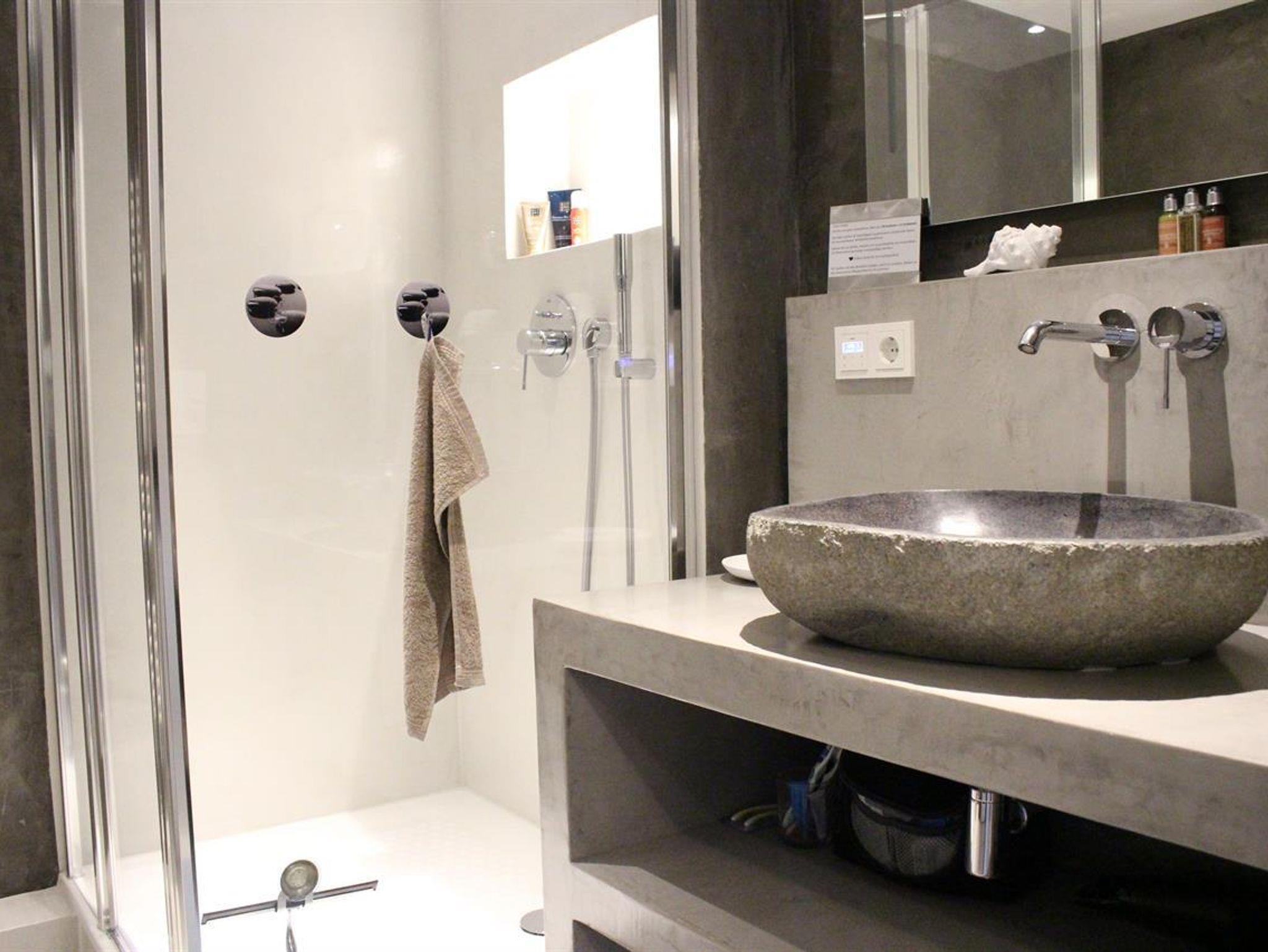 Unser Bad ist ein besonderes Schmuckstück: Fußboden und Wände sind aus Terrastone und Ecobeton. Diese Materialien sind atmungsaktiv und regulieren die Feuchtigkeit. So wird ein optimales Raumklima geschaffen, in dem man sich gerne aufhalten mag.Das passenden Licht und Musik schaffen so eine kleine Wellness Oase. Ein Waschtisch aus Ecobeton, ein echter Flussstein als Waschbecken, ein WC, ein dimmbarer,beheizbarer, beleuchteter Spiegel plus Schminkspiegel, eine Deckenlampe, ein Föhn, ein beheizbarer Handtuchhalter, ein Musikradio zum Wohlfühlen und Mitsingen, eine Lüftungsanlage und Waschtrockner machen alles komplett.
