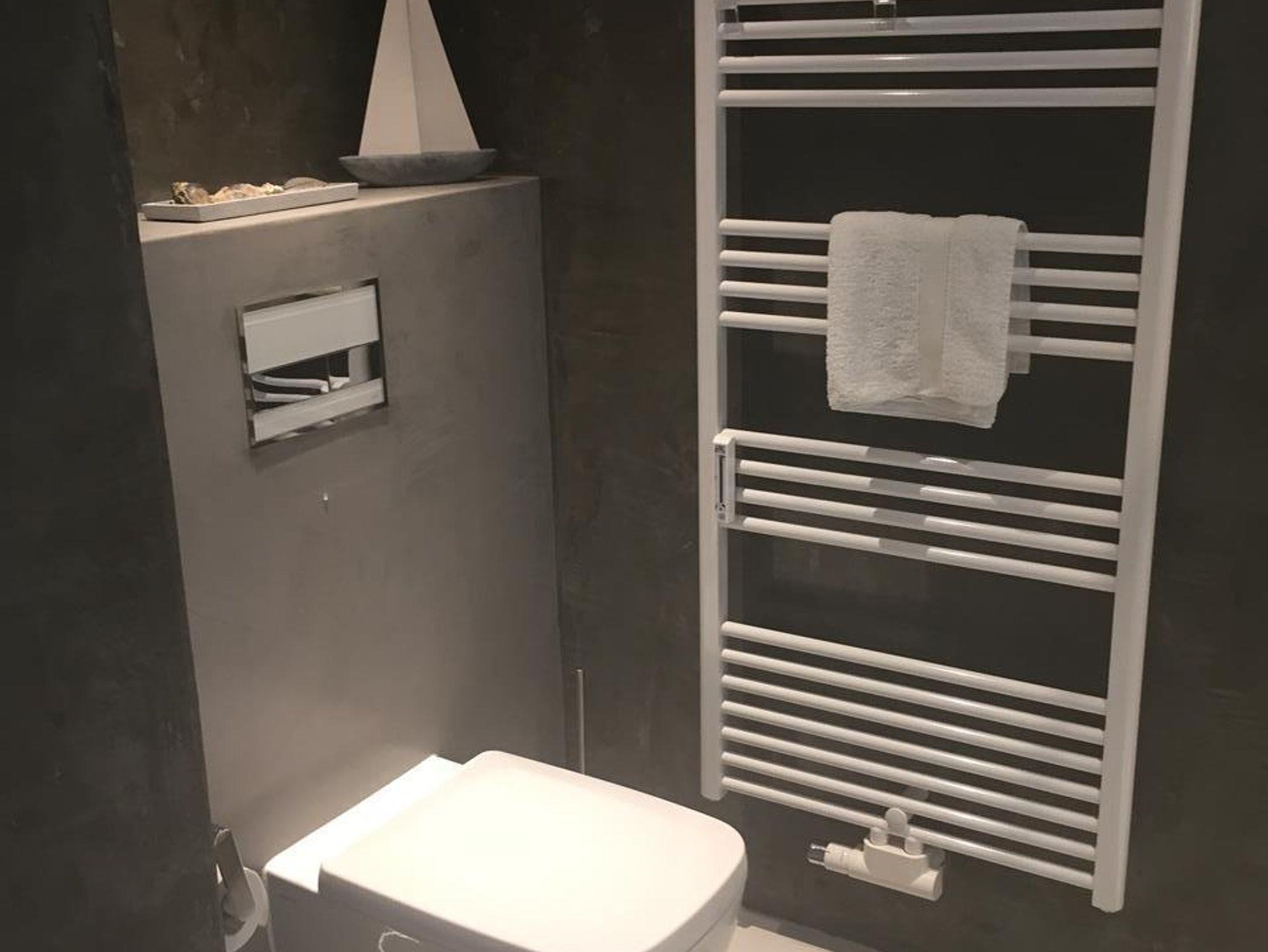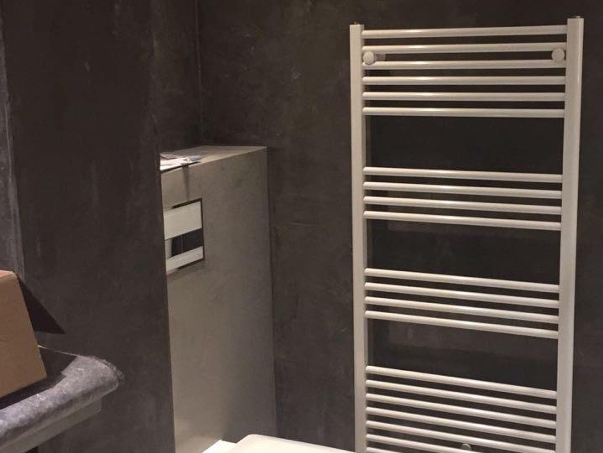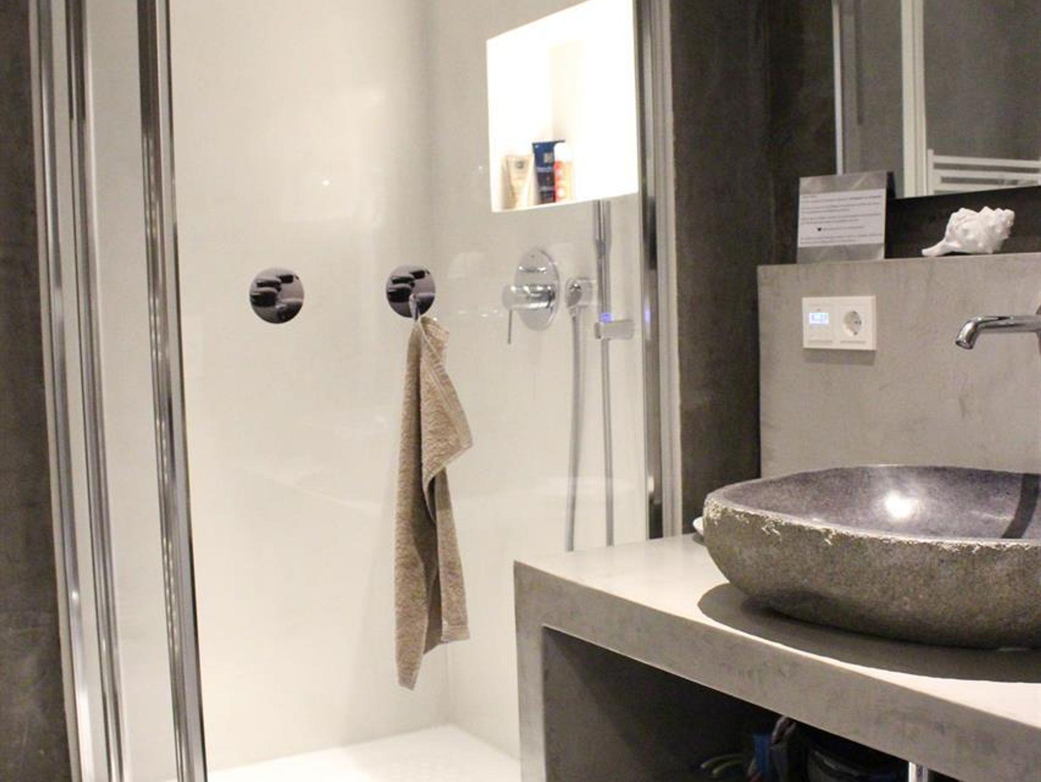 Unser Bad ist ein besonderes Schmuckstück: Fußboden und Wände sind aus Terrastone und Ecobeton. Diese Materialien sind atmungsaktiv und regulieren die Feuchtigkeit. So wird ein optimales Raumklima geschaffen, in dem man sich gerne aufhalten mag.Das passenden Licht und Musik schaffen so eine kleine Wellness Oase. Ein Waschtisch aus Ecobeton, ein echter Flussstein als Waschbecken, ein WC, ein dimmbarer,beheizbarer, beleuchteter Spiegel plus Schminkspiegel, eine Deckenlampe, ein Föhn, ein beheizbarer Handtuchhalter, ein Musikradio zum Wohlfühlen und Mitsingen, eine Lüftungsanlage und Waschtrockner machen alles komplett.