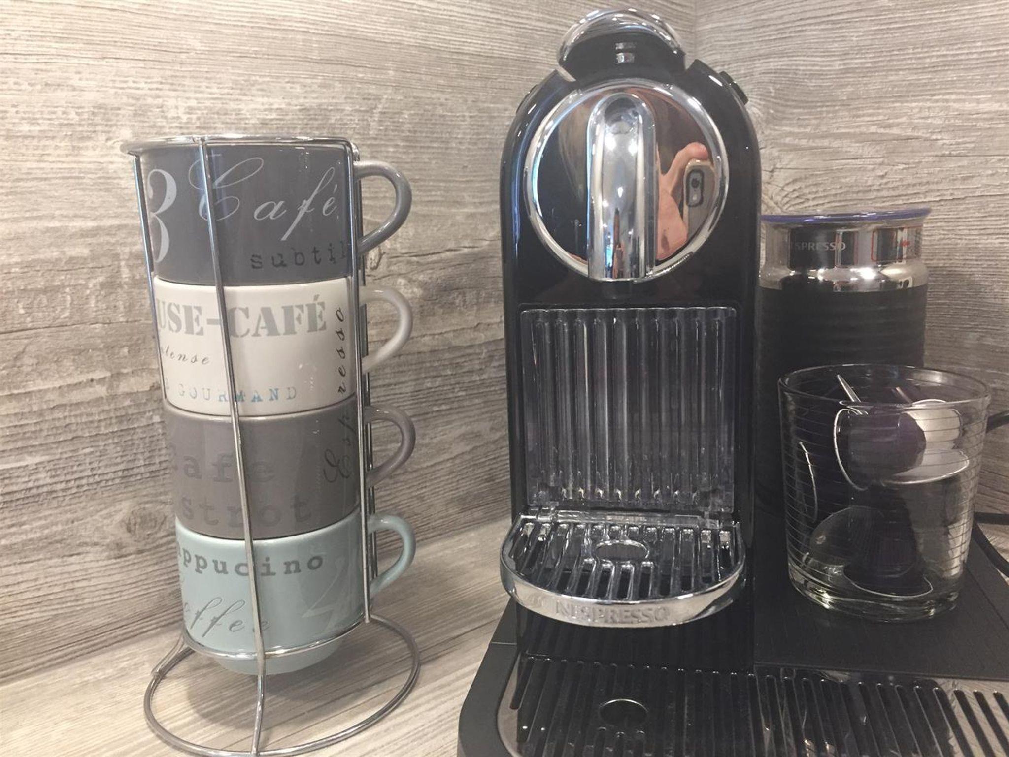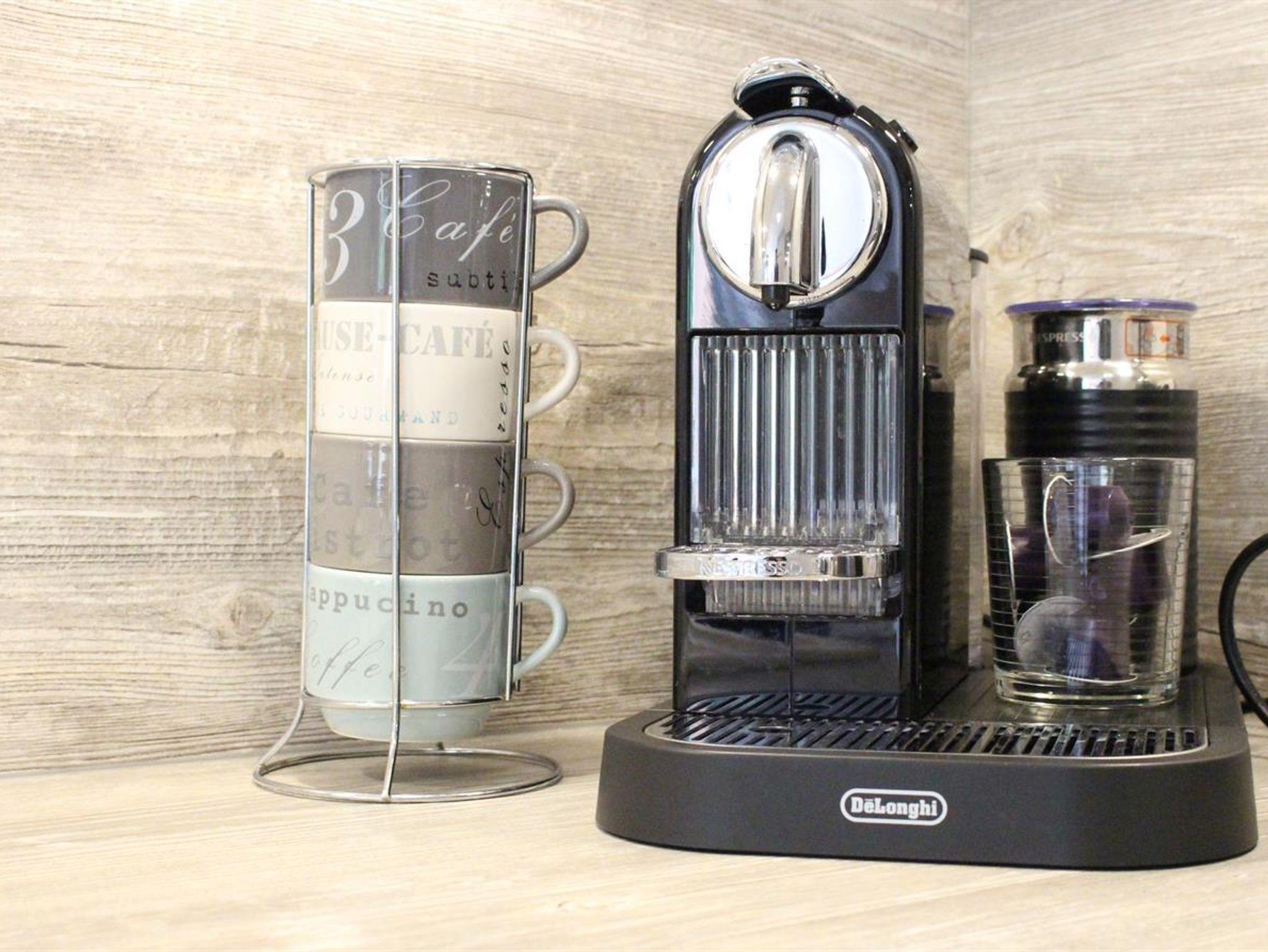 Es gibt eine neue, moderne Einbauküche ( Baujahr 2017),der Herd hat ein 4-Platten-Ceranfeld, eine extra leise Dunstabzugshaube, eine sehr leise Geschirrspülmaschine, einen Kühlschrank mit Tiefkühlfach, eine Nespresso Maschine, -dem Trend folgend und der Umwelt zuliebe kann man natürlich auch frischen Kaffee filtern mit dem vorhandenen Melitta-Filter 1X4,oder eine normale Kaffemaschine mit Filtern 1X4, einen Wasserkocher, einen Toaster, Geschirr, Besteck, Gläser für jeden Anlass, Haushalts- und Kochutensilien, Kochtöpfe, Pfannen , einen Messerblock uvm.