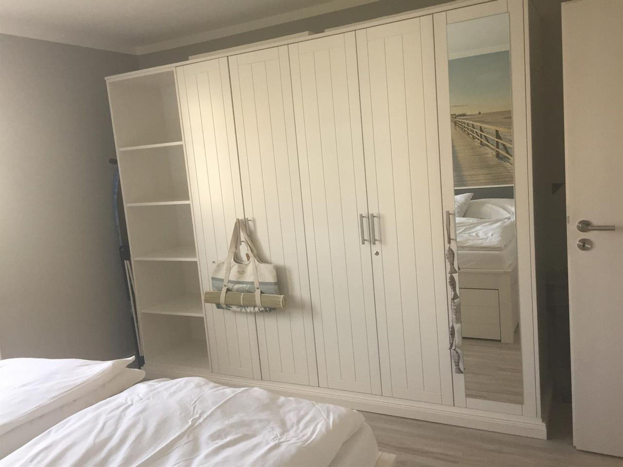 Das Doppelbett 180 x 200 cm in Komfort Einstiegshöhe hat zwei getrennte, hochwertige Matratzen mit zwei Härtegraden zum Wenden, 2 Nachttische von Ocean House, 2 Nachtischlampen aus driftwood, eine Deckenlampe, einen Kleiderschrank,offen und geschlossen, einen Ganzkörper- Spiegel, Wäscheständer, Bügelbrett, Bügeleisen, Insektenschutz vor dem Fenster, Verdunkelungsplissees