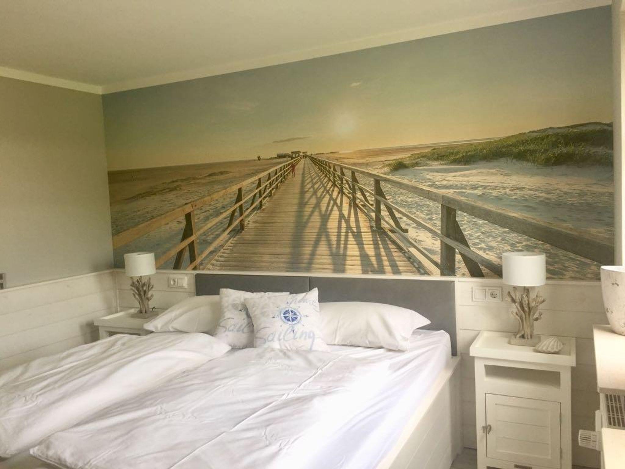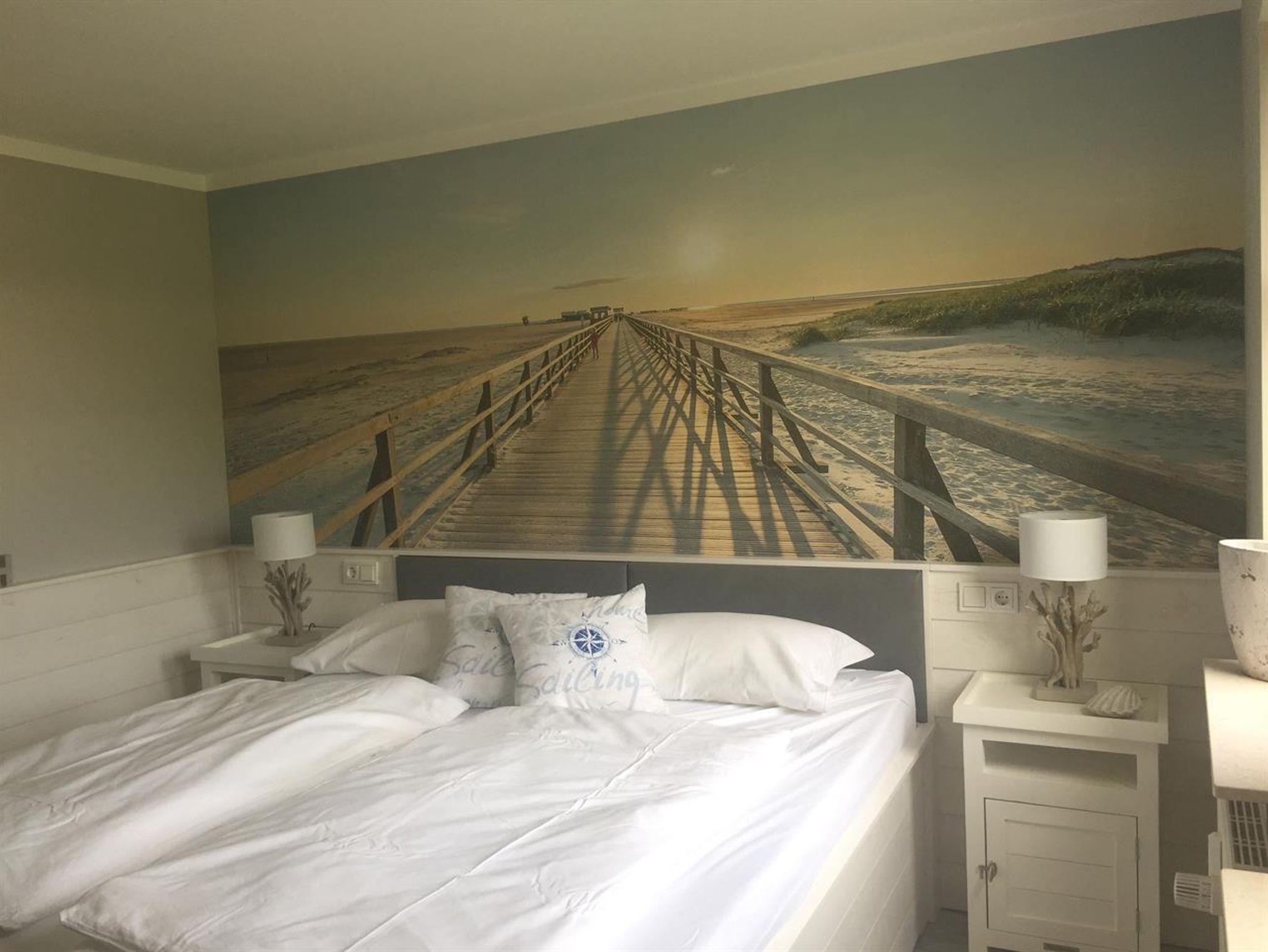 Das Schlafzimmer mit der Fototapete soll Ihnen das Gefühl geben, als wären sie noch am Strand.