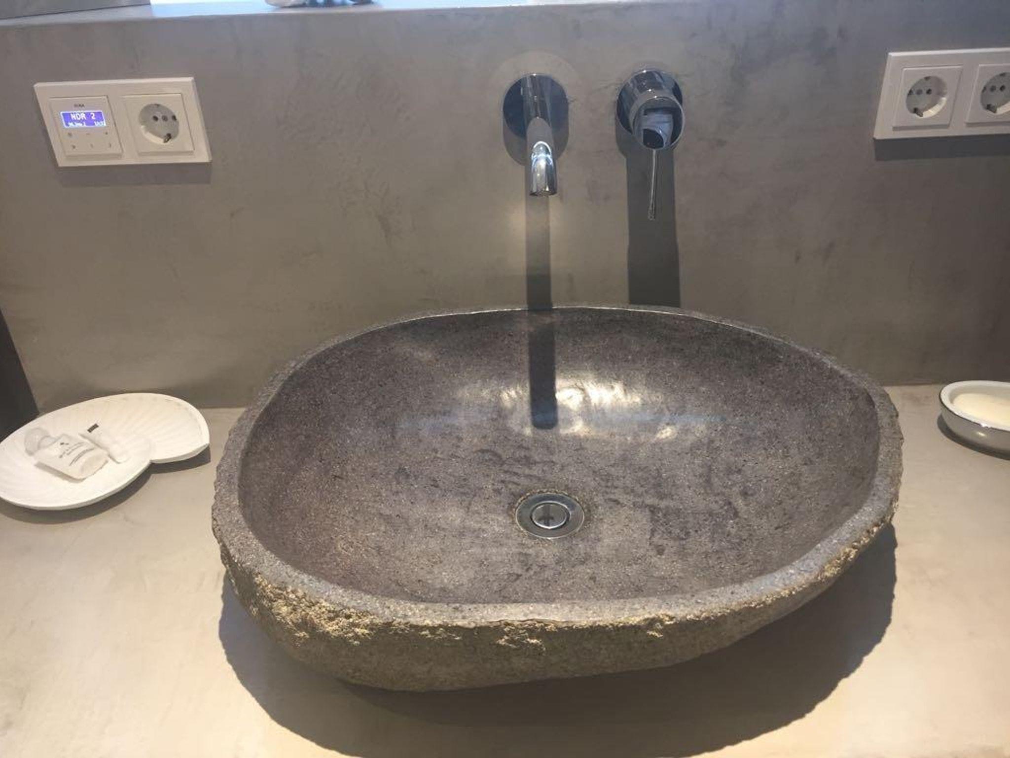 Alles Hand gemacht von Herrn Frank Hoddow , ein Waschtisch aus Ecobeton, ein echter Flussstein als Waschbecken, WC, Spiegel beleuchtet, Schminkspiegel, ebenfalls beleuchtet, Deckenlampe, Föhn, beheizbarer Handtuchhalter, Musik -radio zum Wohlfühlen und Mitsingen, Lüftungsanlage und Waschtrockner