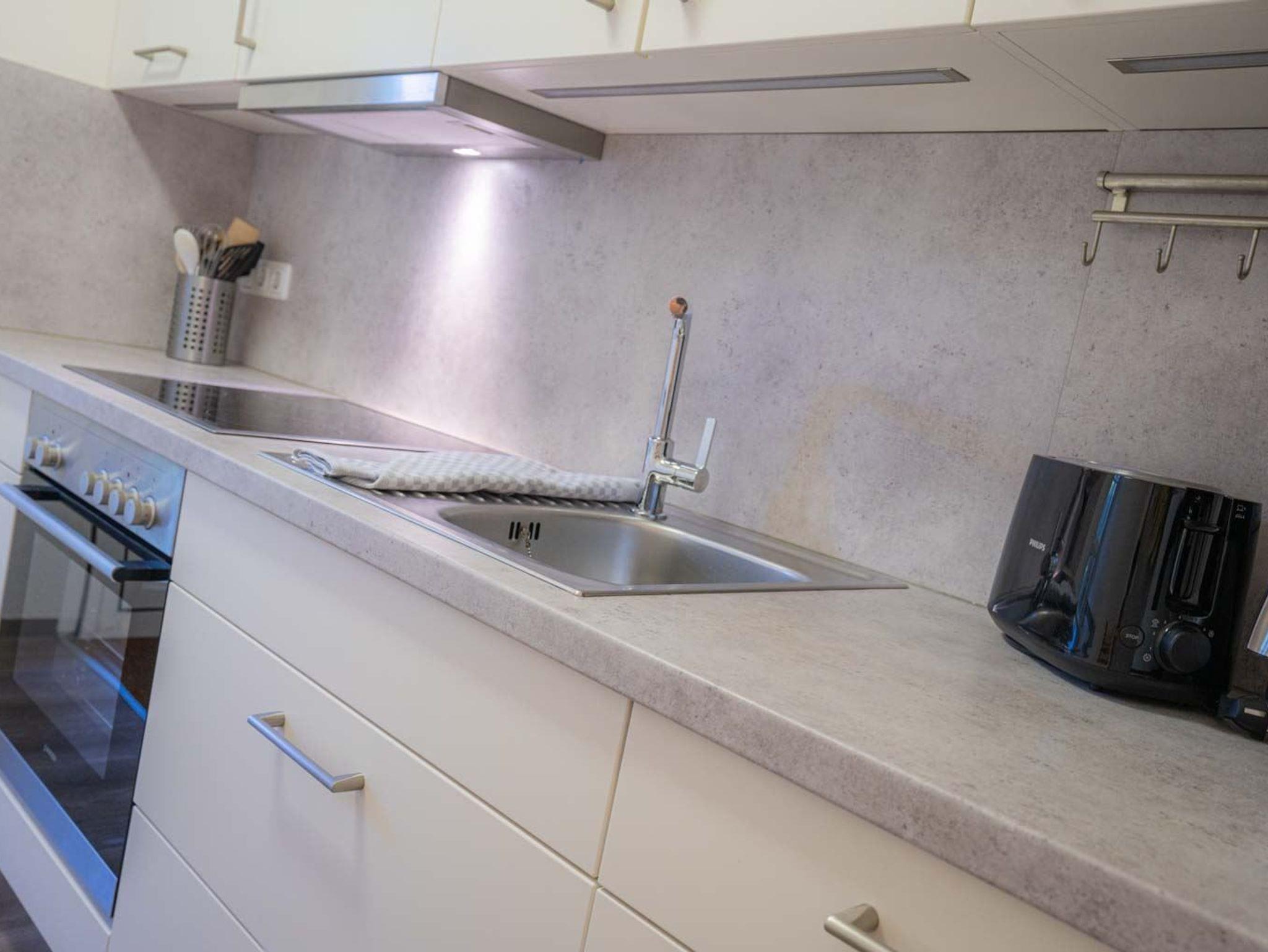 Halboffene Küche im Eingangsbereich mit Backofen, Mikrowelle, Geschirrspüler und Kühlschrank mit Gefrierfach.