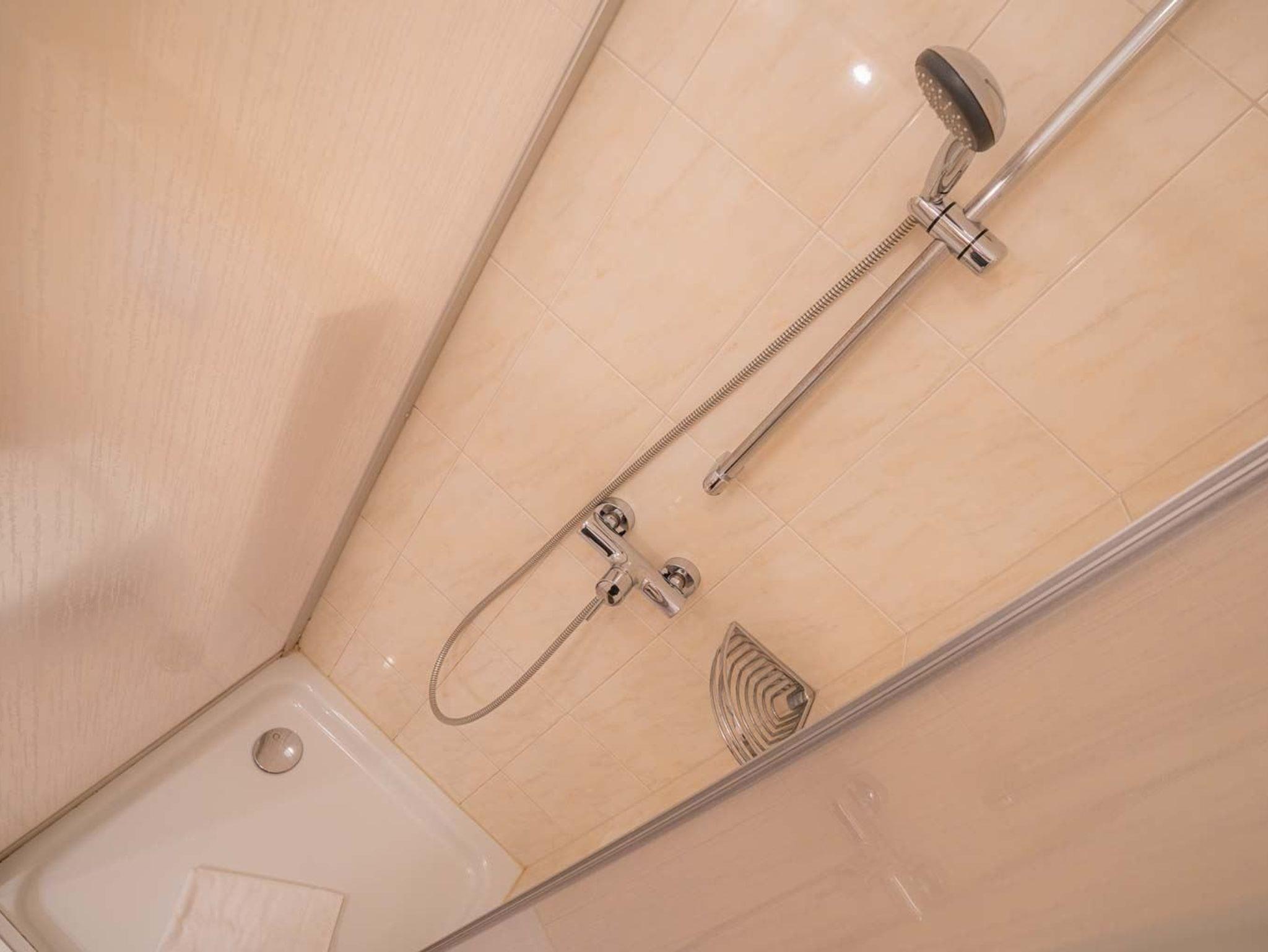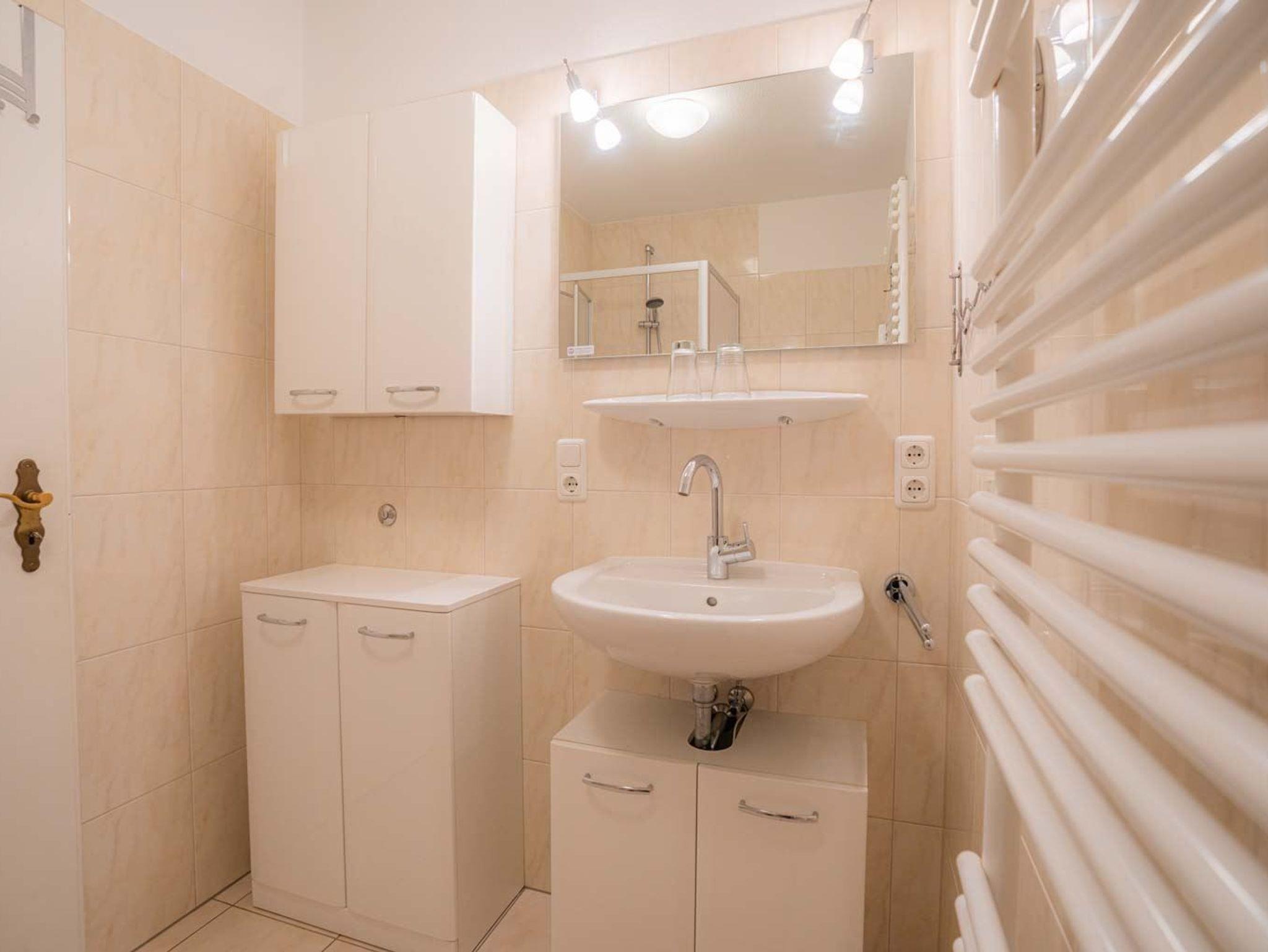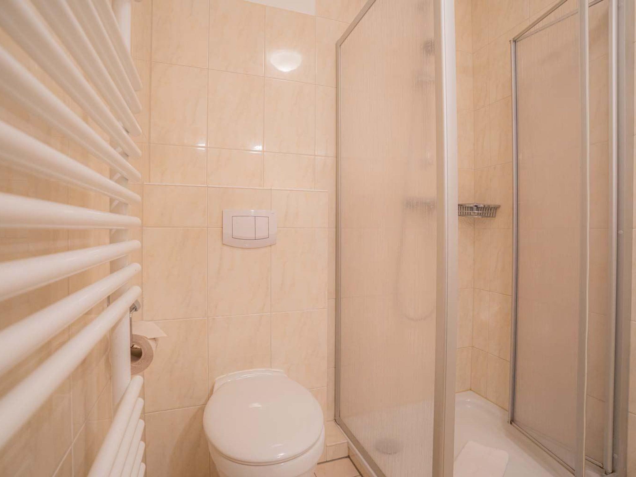 Badezimmer (Duschbad) mit Dusche (Eintritt: ca. 15cm), WC, Handtuchwärmer und Föhn.