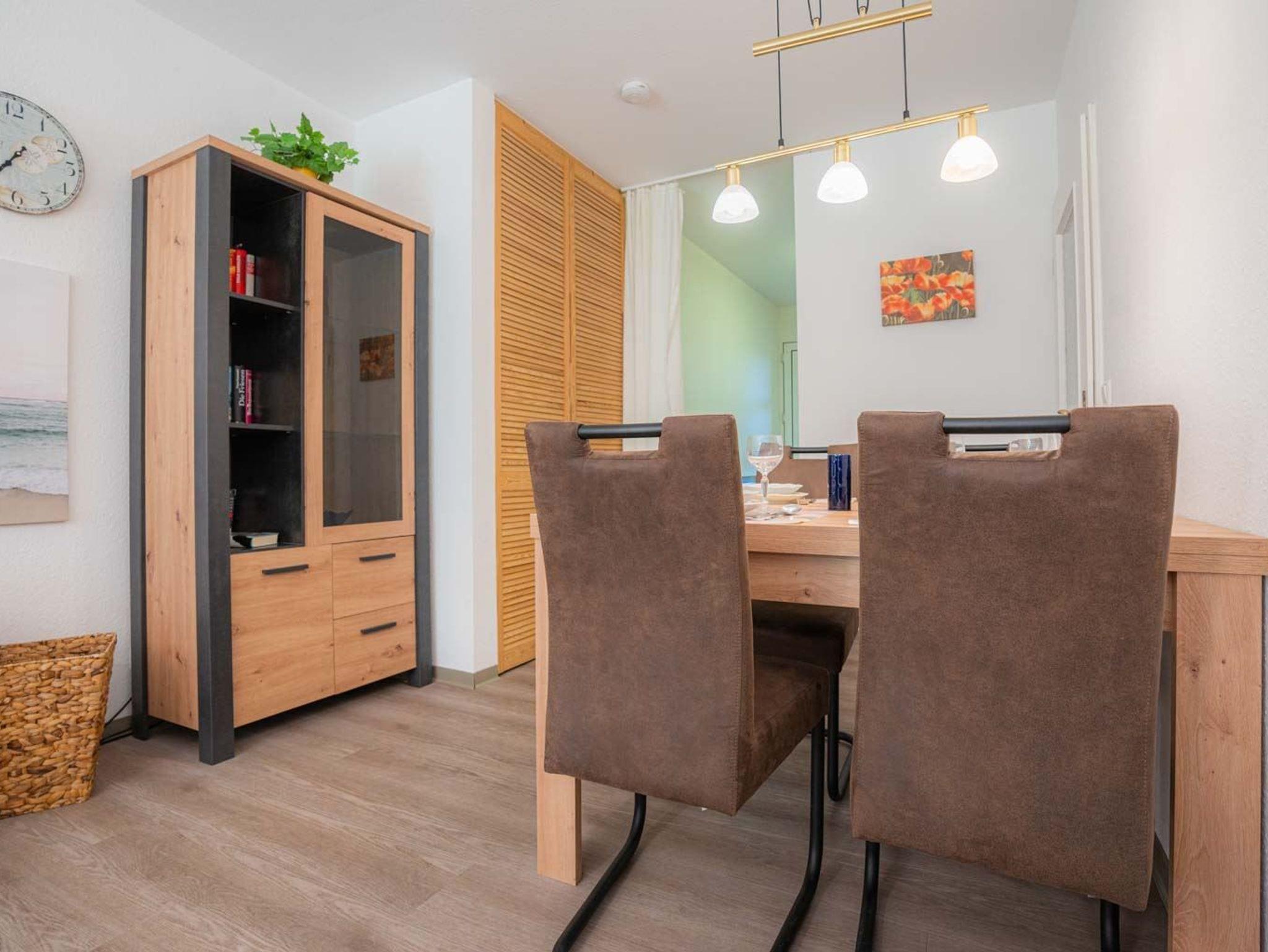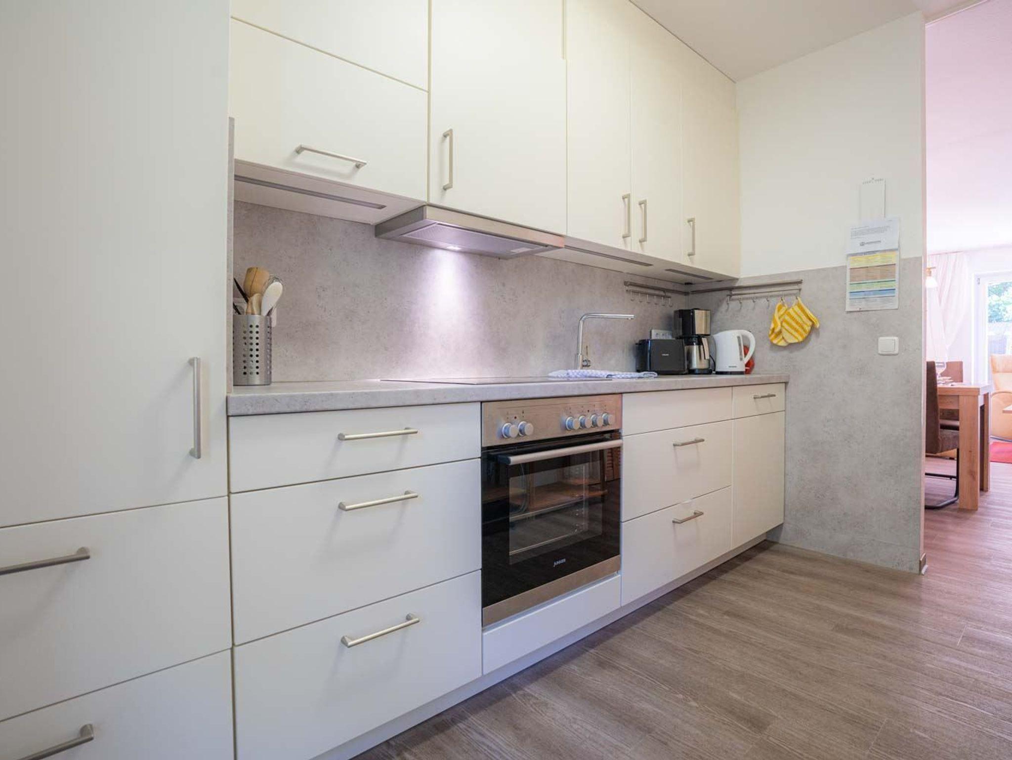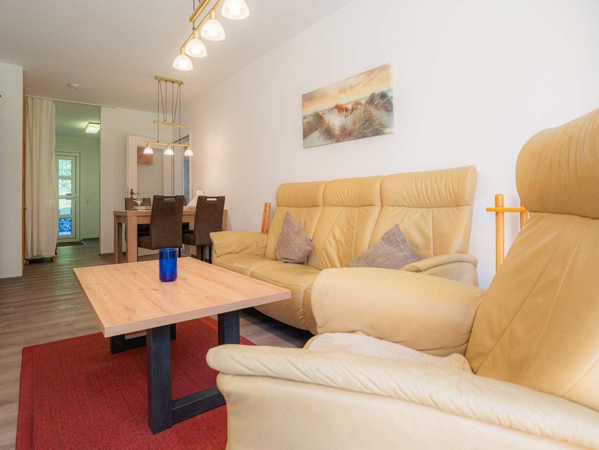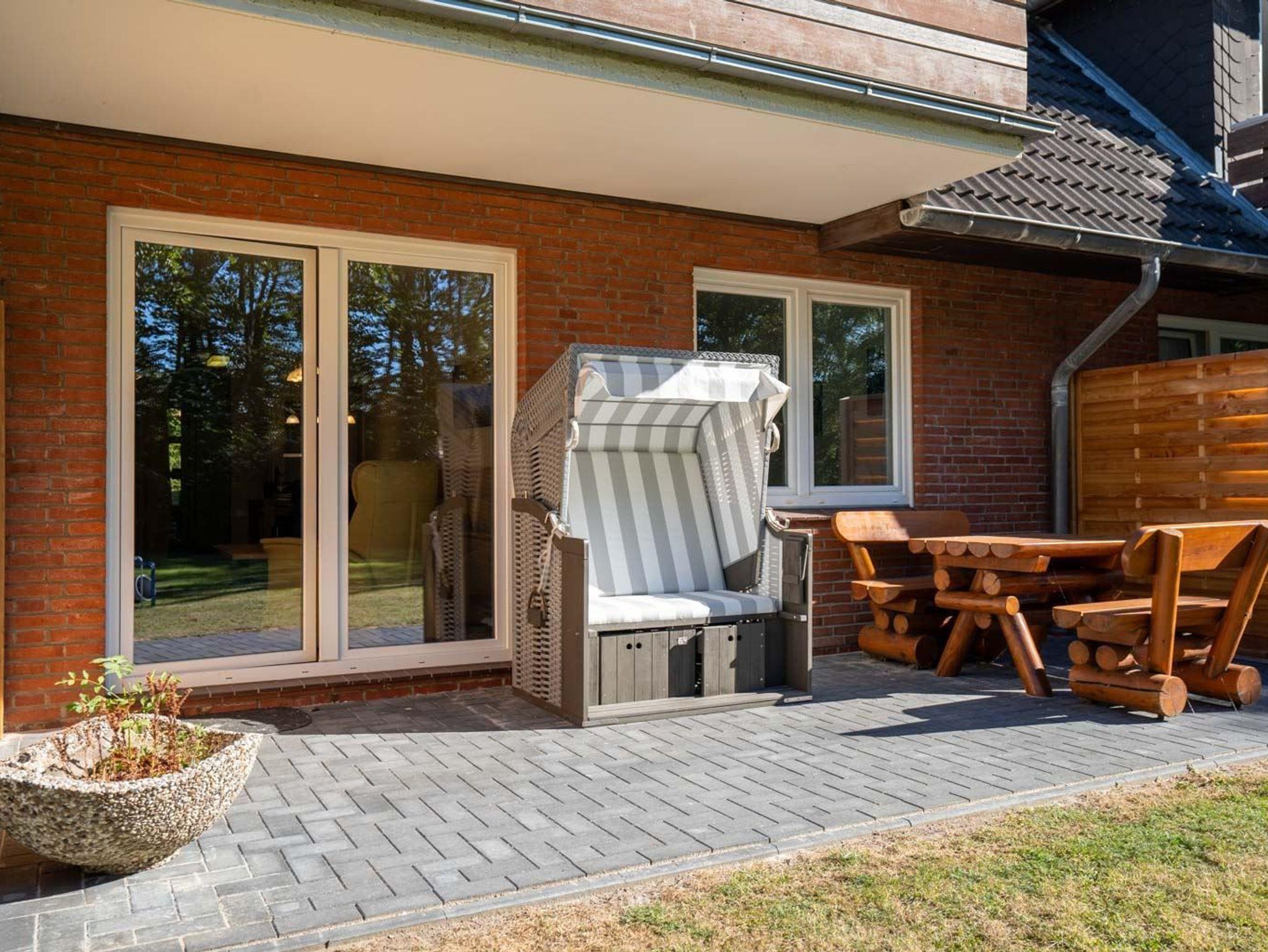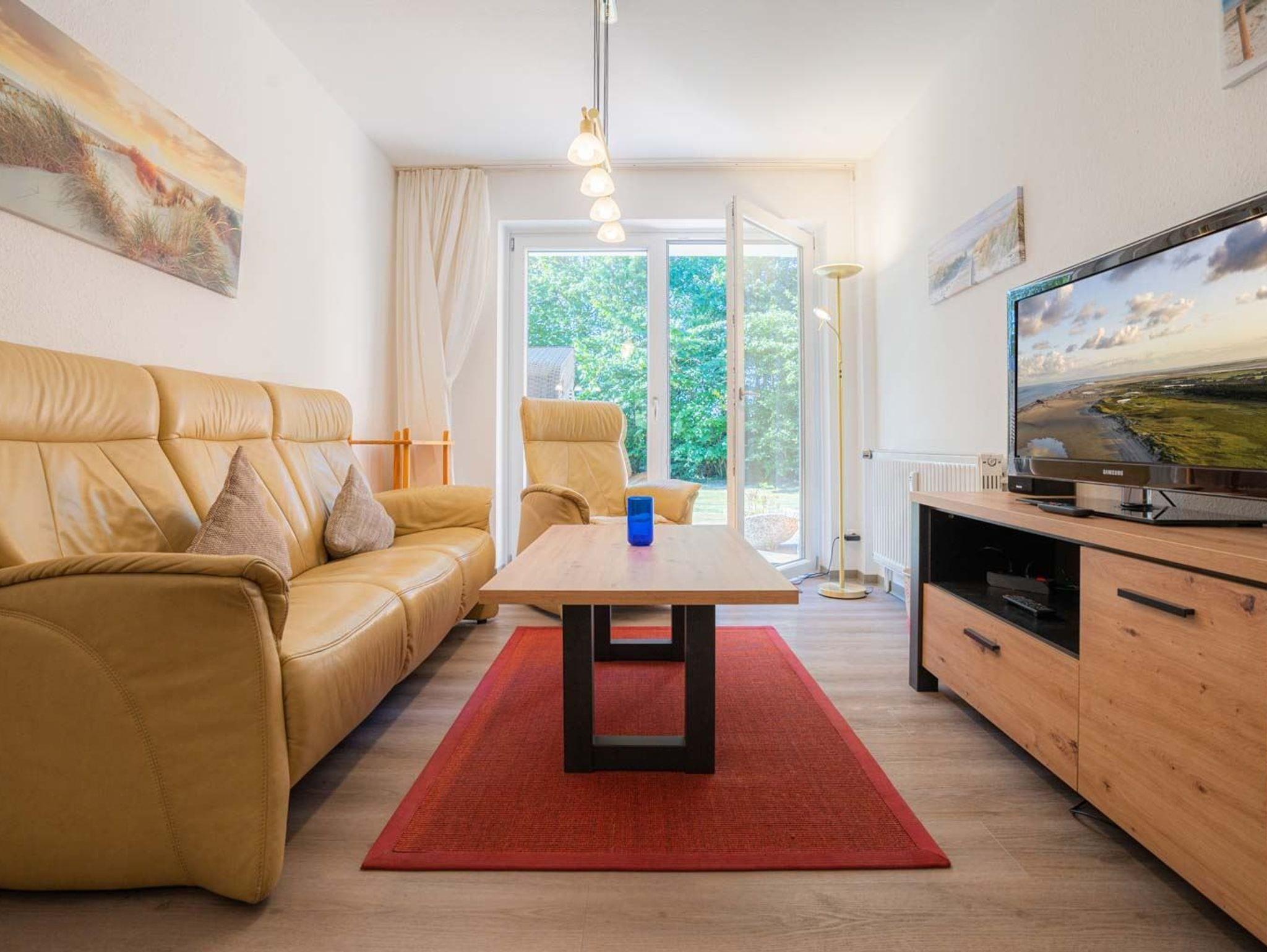 Wohnzimmer mit Sofa für 3 Personen, Sessel, TV (Kabel), Stereo-Kompaktanlage, Büchern und Esstisch mit 4 Stühlen. Abstellkammer mit Garderobe und Staubsauger. Direkter Zugang zur möblierten Gartenterrasse nach Süden mit Strandkorb.