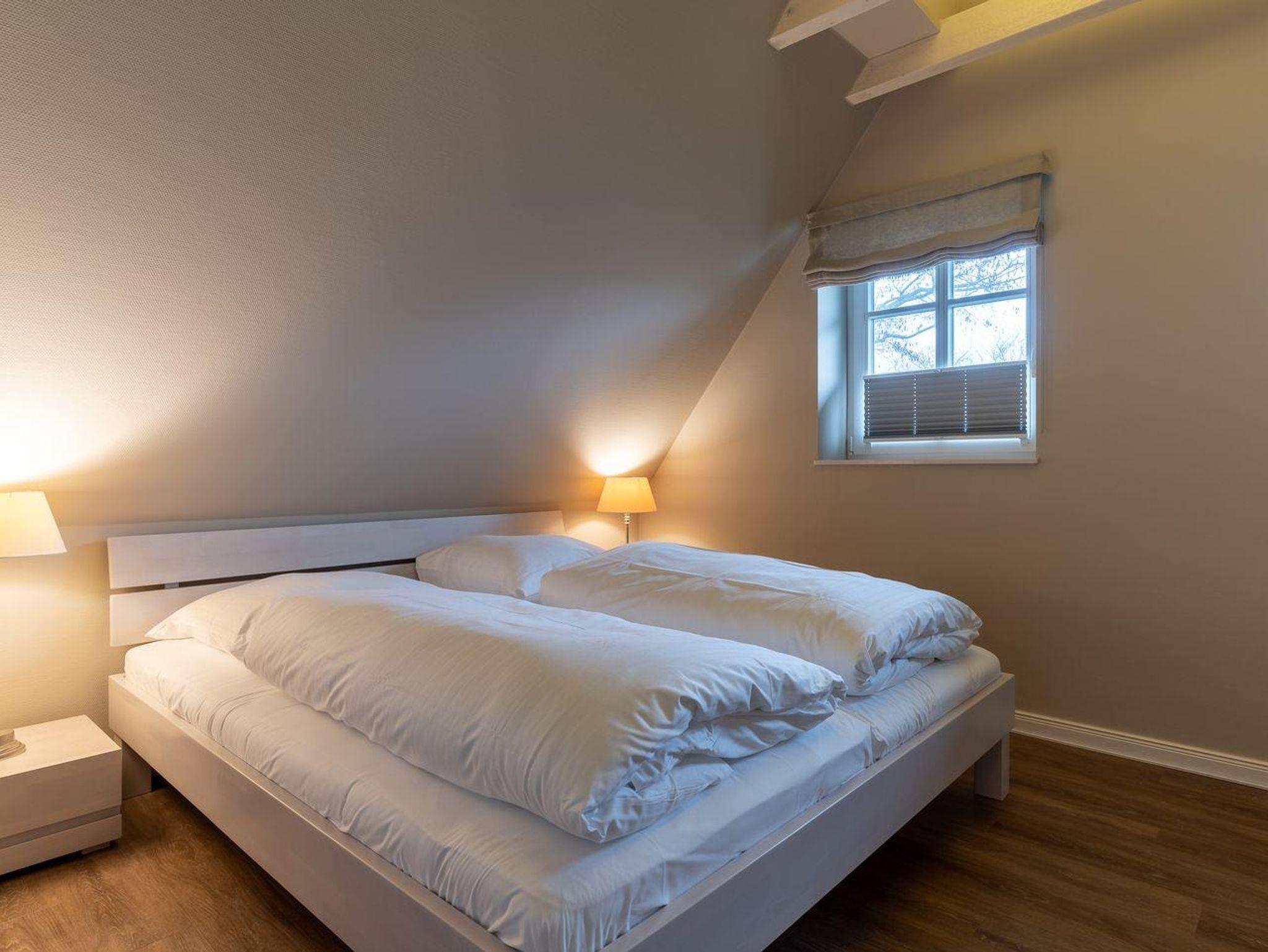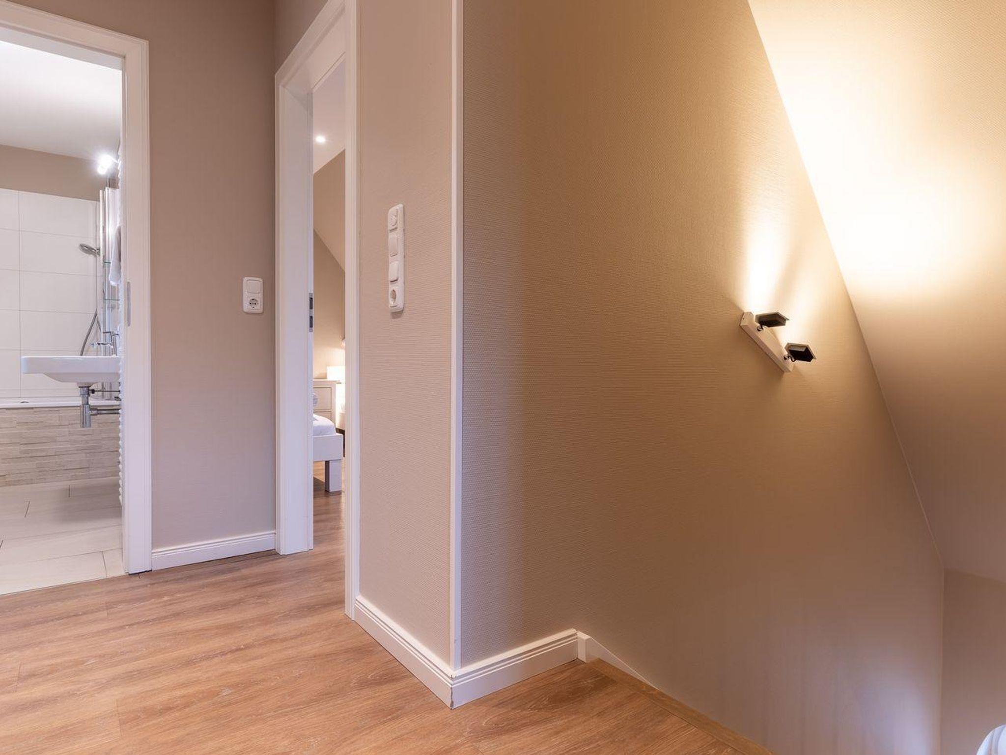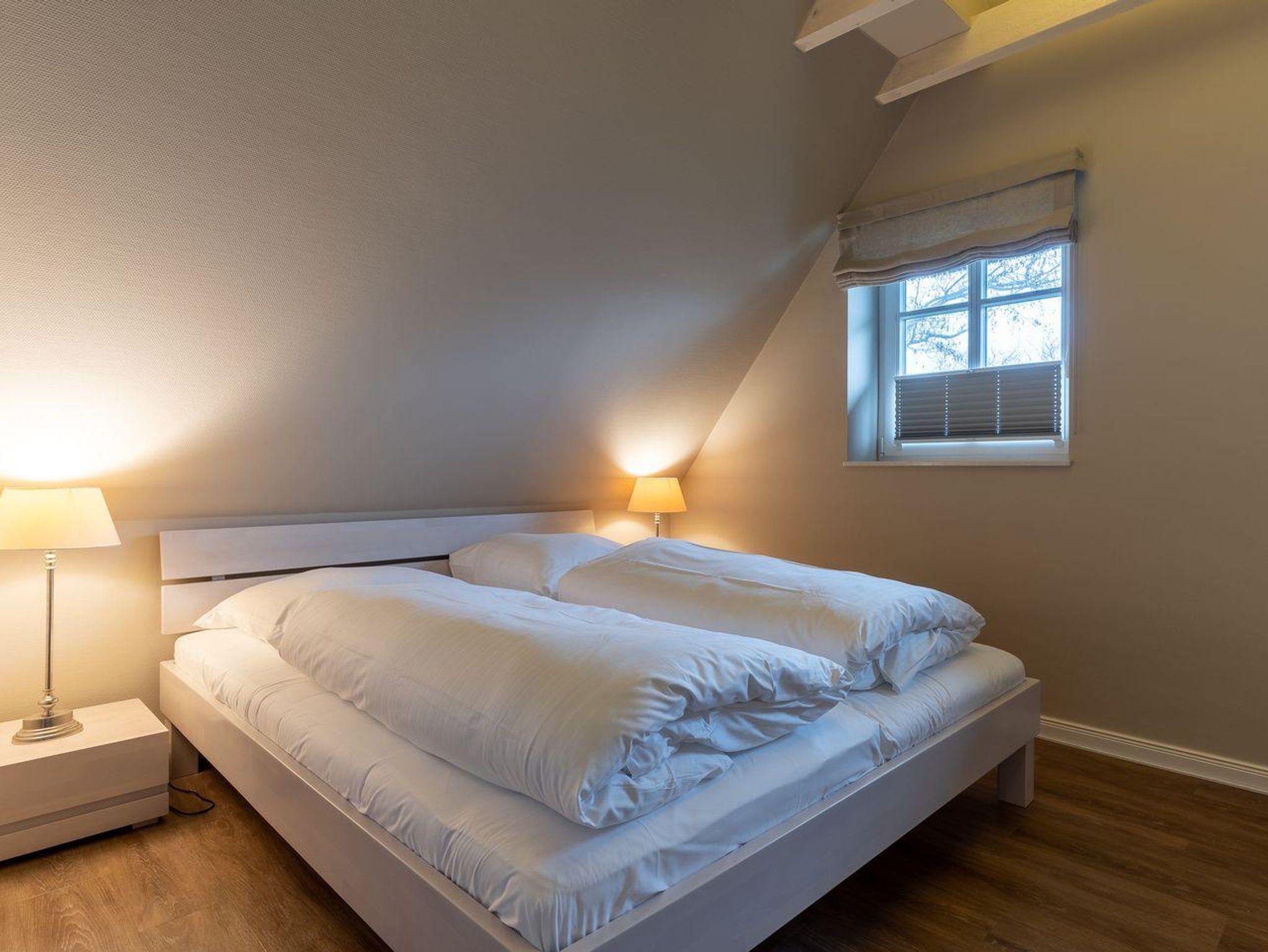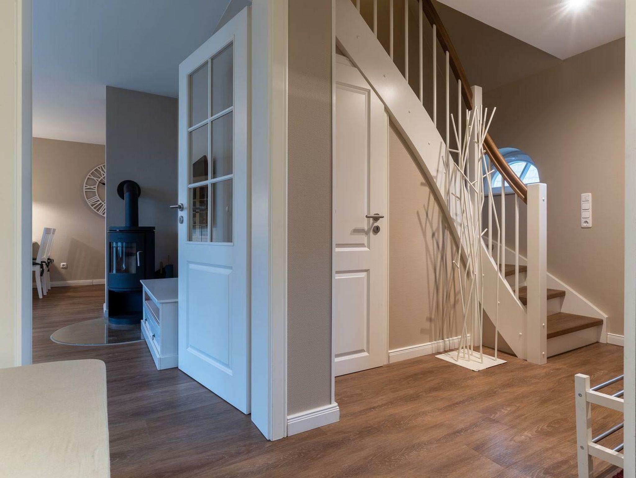 Im Erdgeschoss befindet sich der Wohnraum mit einer offenen Küche und einem gemütlichen Essbereich. Die Küche ist voll ausgestattet mit hochwertigen Geräten. Im Erdgeschoss ist ebenso ein großer Flur mit Garderobe, ein Duschbad und ein Chill-Out-Room mit TV. Wunderbarer Rückzugsort zum Lesen, TV schauen, Spielen oder Chillen. Das Sofa kann zu einem gemütlichen Schlafbett für 2 Personen umgebaut werden. Über eine Holztreppe im Flur gelangt man in das Obergeschoss mit zwei Schlafzimmern. Eines verfügt über ein 180er Bett mit TV und das andere über 2 x 90er Einzelbetten mit hochwertigen Matratzen (diese können auch zusammengeschoben werden). Außerdem ist im Obergeschoss ein Bad mit Badewanne. Beide Bäder verfügen über ein Fenster.