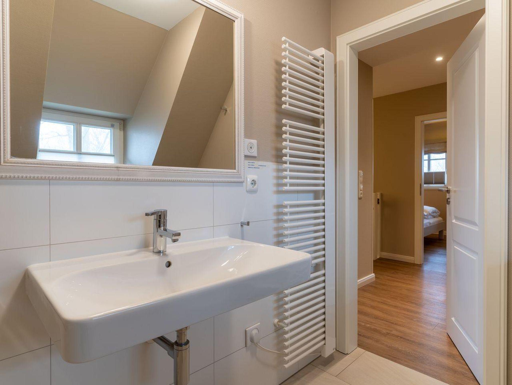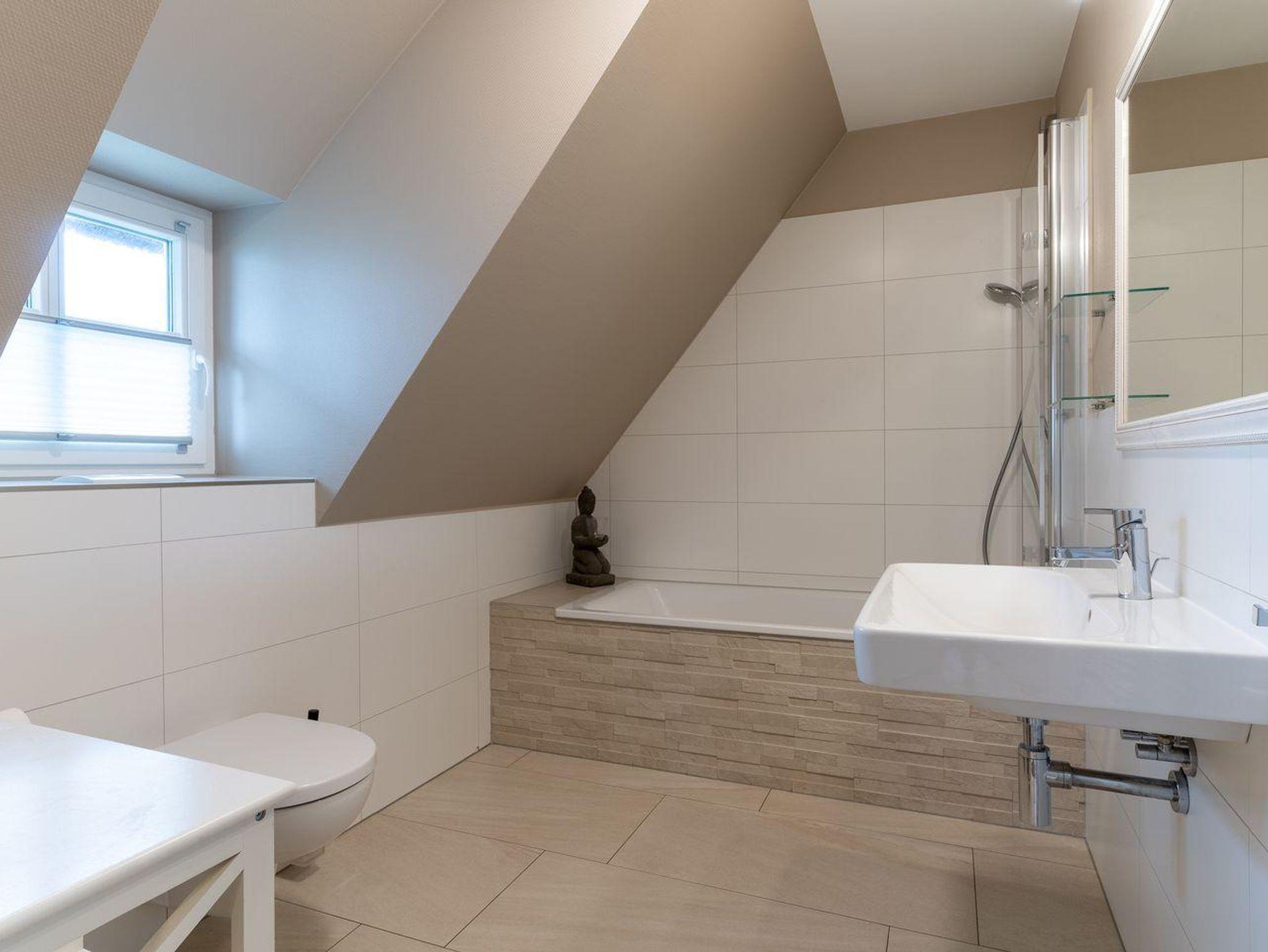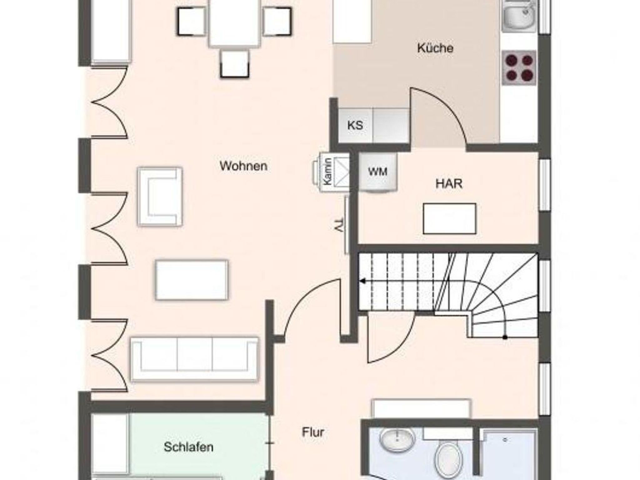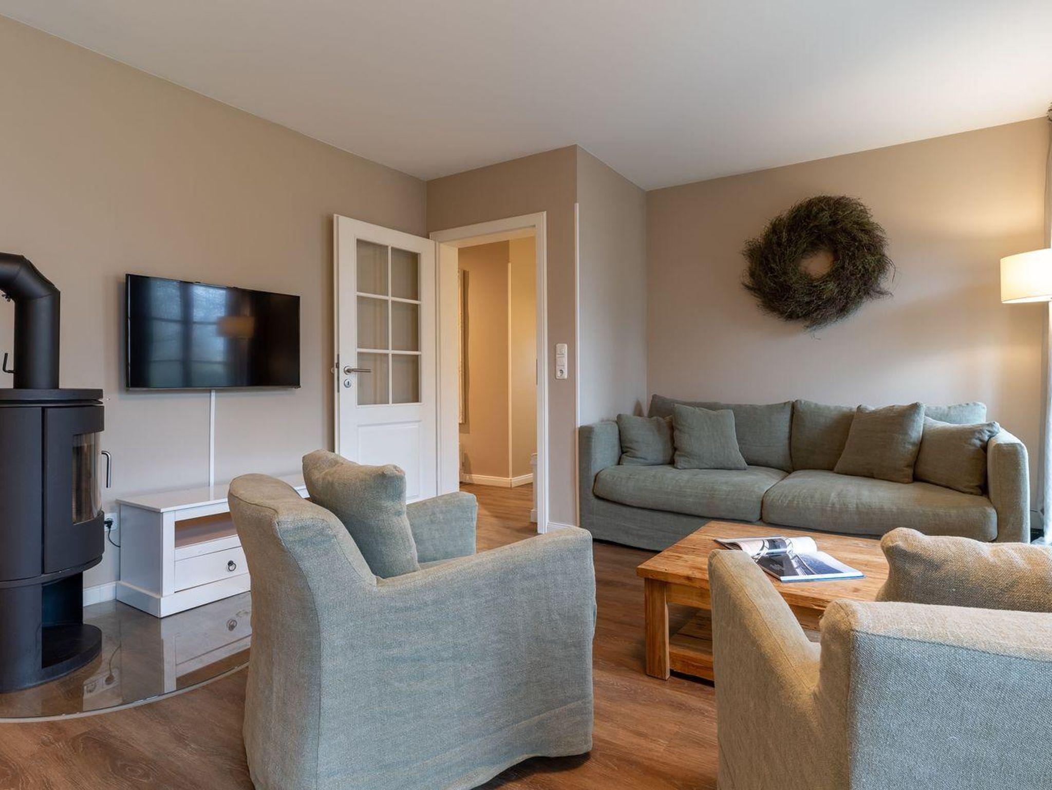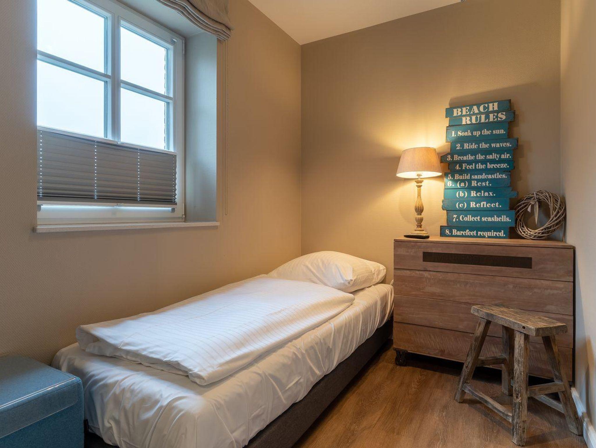 Im Erdgeschoss befindet sich der Wohnraum mit einer offenen Küche und einem gemütlichen Essbereich. Die Küche ist voll ausgestattet mit hochwertigen Geräten. Im Erdgeschoss ist ebenso ein großer Flur mit Garderobe, ein Duschbad und ein Chill-Out-Room mit TV. Wunderbarer Rückzugsort zum Lesen, TV schauen, Spielen oder Chillen. Das Sofa kann zu einem gemütlichen Schlafbett für 2 Personen umgebaut werden. Über eine Holztreppe im Flur gelangt man in das Obergeschoss mit zwei Schlafzimmern. Eines verfügt über ein 180er Bett mit TV und das andere über 2 x 90er Einzelbetten mit hochwertigen Matratzen (diese können auch zusammengeschoben werden). Außerdem ist im Obergeschoss ein Bad mit Badewanne. Beide Bäder verfügen über ein Fenster.