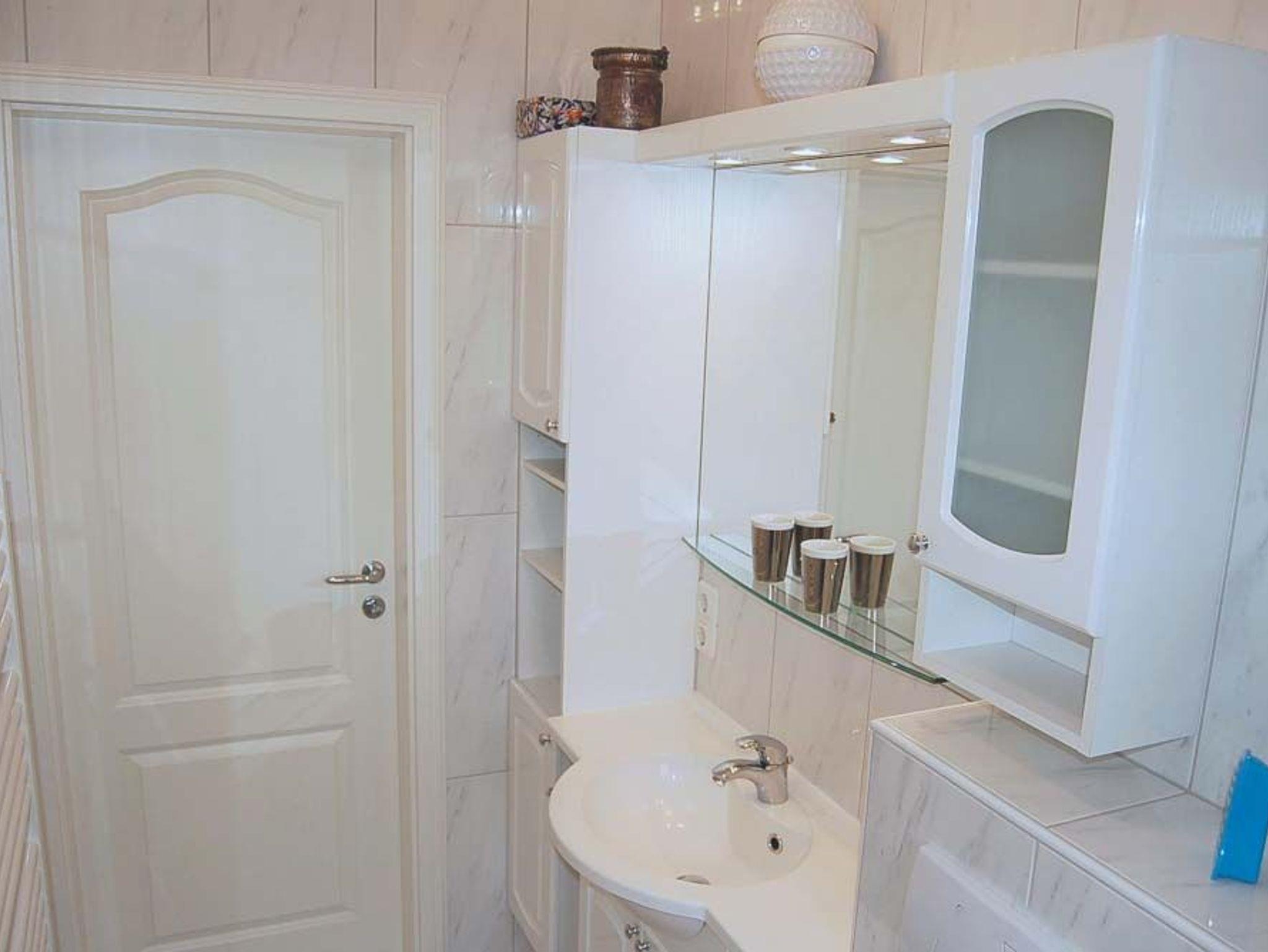 Bad: Dusche, Duschkabine, Fön, Schrank, Spiegel, Waschtisch, WC