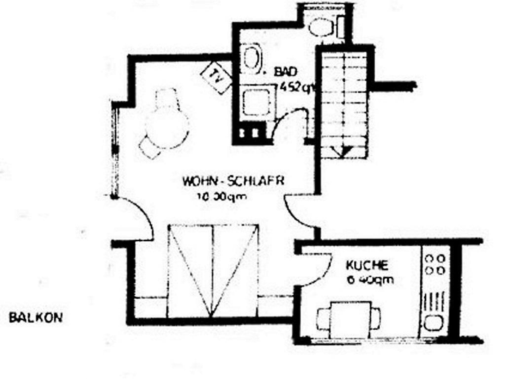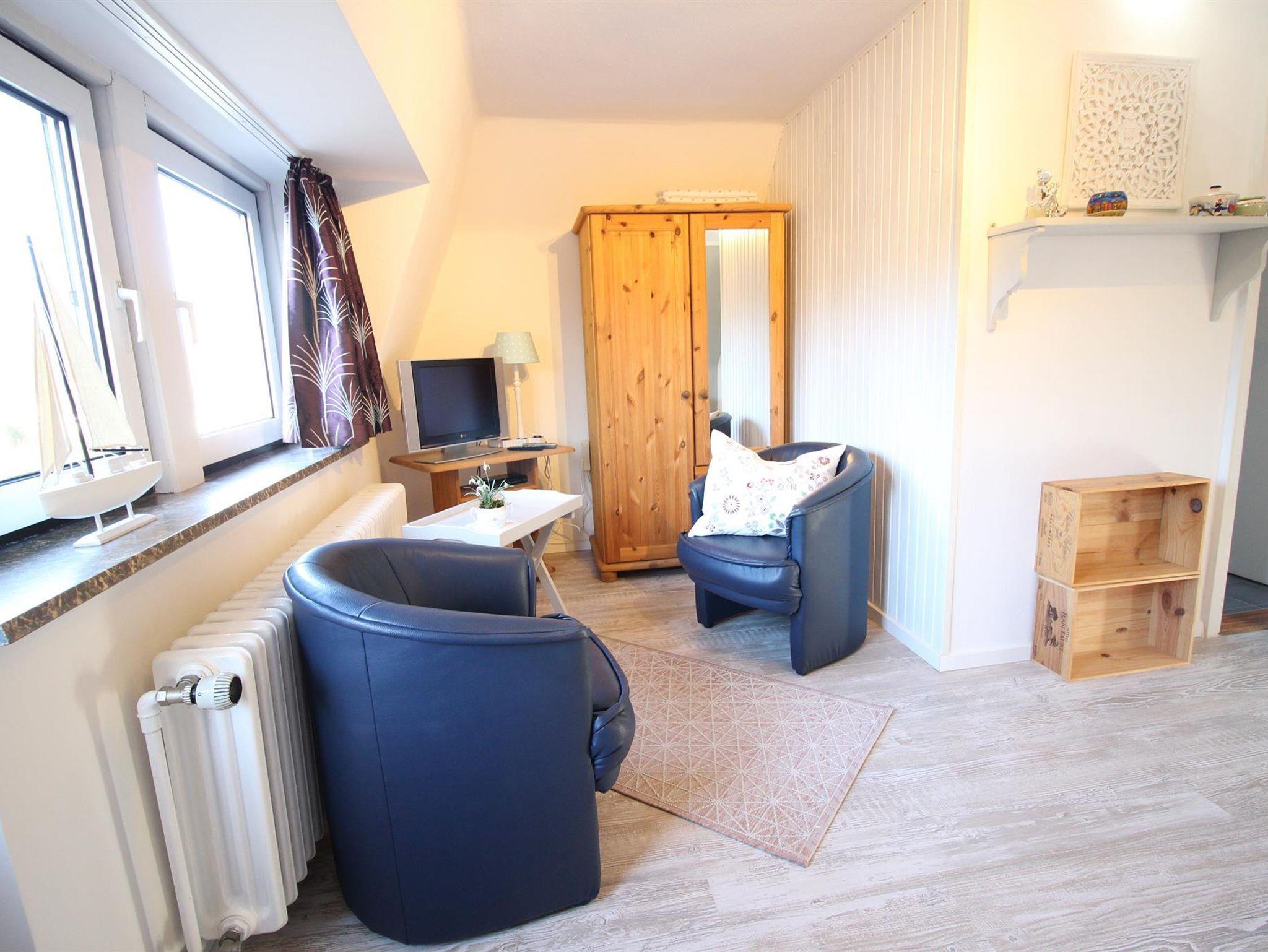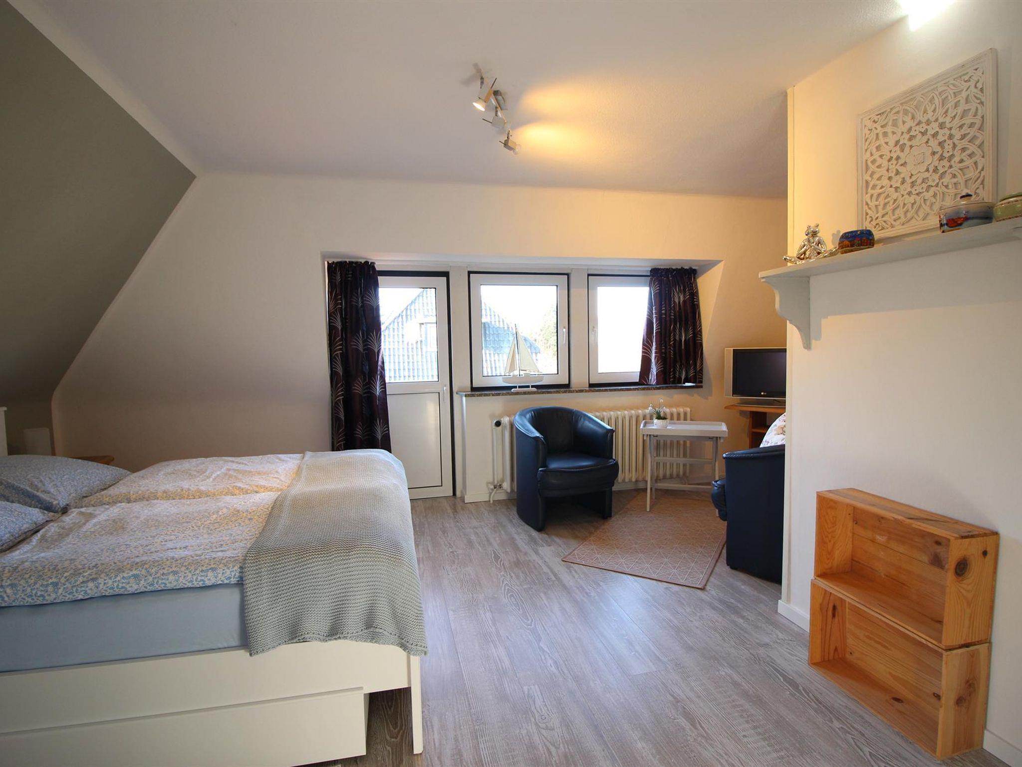 1 Wohnschlafraum mit französischem Bett und Sitzecke, integrierter Einbauküche mit Eßecke, SAT-Farb-TV und Radio. Dusche/WC. Großer Balkon mit Strandkorb. Nichtraucherwohnung.