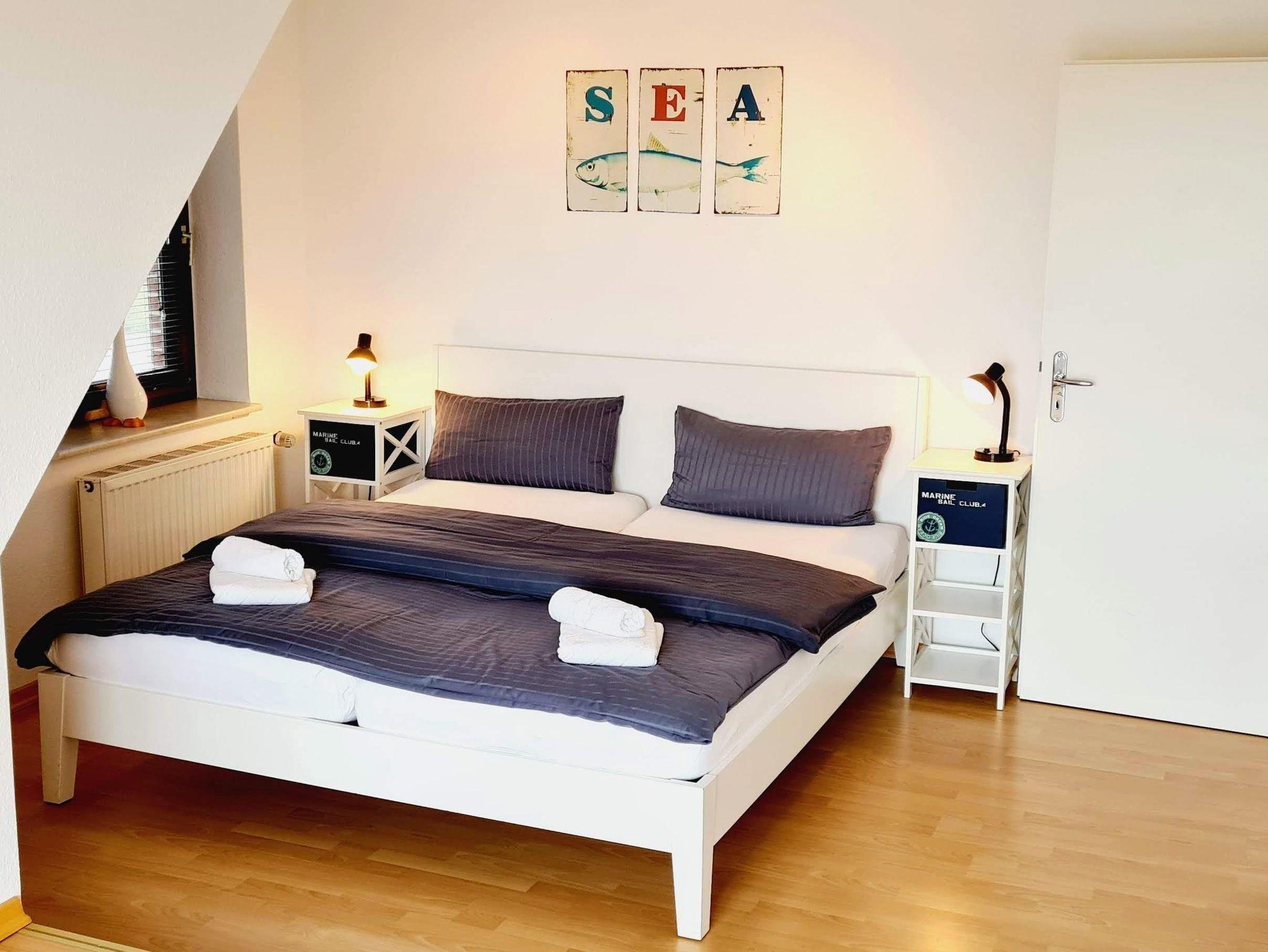 Die gemütliche und stilvoll eingerichtete Ferienwohnung verfügt über 64 m² Wohnfläche und liegt im Obergeschoß. Großzügiger Wohnraum mit angrenzender offener Küche. 2 Schlafzimmer mit je einem Doppelbett, Dusche/WC, Balkon, Garten. WLAN vorhanden