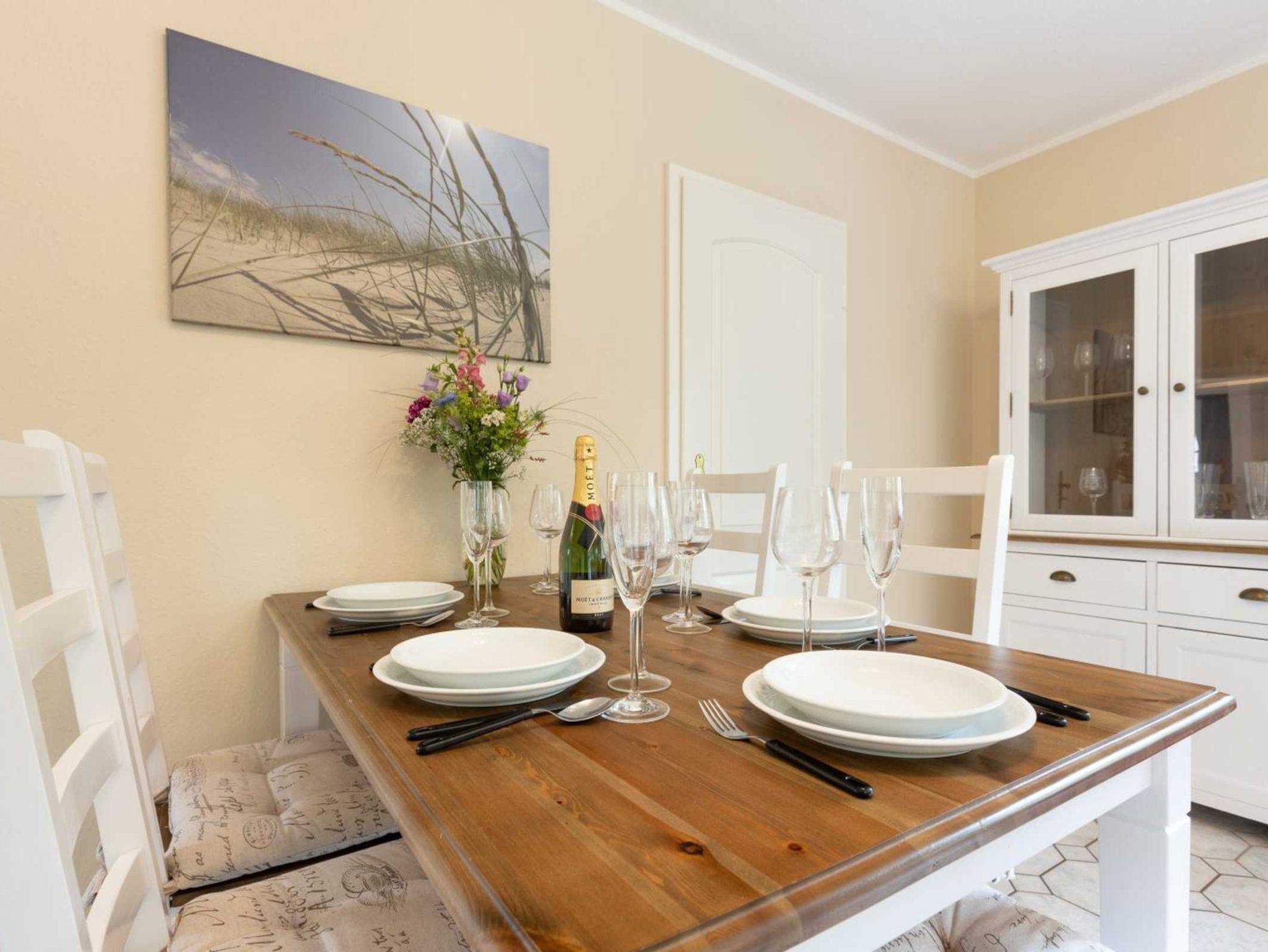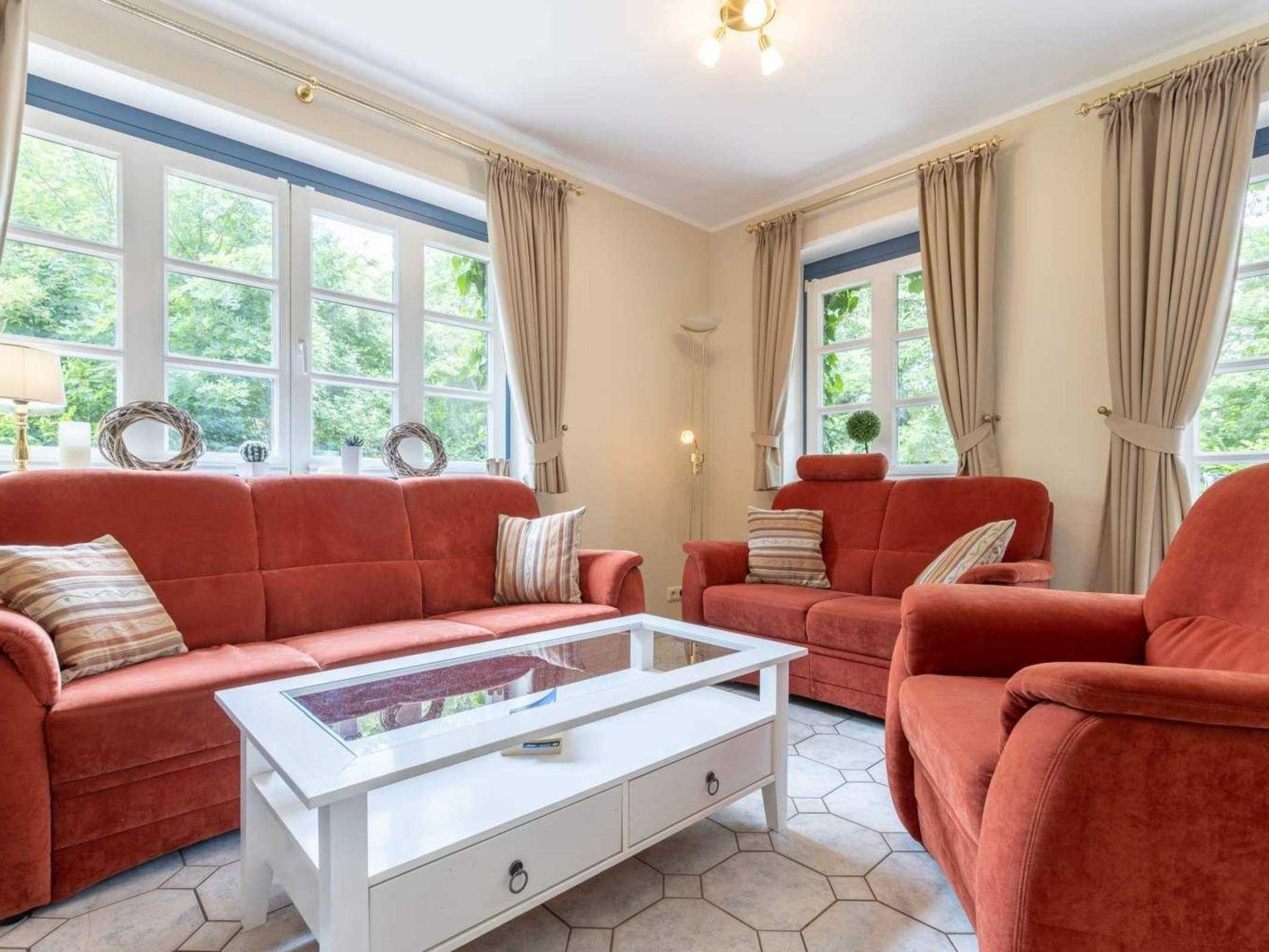 Wohnzimmer mit 2 Sofas (3er und 2er), Sessel, TV (Kabel) und Esstisch mit 5 Stühlen. Direkter Zugang zur schönen möblierten Terrasse nach Westen mit Strandkorb.