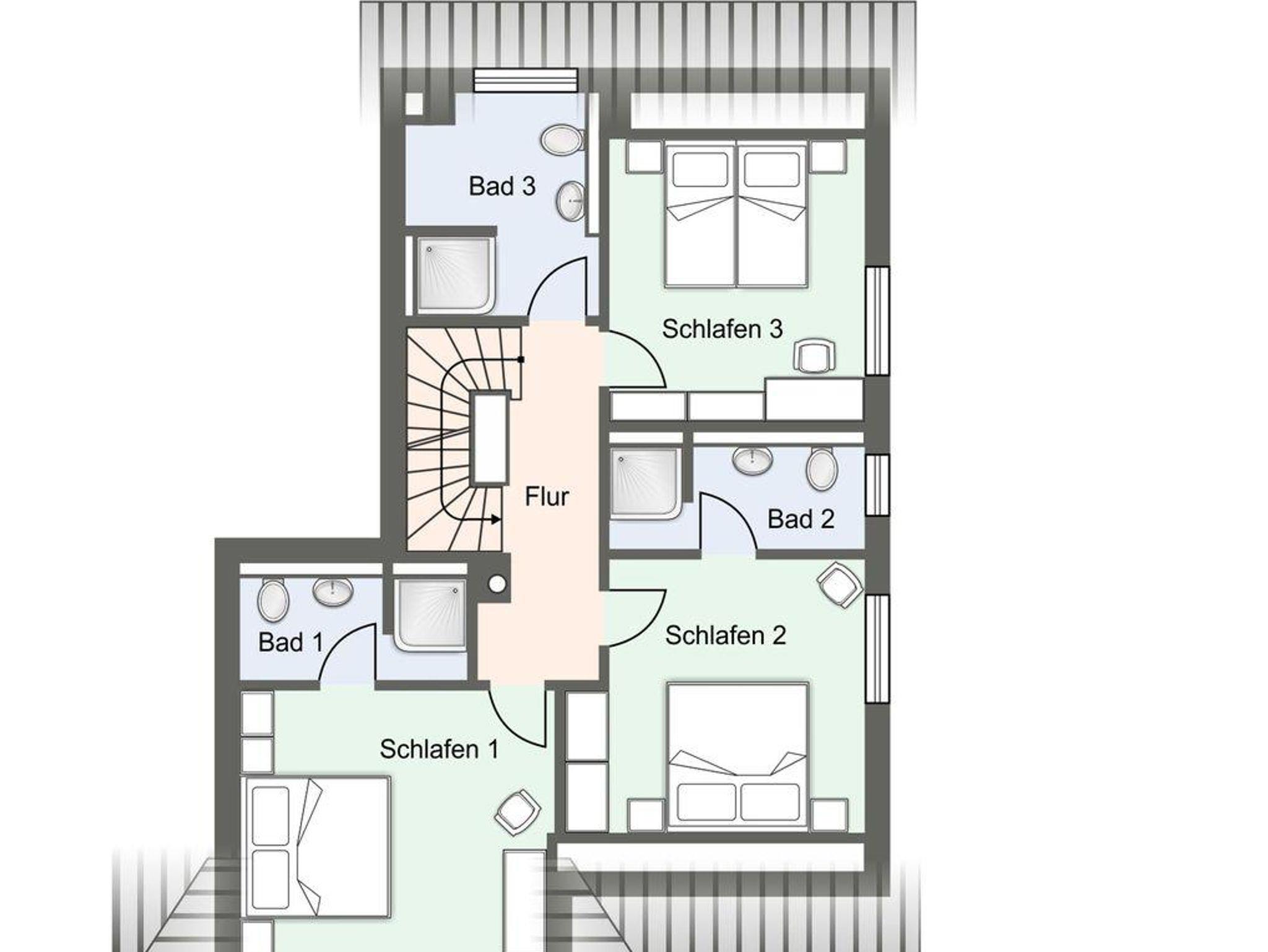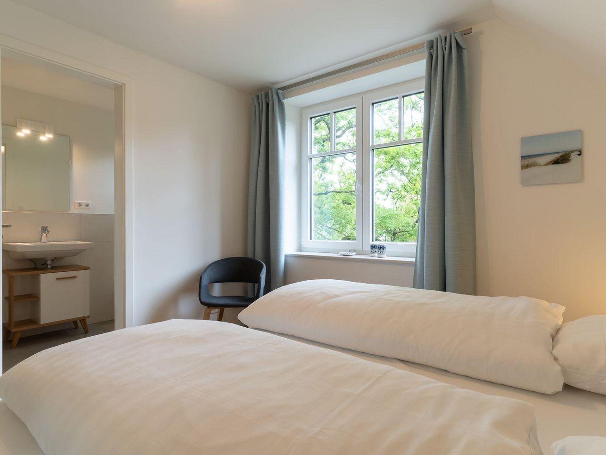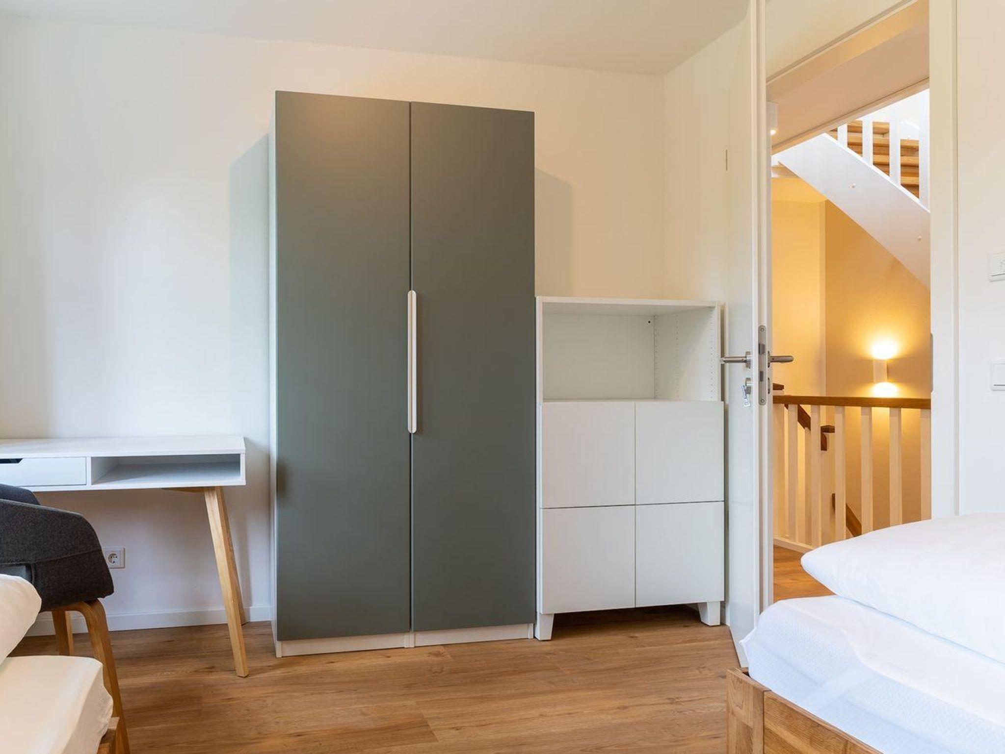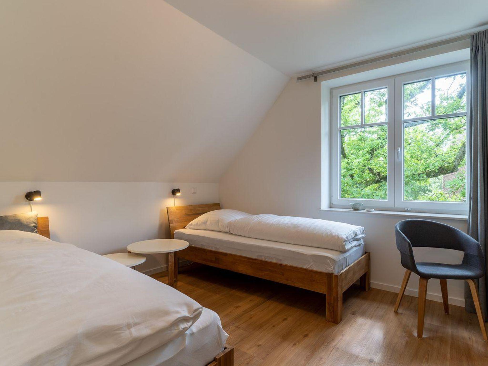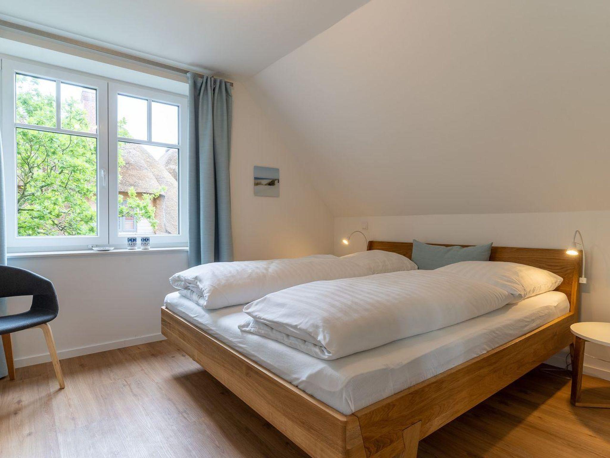 Über eine offene Treppe gelangt man in das mit Parkett ausgelegte Obergeschoss. Die drei Schlafzimmer, jeweils mit einem Doppelbett, sorgen für ruhevolle Erholung. Darüber hinaus befindet sich im Obergeschoss ein weiteres großzügiges Vollbad.