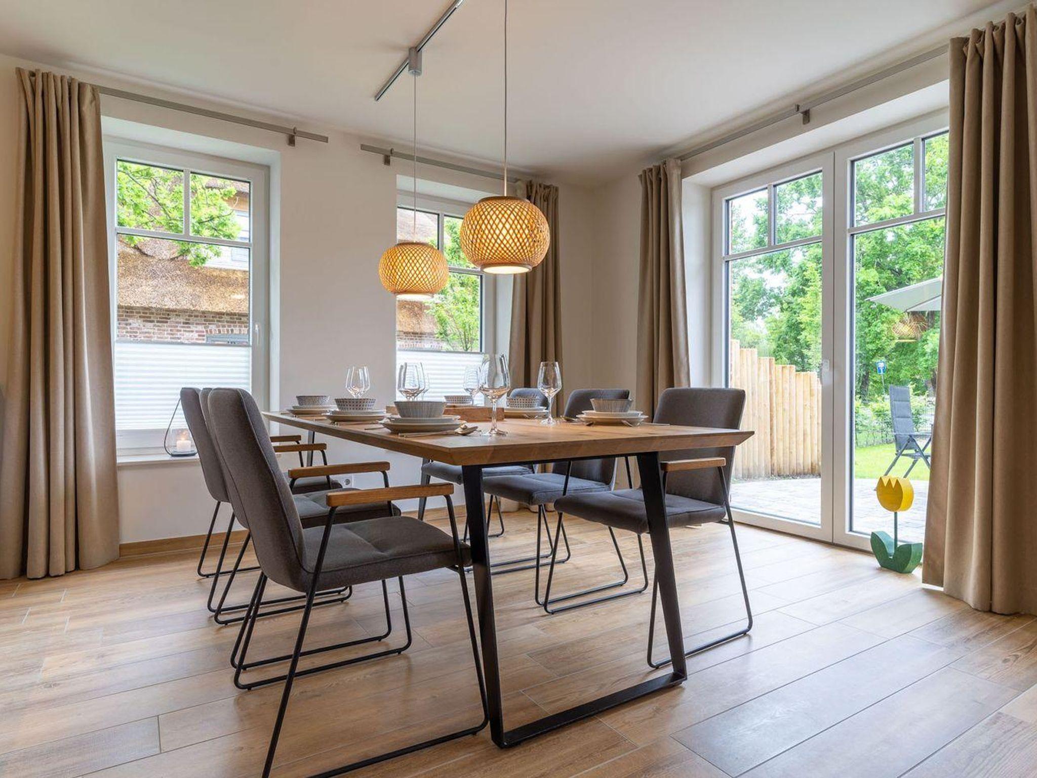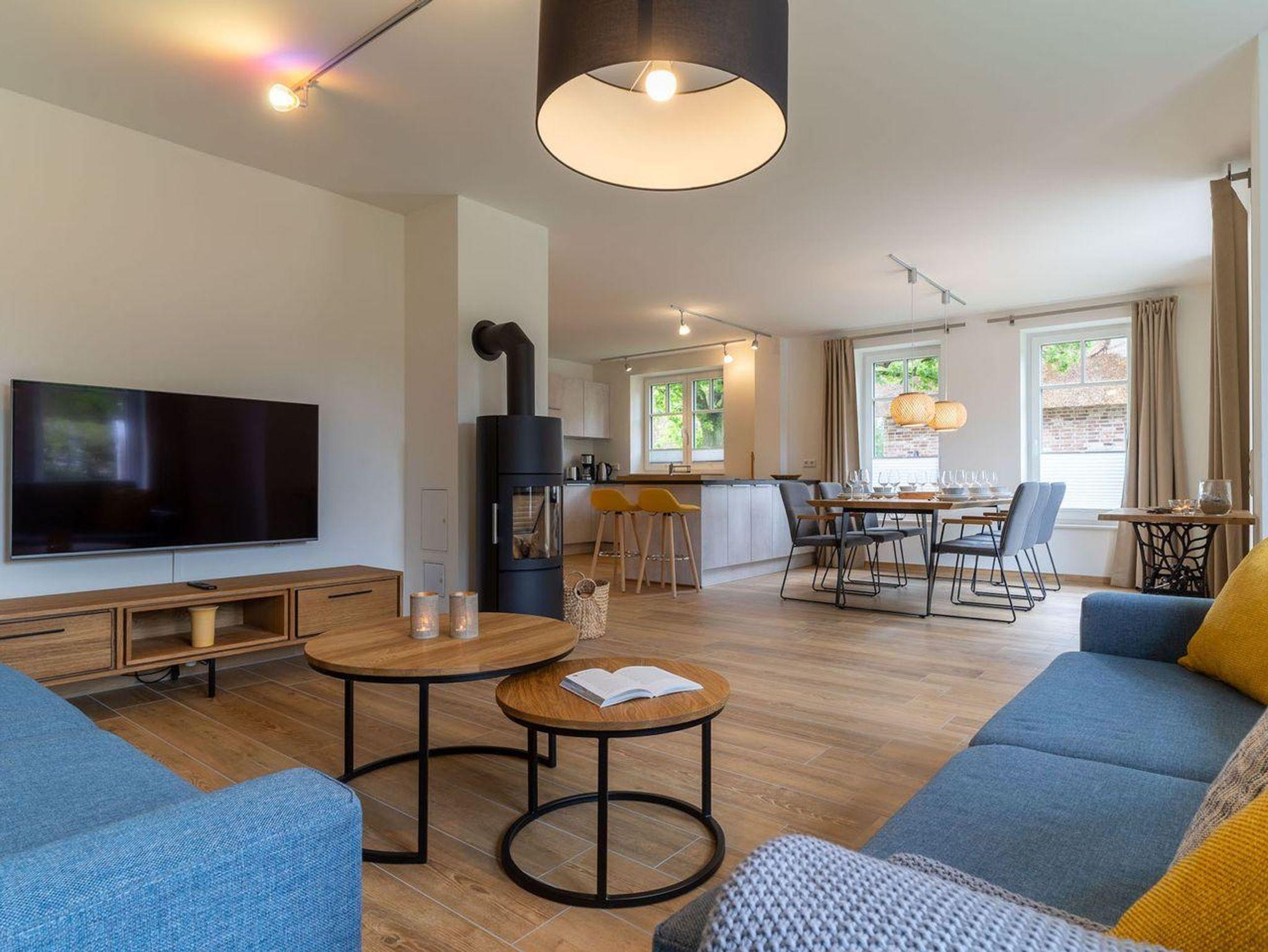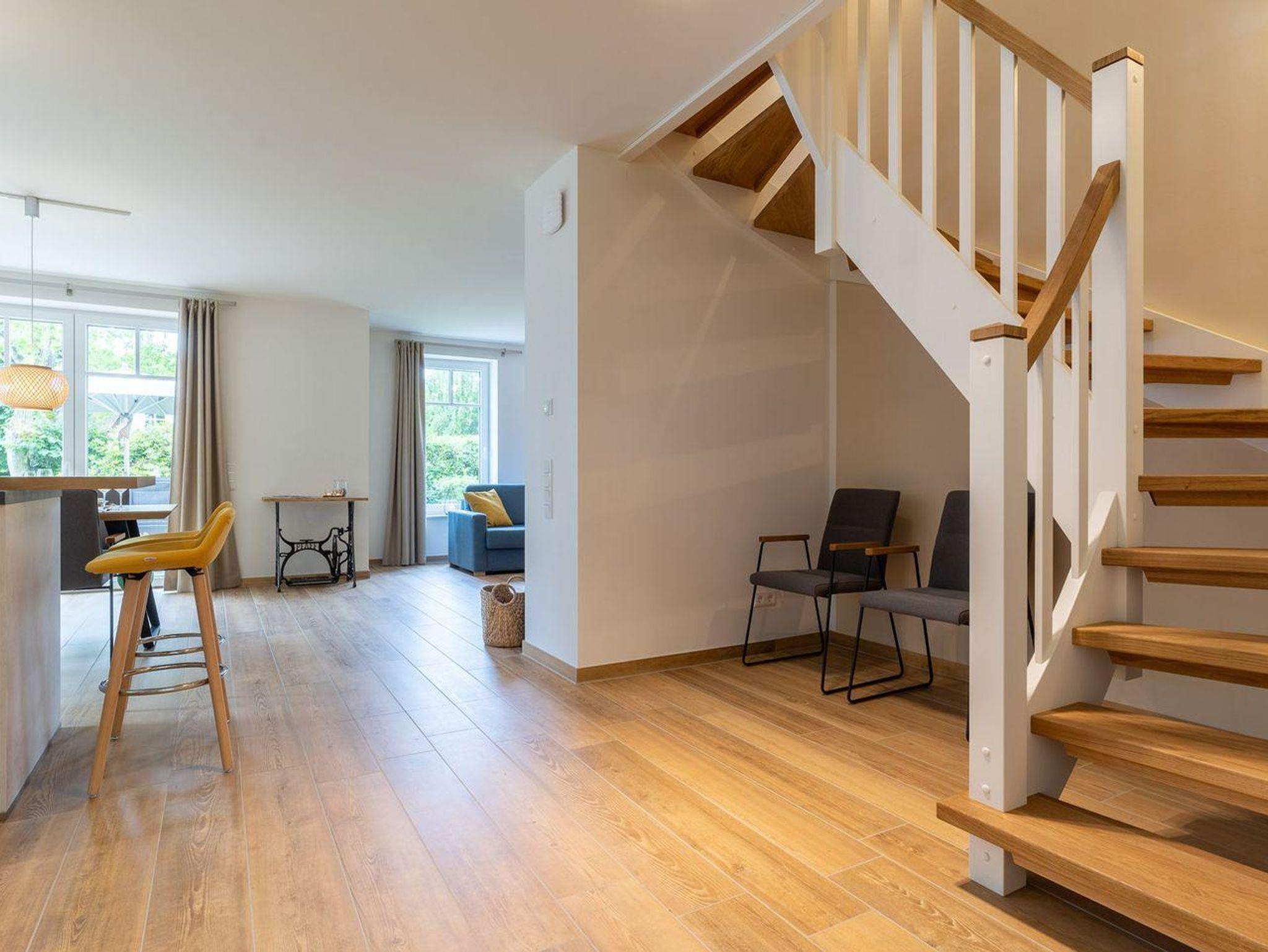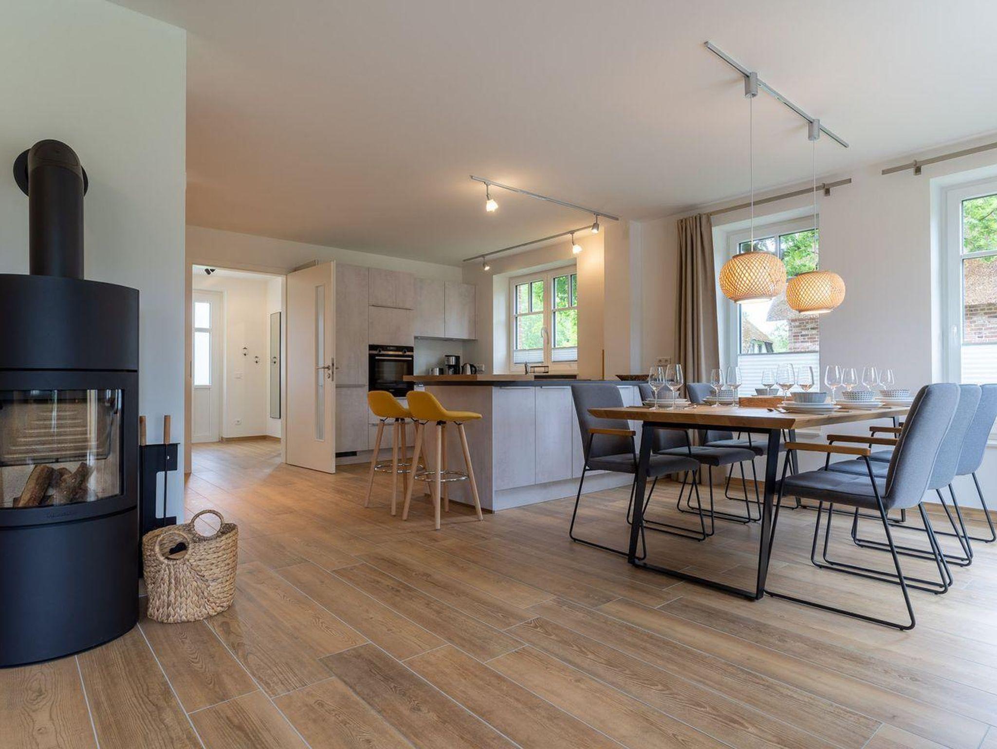 Dieses wunderschöne Einzelhaus verfügt über ca. 120 m² Wohnfläche und bietet großzügigen Platz für 6 Personen. Im Erdgeschoss befindet sich der lichtdurchflutete Wohnraum mit TV, Kamin, einer großzügigen Sitzecke und einem wunderschönen Erker zum Chillen. Die offene Wohnküche verfügt über hochwertige Geräte und ist voll ausgestattet für gemeinsames Kochen. Die Wohnräume sind mit exklusiven Möbeln eingerichtet. An den Wohnbereich schließen sich ein Flur, sowie ein großzügiger Hauswirtschaftsraum. Ebenso ist im Erdgeschoss ein Gästebad mit Dusche. Das gesamte Erdgeschoss verfügt über geschmackvolle Fußbodenfliesen und hochwertiges Parkett.