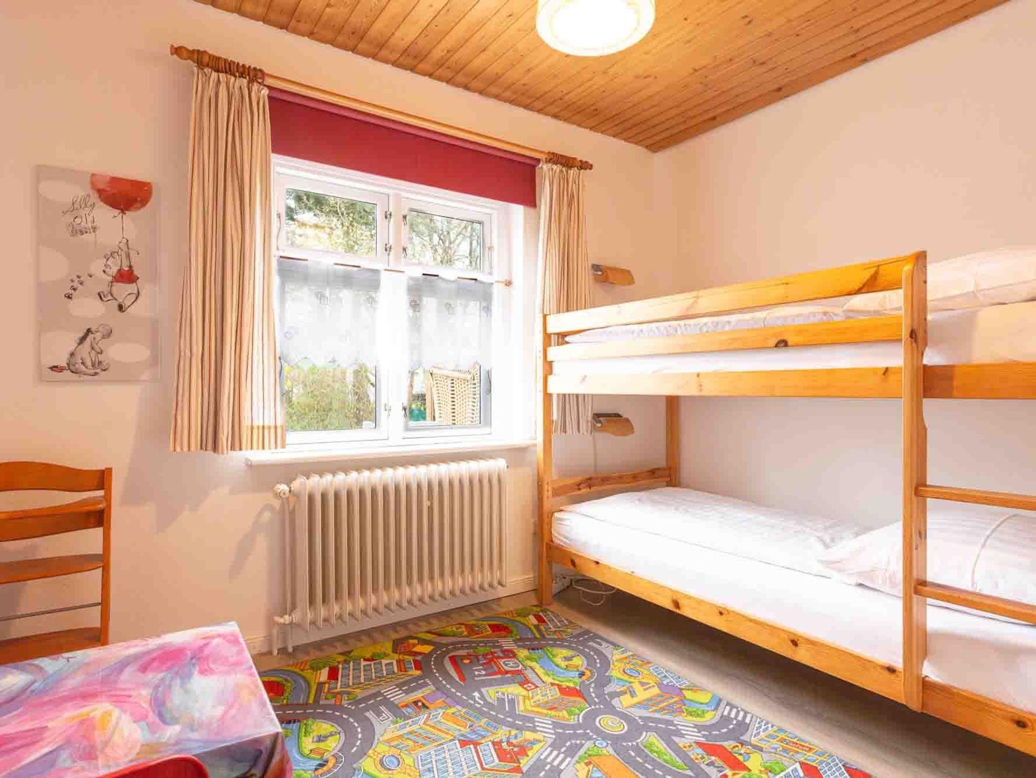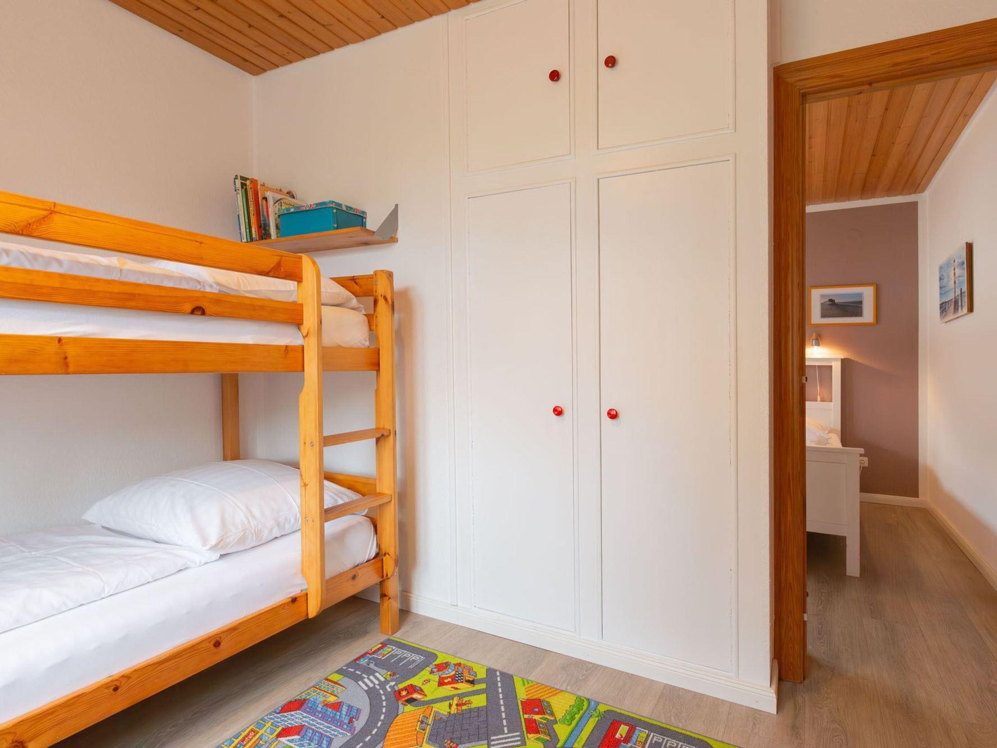 3. Schlafzimmer mit 2 Etagen-Einzelbetten (je 90x190cm), Einbauschrank, Spielteppich und kleinem Tisch mit 2 Stühlen.