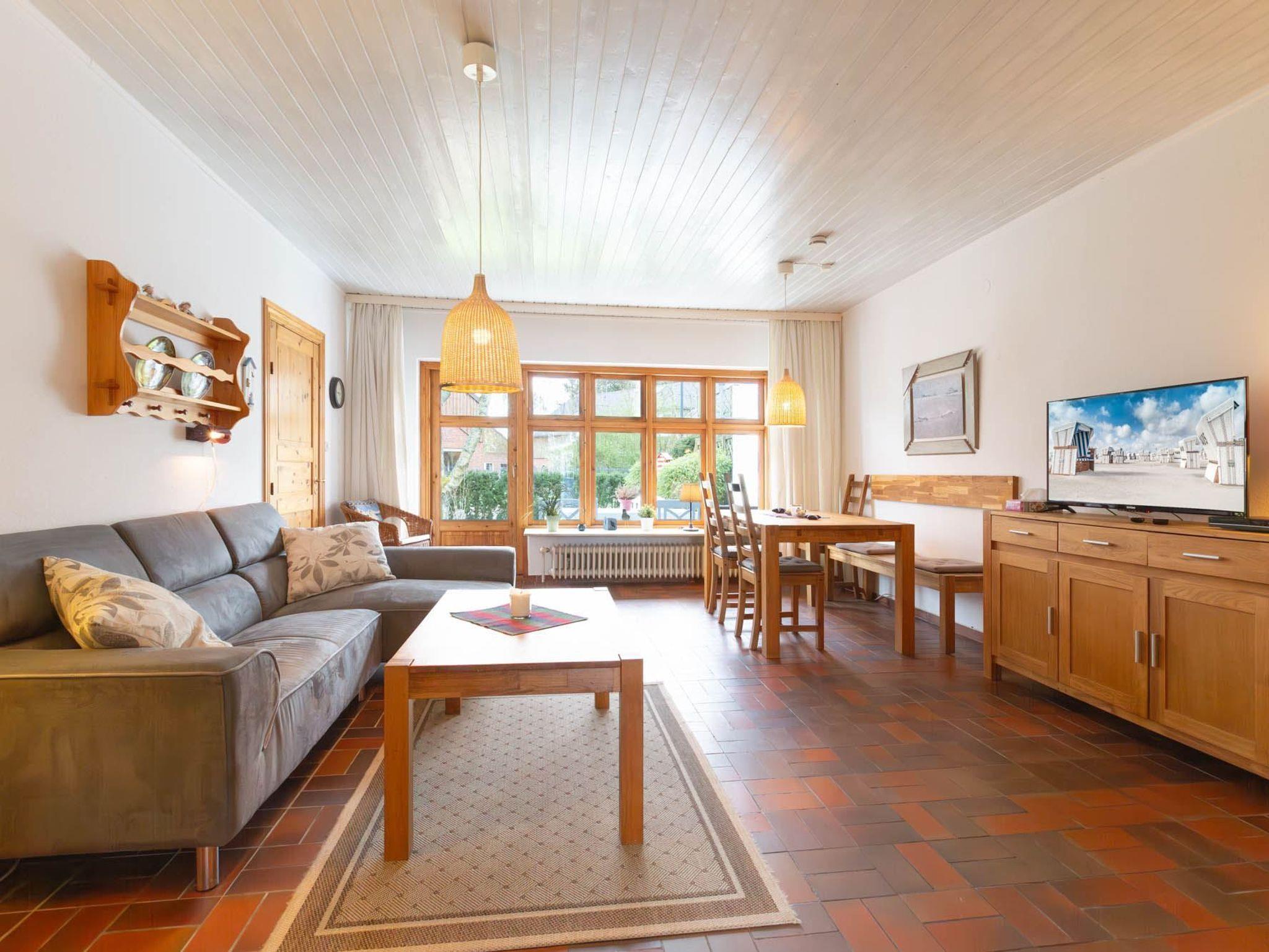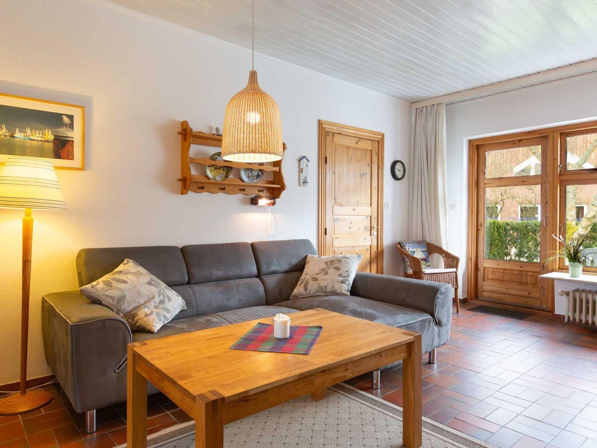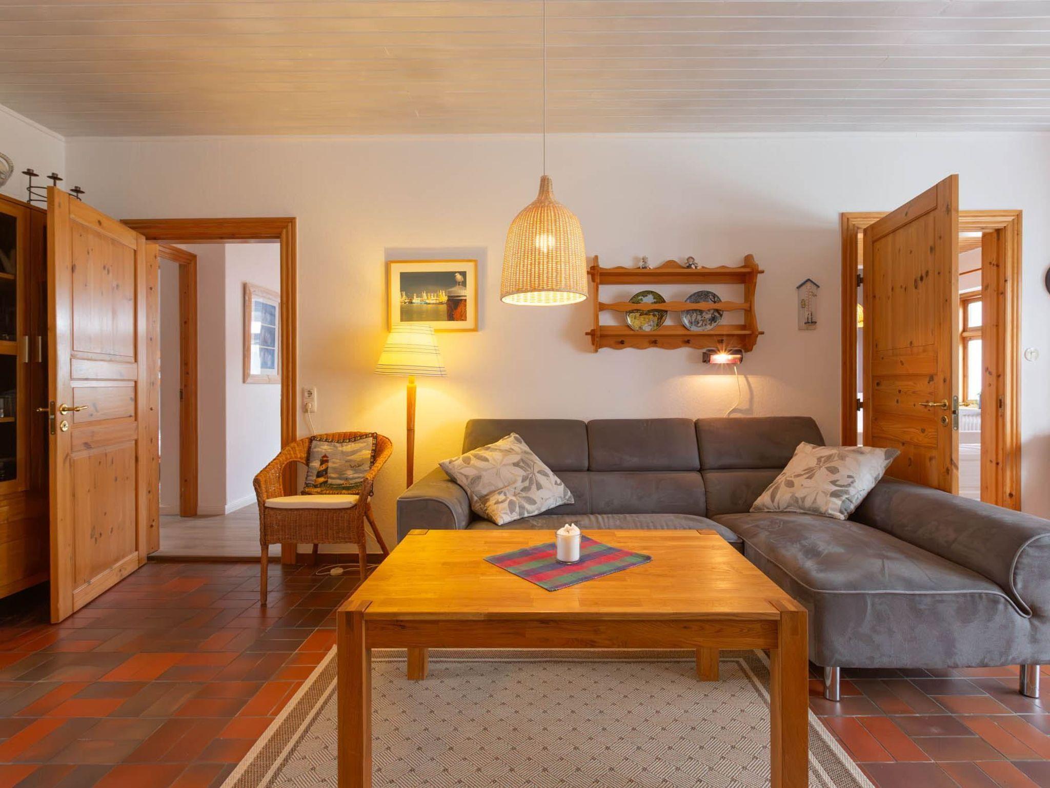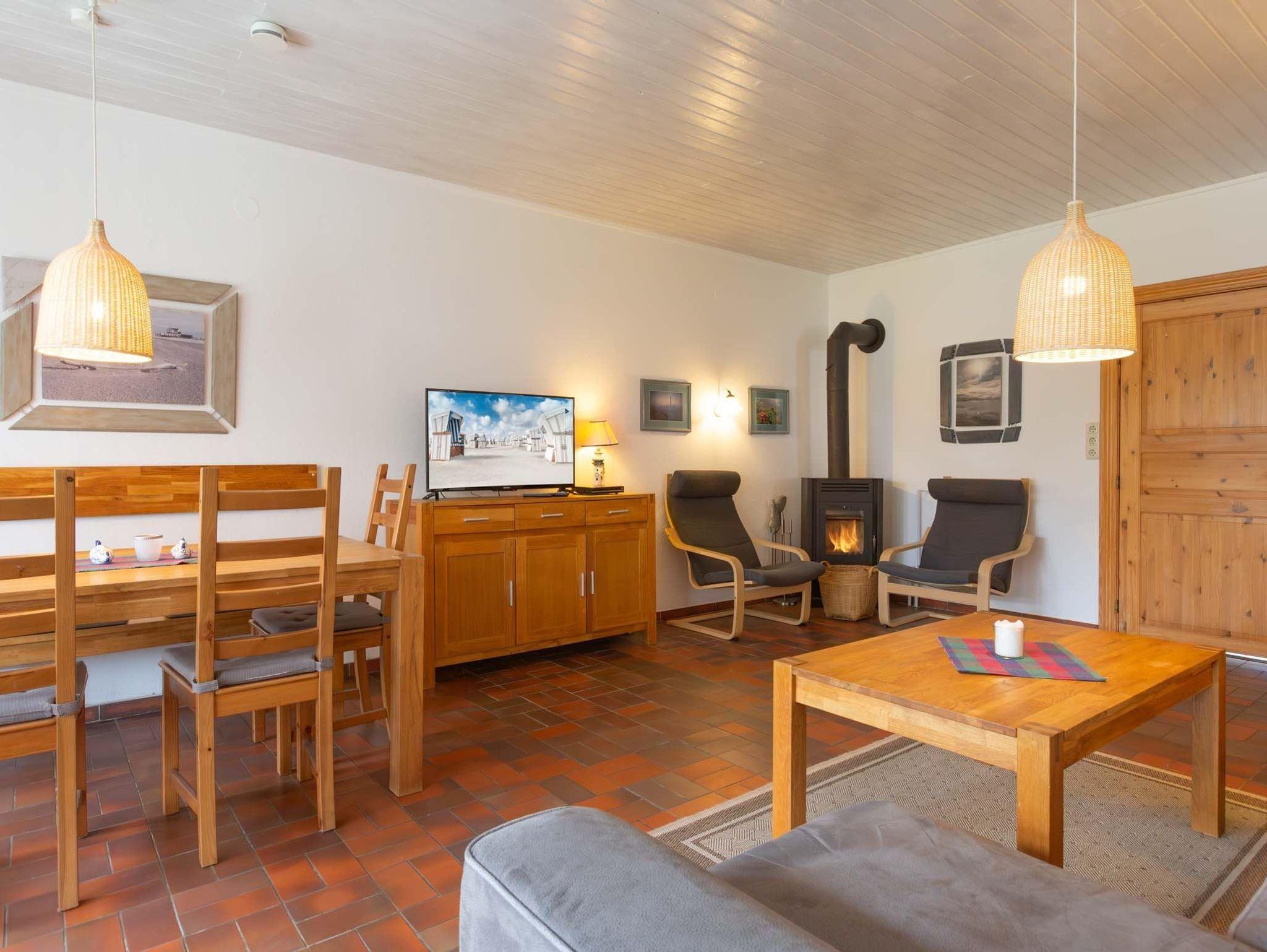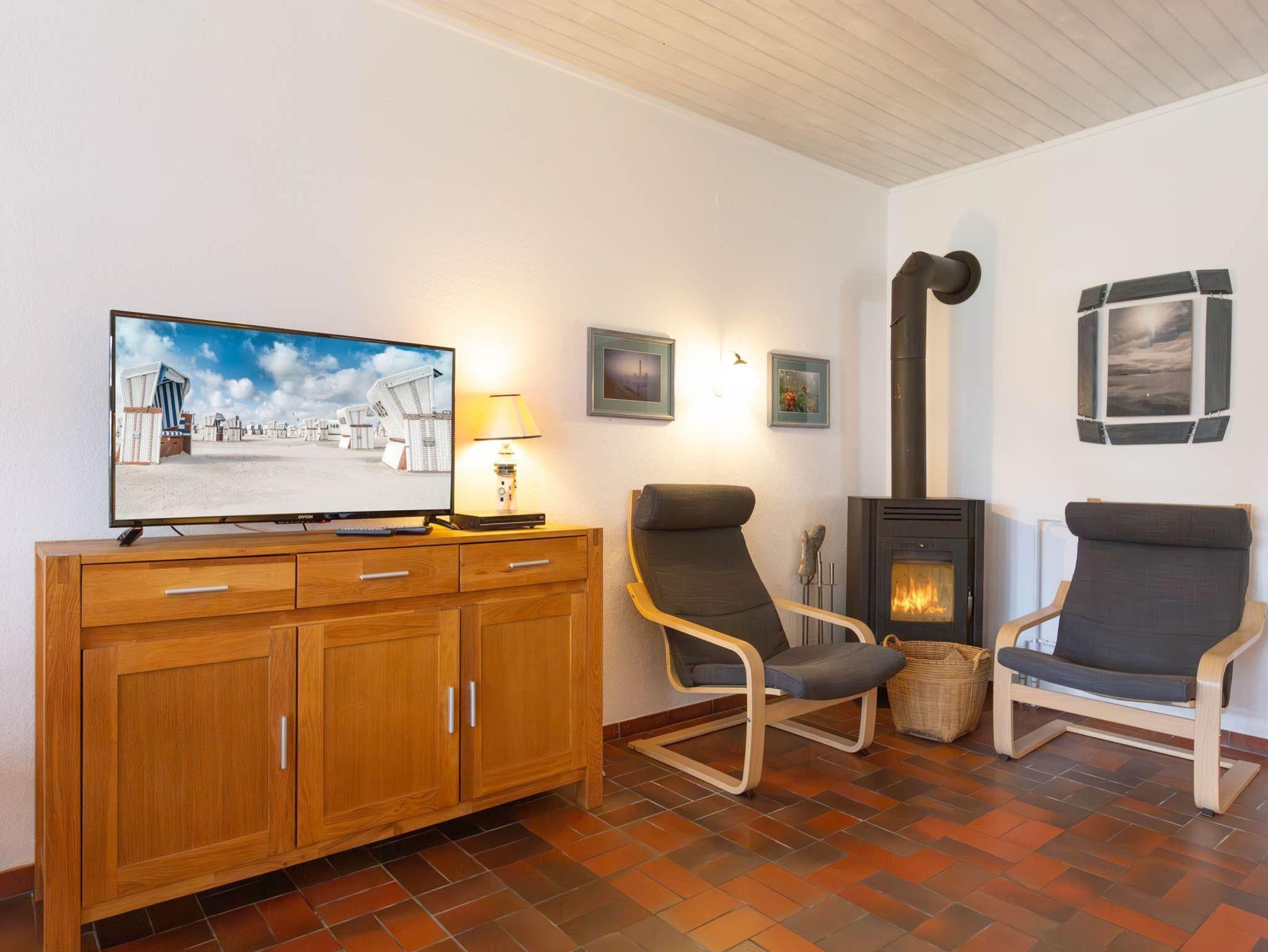 Wohnzimmer mit Sofa mit Ottomane für 2-3 Personen, 2 Sesseln, SMART-TV (Sat), DVD-Player, Bluetooth-Soundanlage, behaglichem Kaminofen und Esstisch mit 4 Stühlen und Sitzbank für 2 Personen. Direkter Zugang zur schönen, möblierten Gartenterrasse nach Süden mit Sonnenmarkise und Strandkorb.
