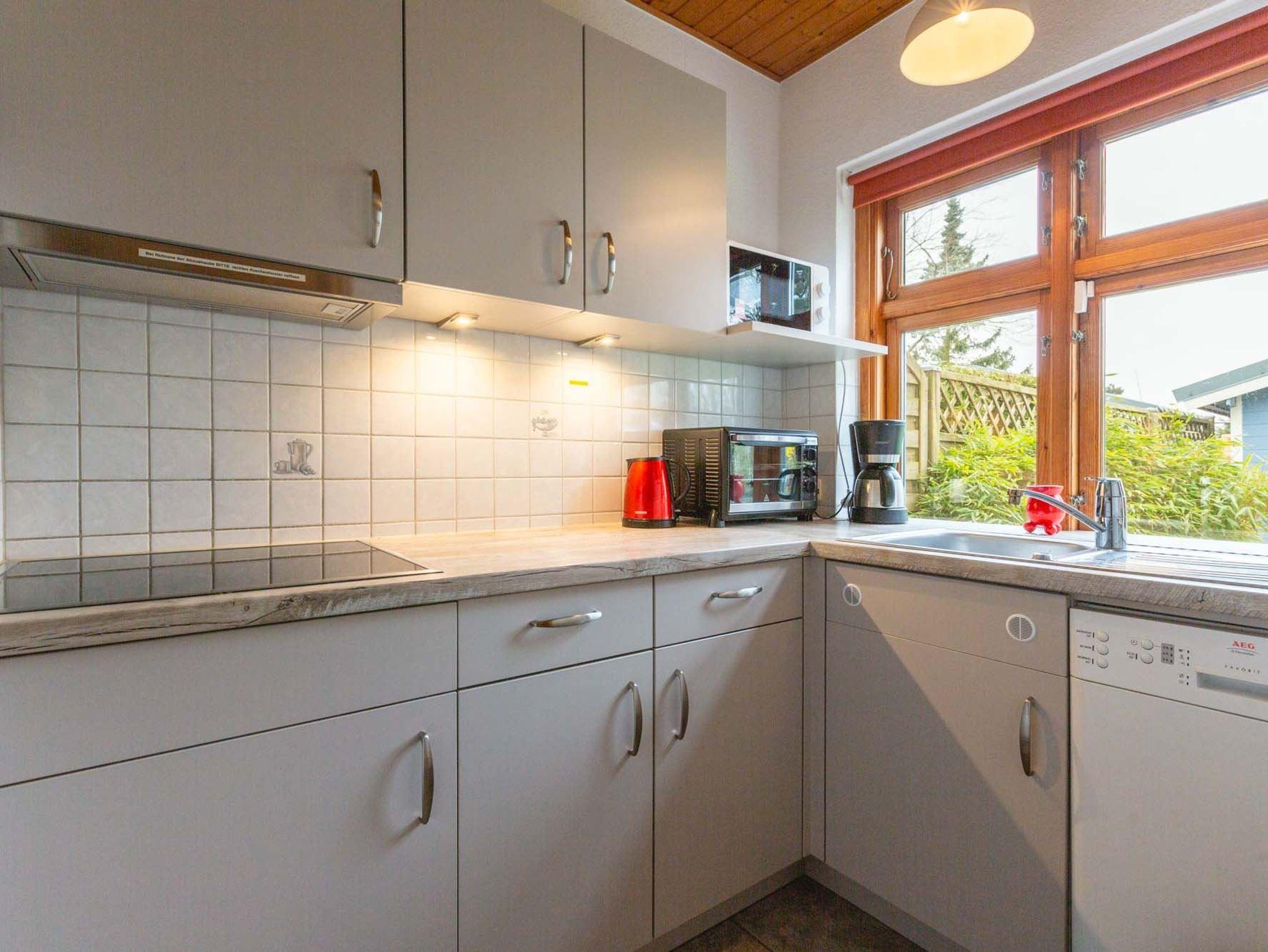 Separate Küche mit Tischbackofen, Mikrowelle mit Grillfunktion, Geschirrspüler und Kühlschrank mit Gefrierfach.