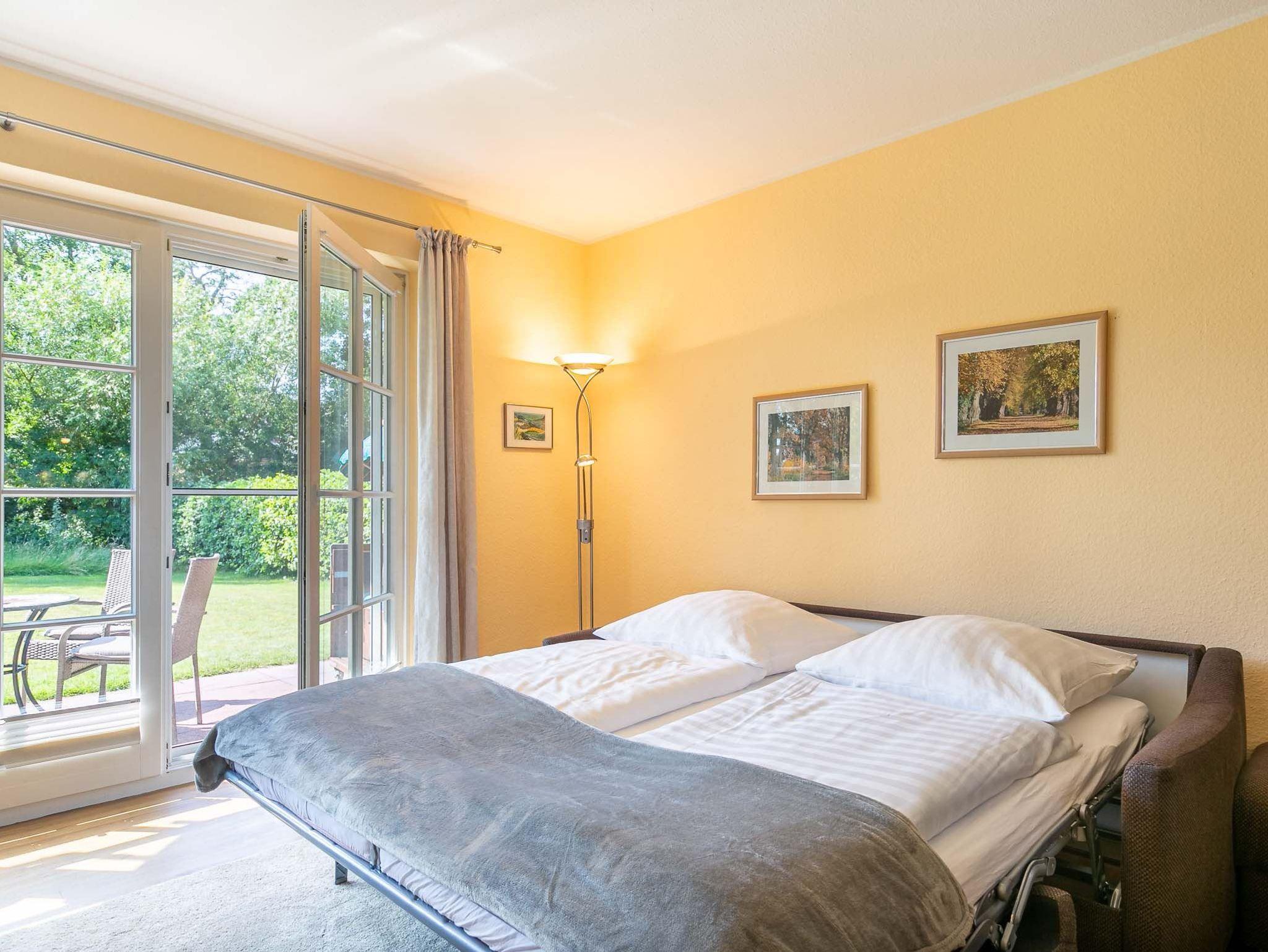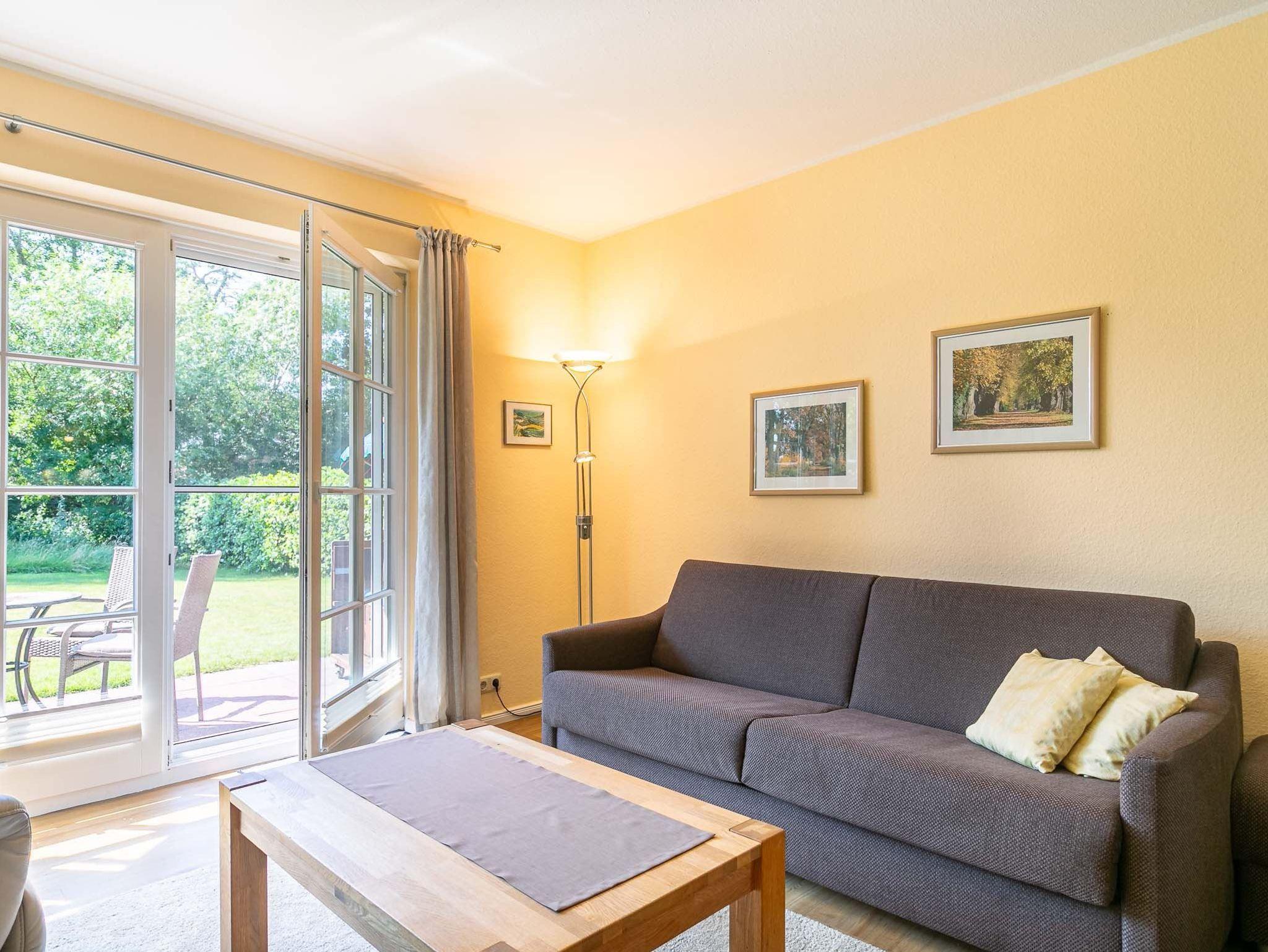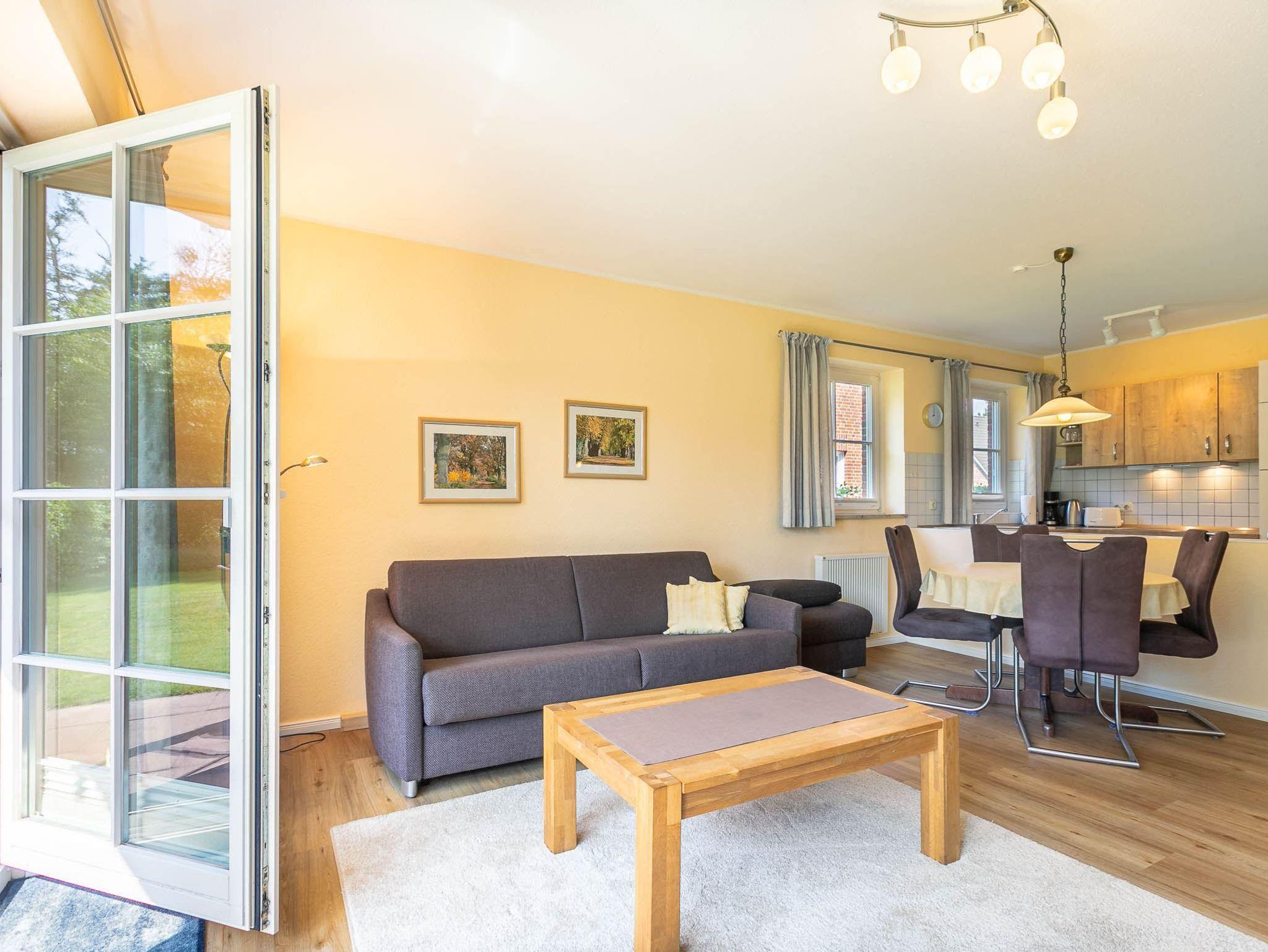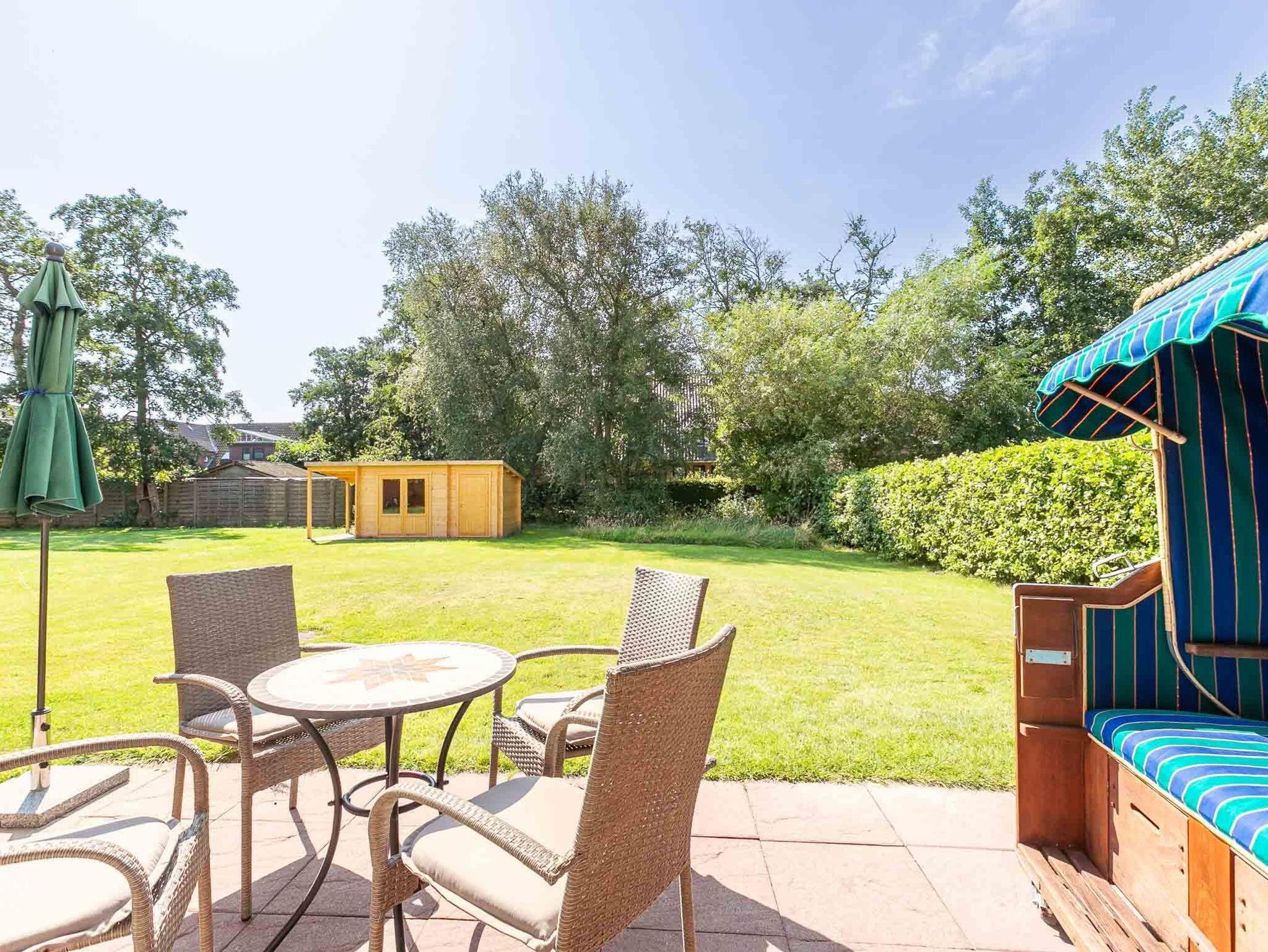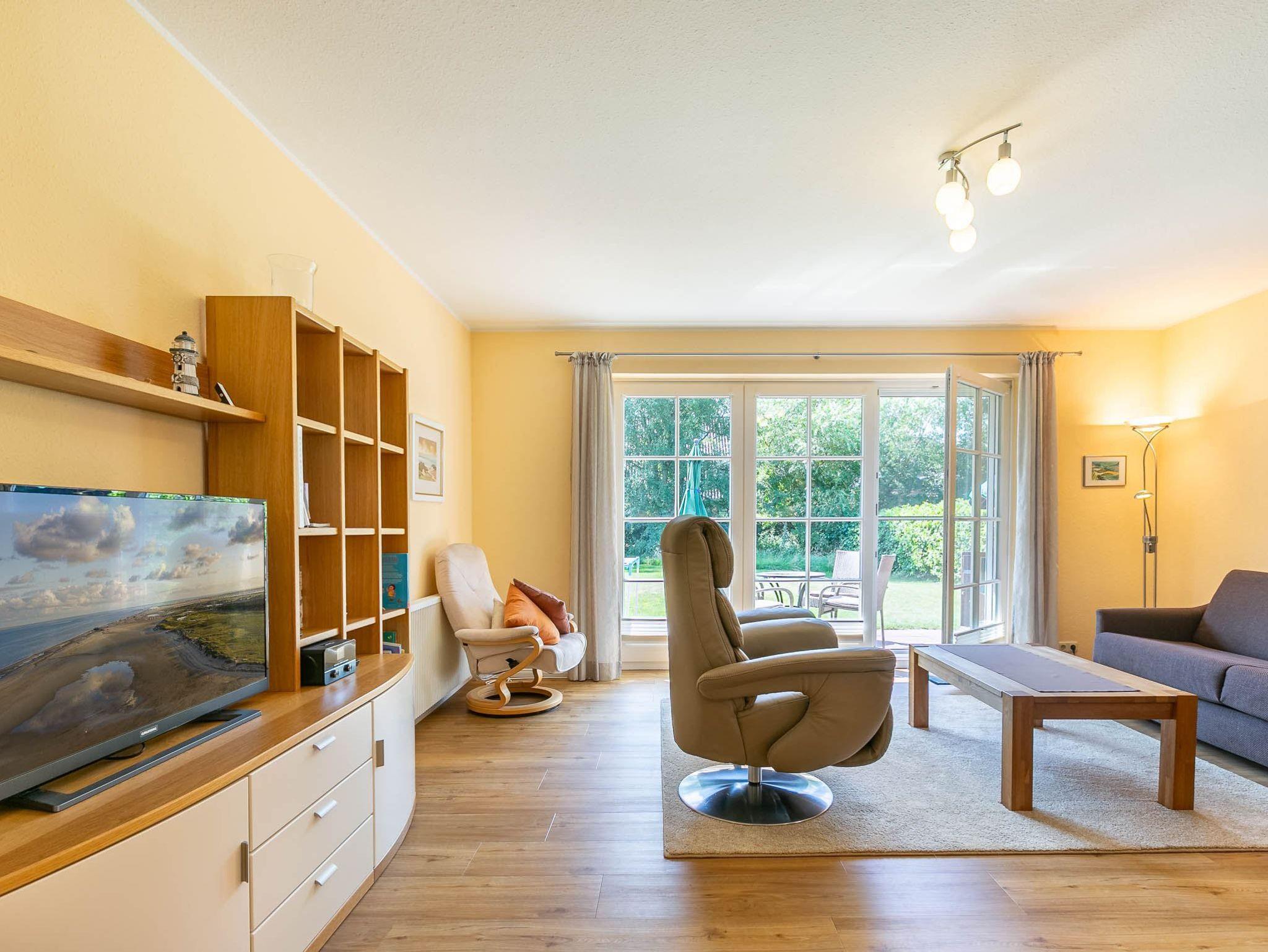 Wohnzimmer mit ausziehbarem Schlafsofa (160x190cm), 2 Sesseln, Hocker, TV (Sat), Radio und Esstisch mit 3 Stühlen. Direkter Zugang zur möblierten Garterrasse nach Süden mit Strandkorb. Offene Küche mit Mikrowellen-Kombigerät mit Backfunktion, Kühlschrank mit Gefrierfach und Geschirrspüler.